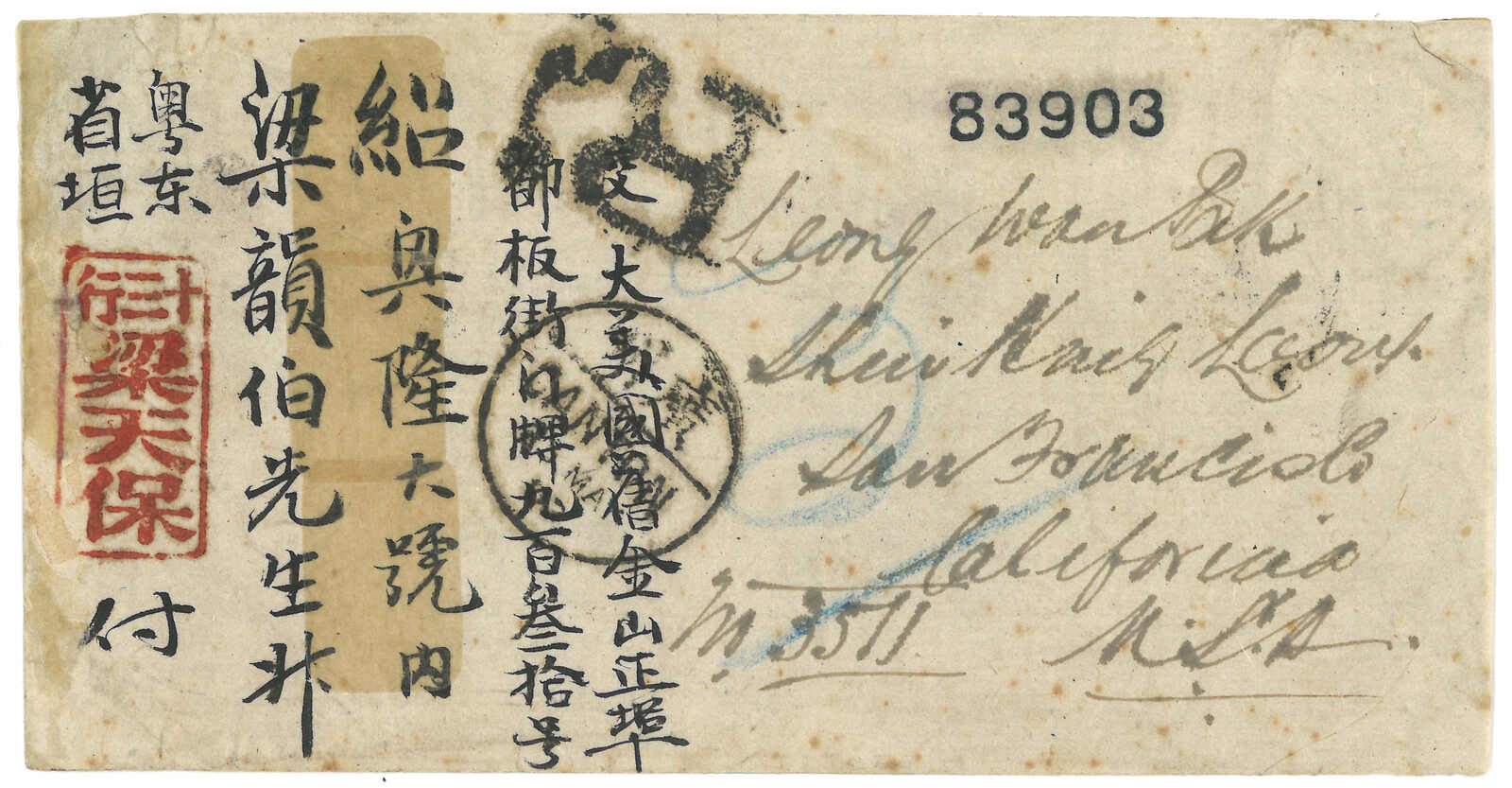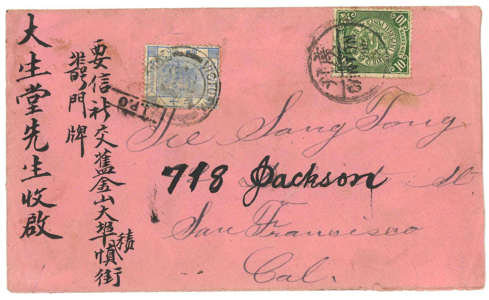 1900 image1902 Canton (23 May) to USA, f.w. Coiling Dragon 10c + 20c, in total of 30c double-registered rate, tied by Canton bisected bilingual cds. In combination with Hong Kong QV 30c, tied by Webb Canton type 2 IPO tie-print and Hong Kong GPO (24 May) cds. On front with RR mark. Arrived San Francisco (27 Jun). With toning spots.