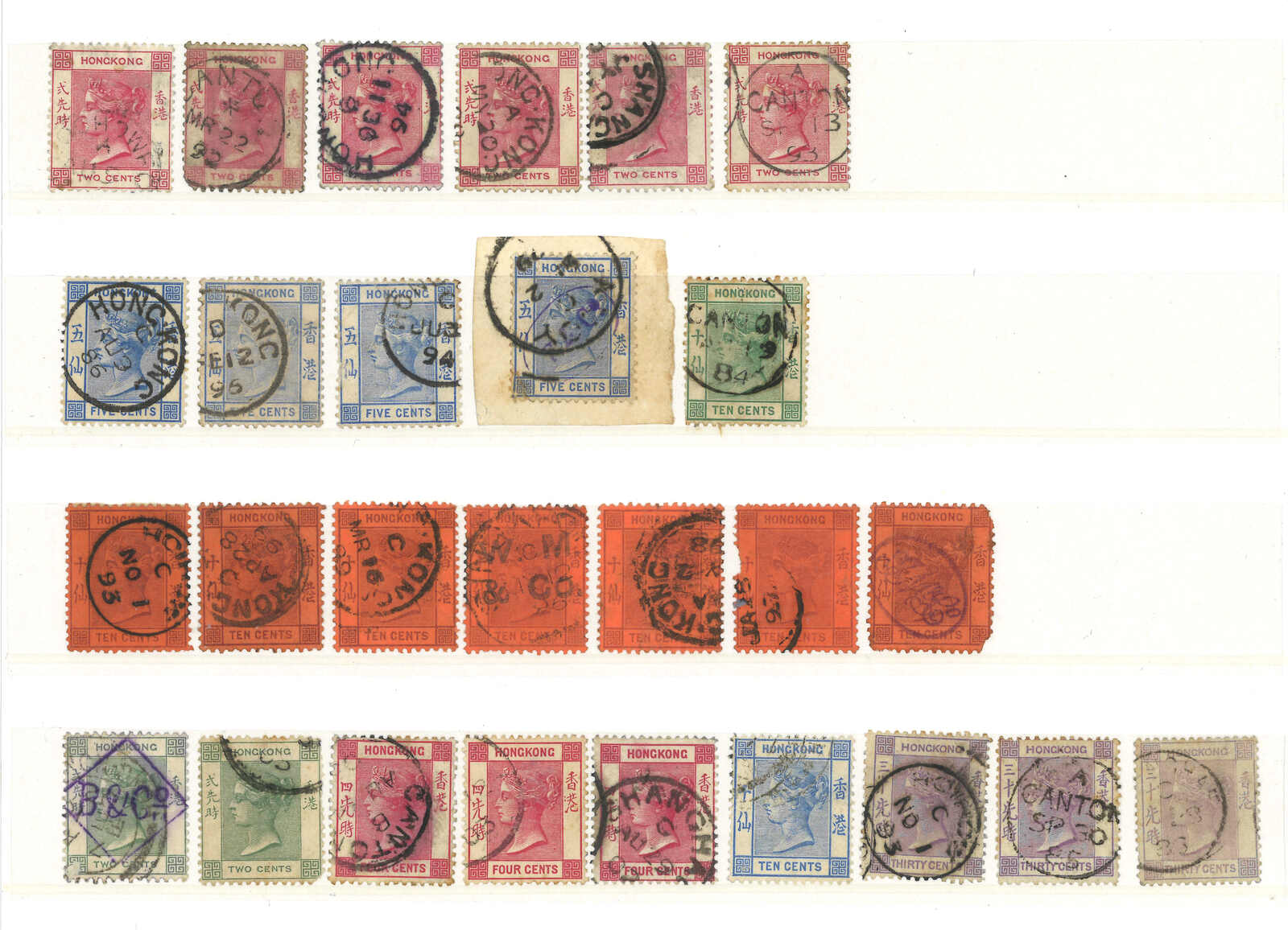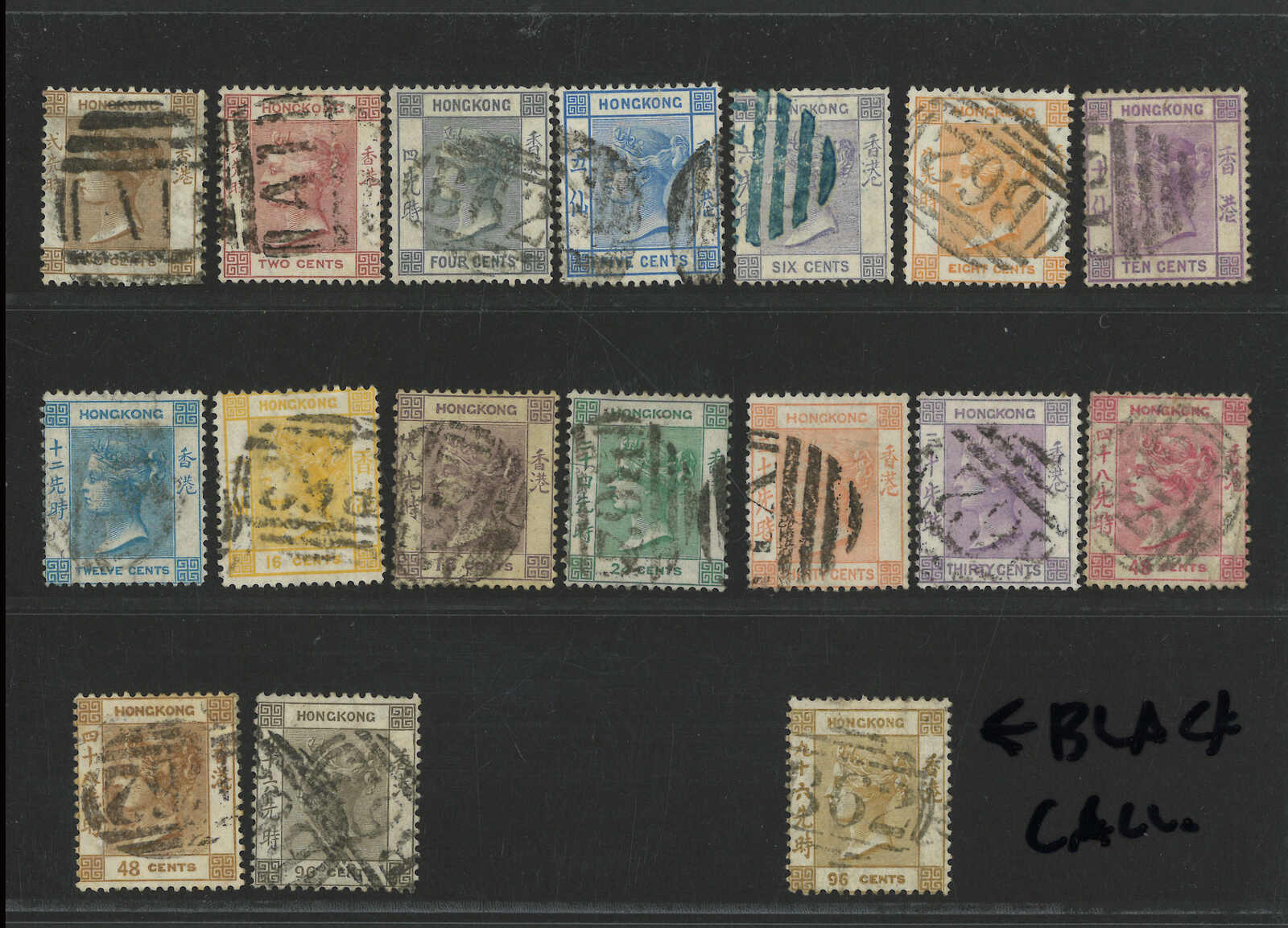 香港維多利亞女皇像舊票一組17枚,銷香港及商埠殺手戳,包括B62、A1、Y1等。當中包括一枚橄欖綠96仙。出色。(Image 1) (Image 2)