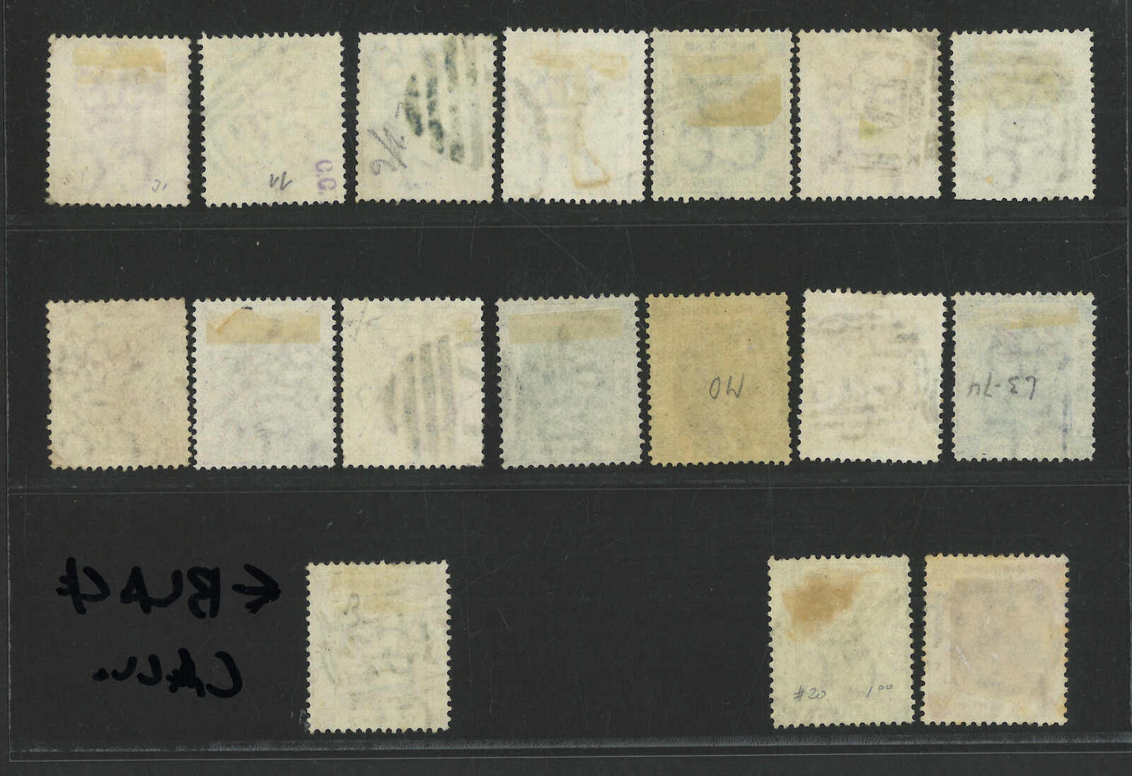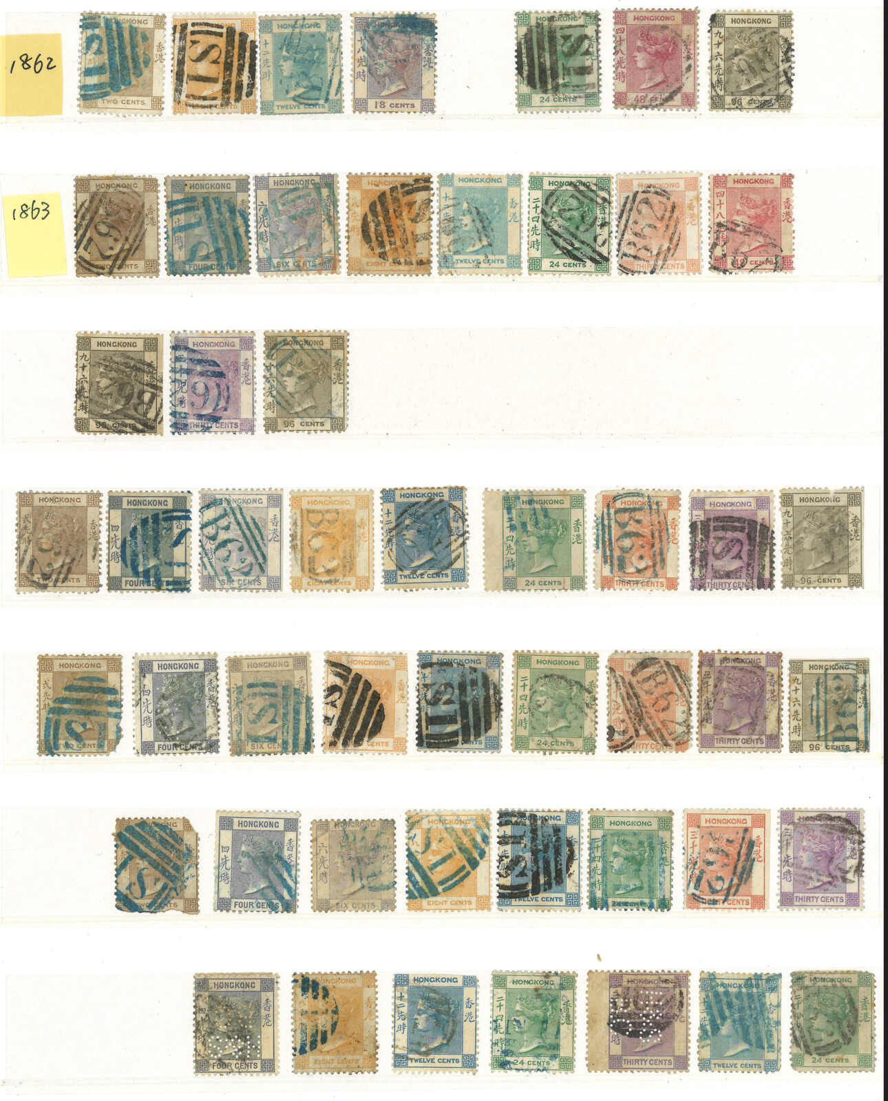 2025 o imageHong Kong QV used stamps in a group of 17, tied by Hong Kong treaty ports obliterator such as B62, A1, Y1 etc. Including a 96c oblive bistre. A nice group.