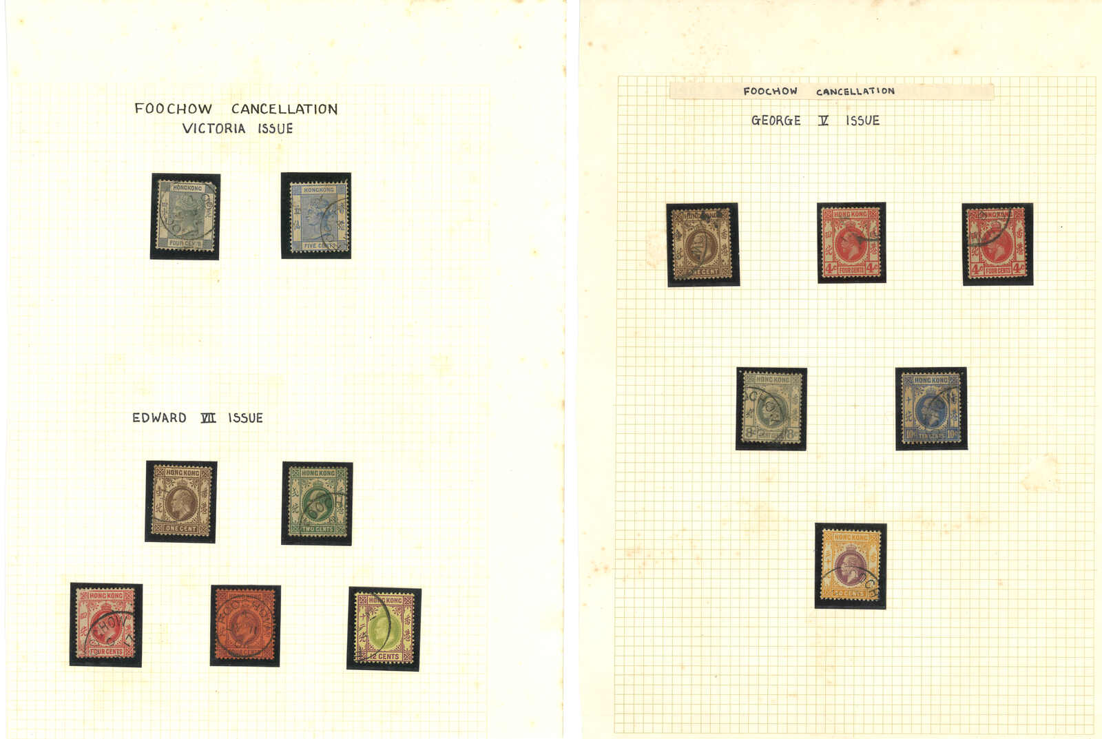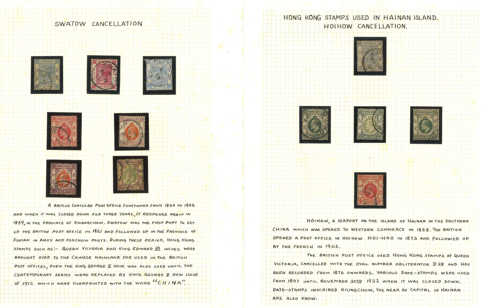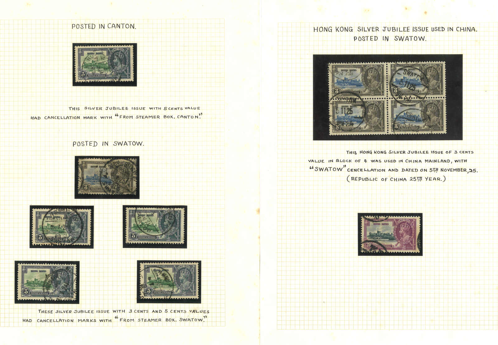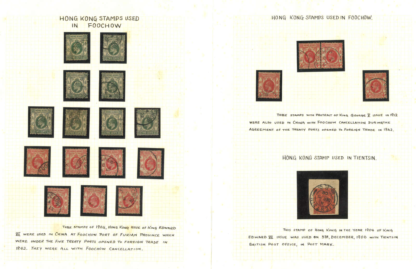 2024 o image1900-1930s a collection of about 150 Hong Kong QV, KEVII and KGV issues used in China on exhibit pages, showcasing cancellations of Shanghai, Foochow, Tientsin, Amoy, Swatow steamer etc. More valuable stamps include surch 50c/48c without Chinese character and large multiple of KGV Silver Jubilee.