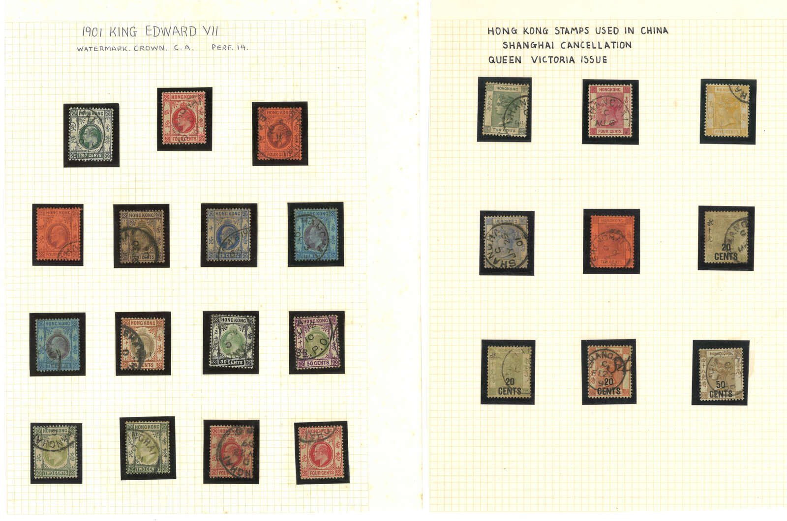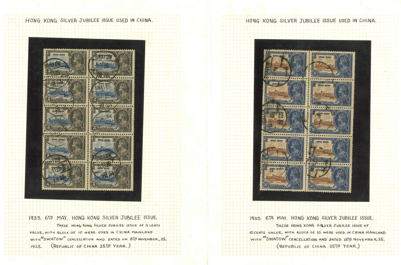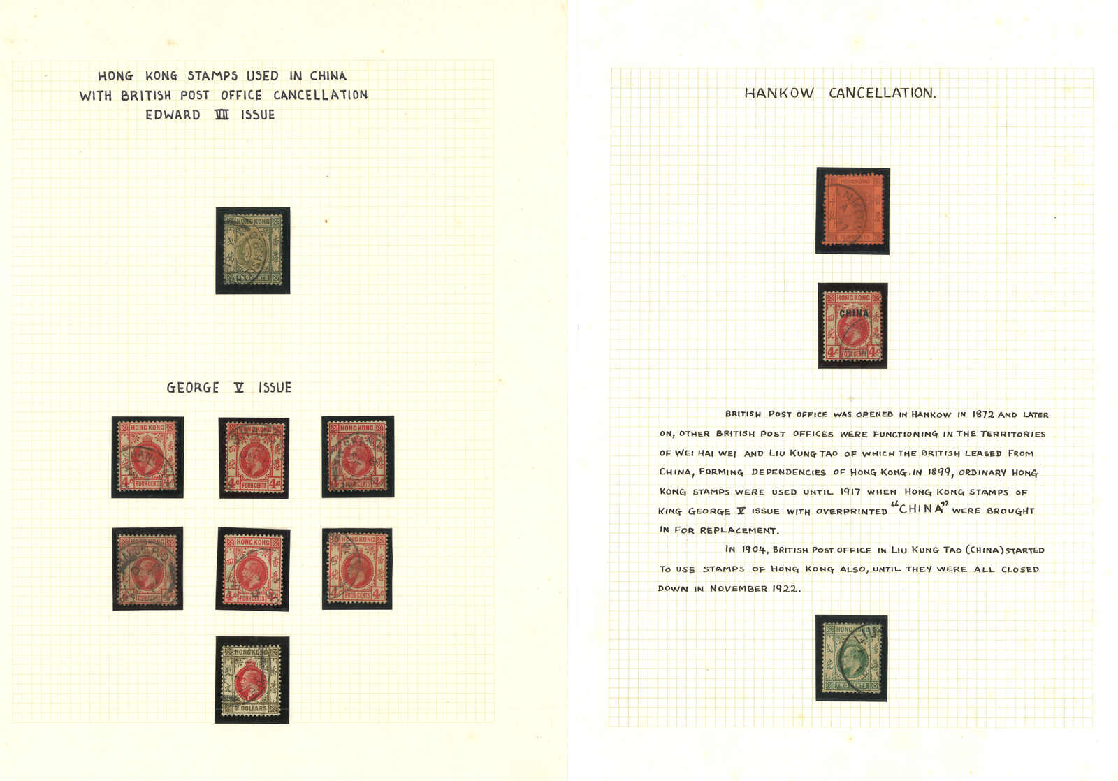 2024 o image1900-1930s a collection of about 150 Hong Kong QV, KEVII and KGV issues used in China on exhibit pages, showcasing cancellations of Shanghai, Foochow, Tientsin, Amoy, Swatow steamer etc. More valuable stamps include surch 50c/48c without Chinese character and large multiple of KGV Silver Jubilee.