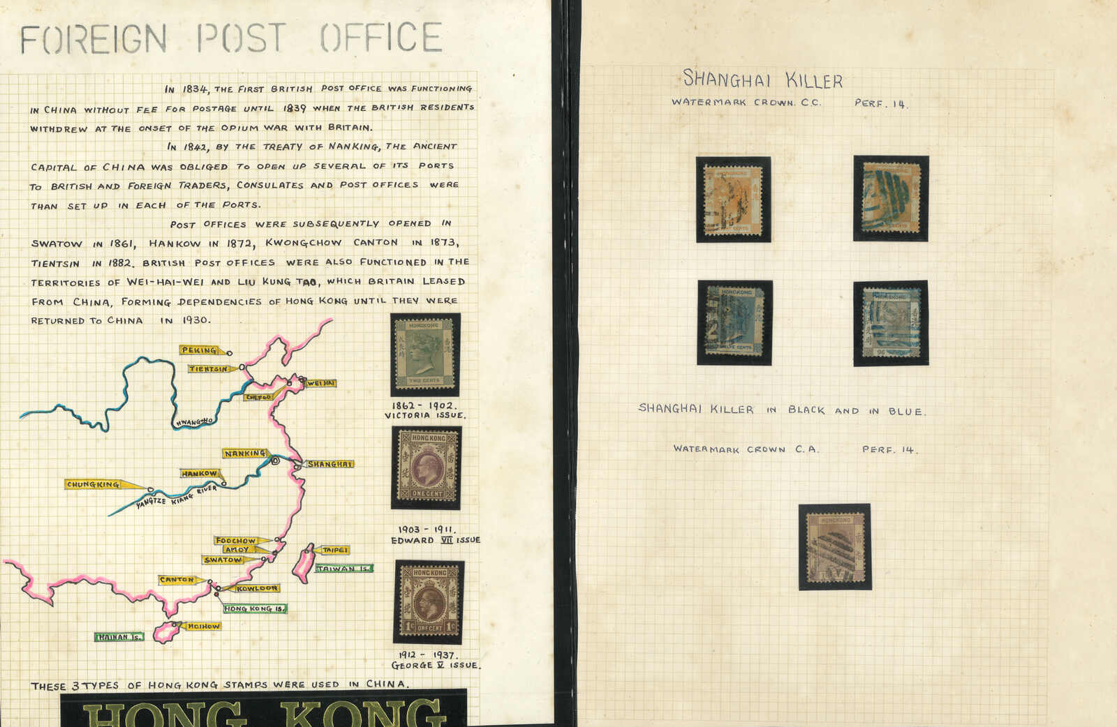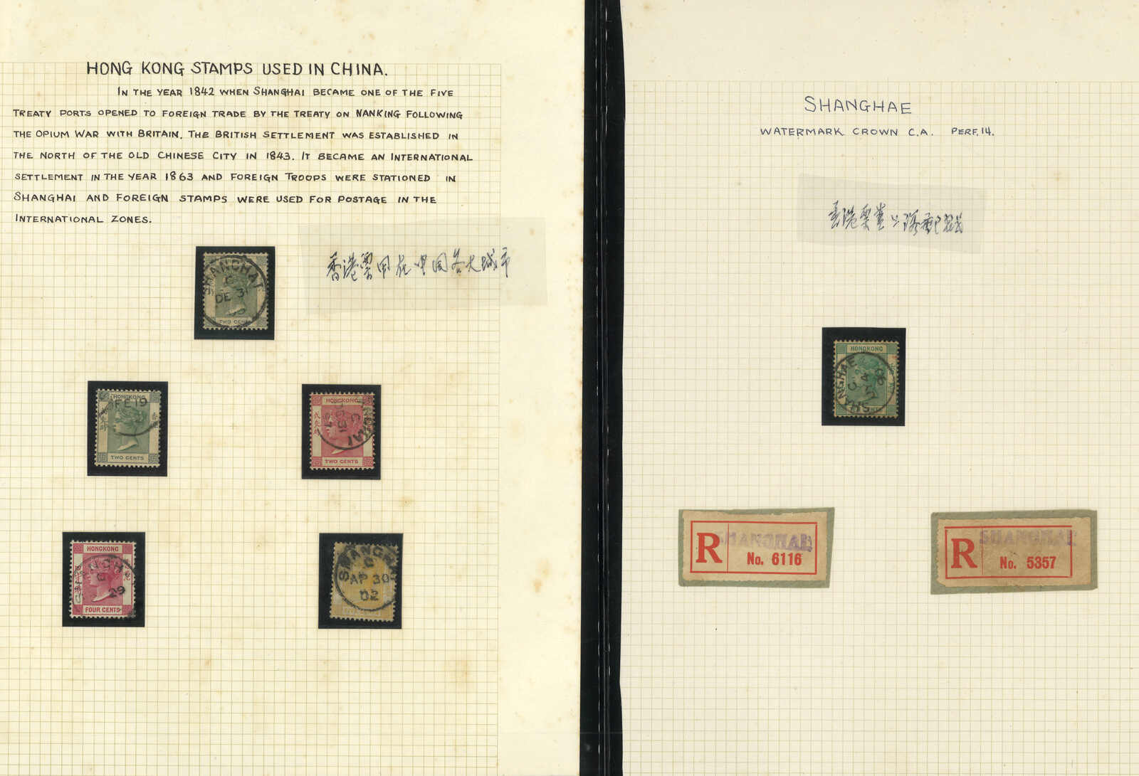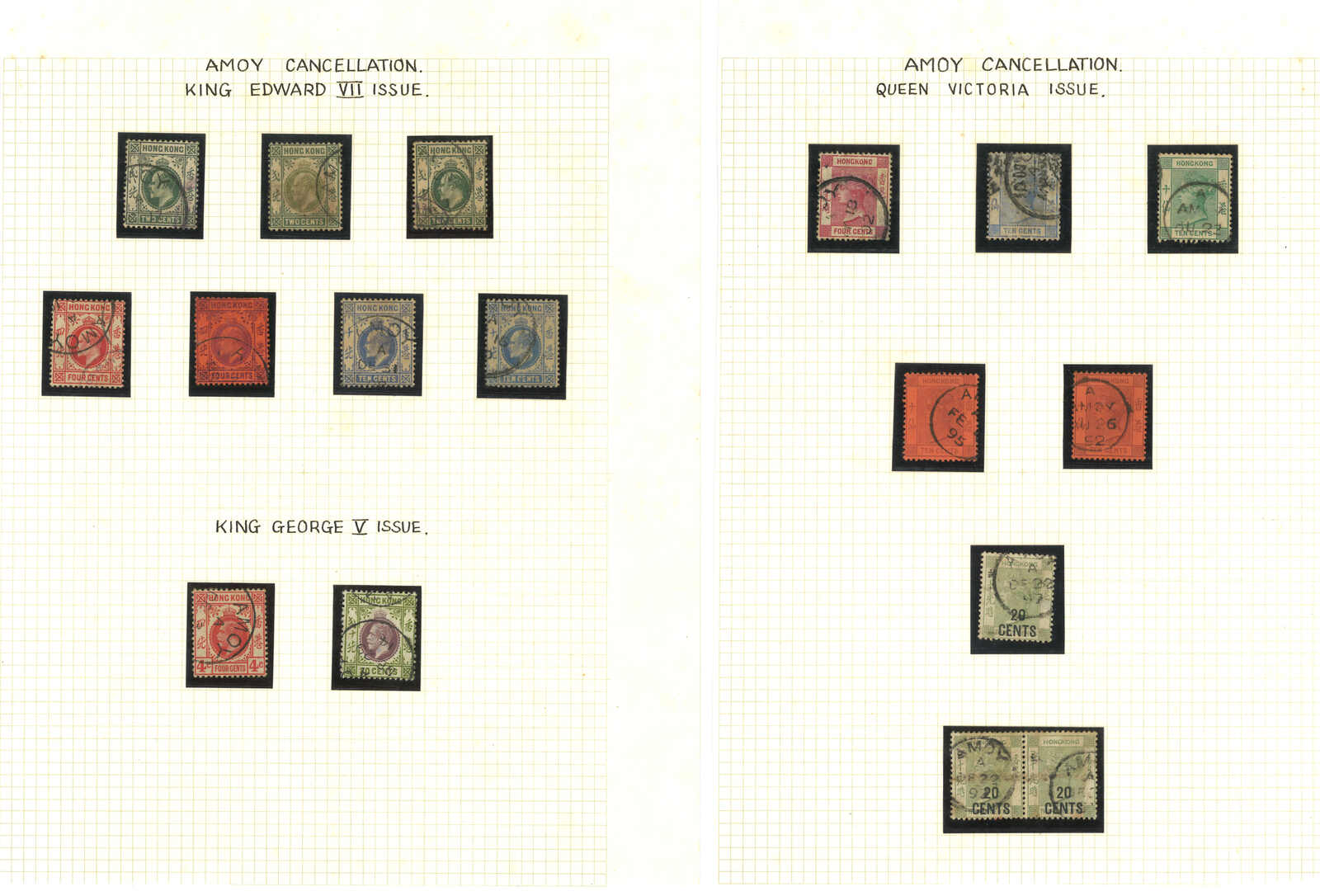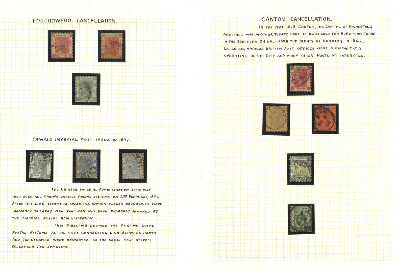 2024 o image1900-1930s a collection of about 150 Hong Kong QV, KEVII and KGV issues used in China on exhibit pages, showcasing cancellations of Shanghai, Foochow, Tientsin, Amoy, Swatow steamer etc. More valuable stamps include surch 50c/48c without Chinese character and large multiple of KGV Silver Jubilee.