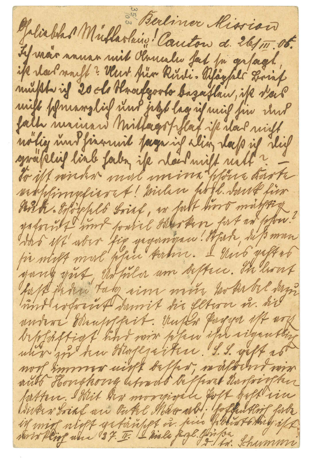 1883 cover image1906 Canton (27 Aug ) to Switzerland. Germania surch China 4c PSC, tied by Canton German PO type 5 cds. Transit Hong Kong (28 Mar). Arrived Zurich (25 Apr). It is the first type of cds used by Canton German PO.