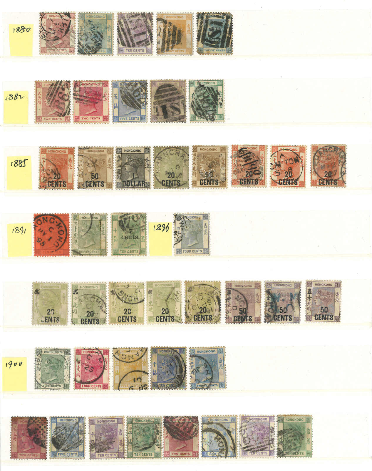 1862至1900年一組約93枚香港維多利亞女皇像及其加蓋改值舊票,銷S1、B62殺手戳、上海、廣州英局等日戳。較佳者包括1862年無水印全。(Image 1) (Image 2) (Image 3)