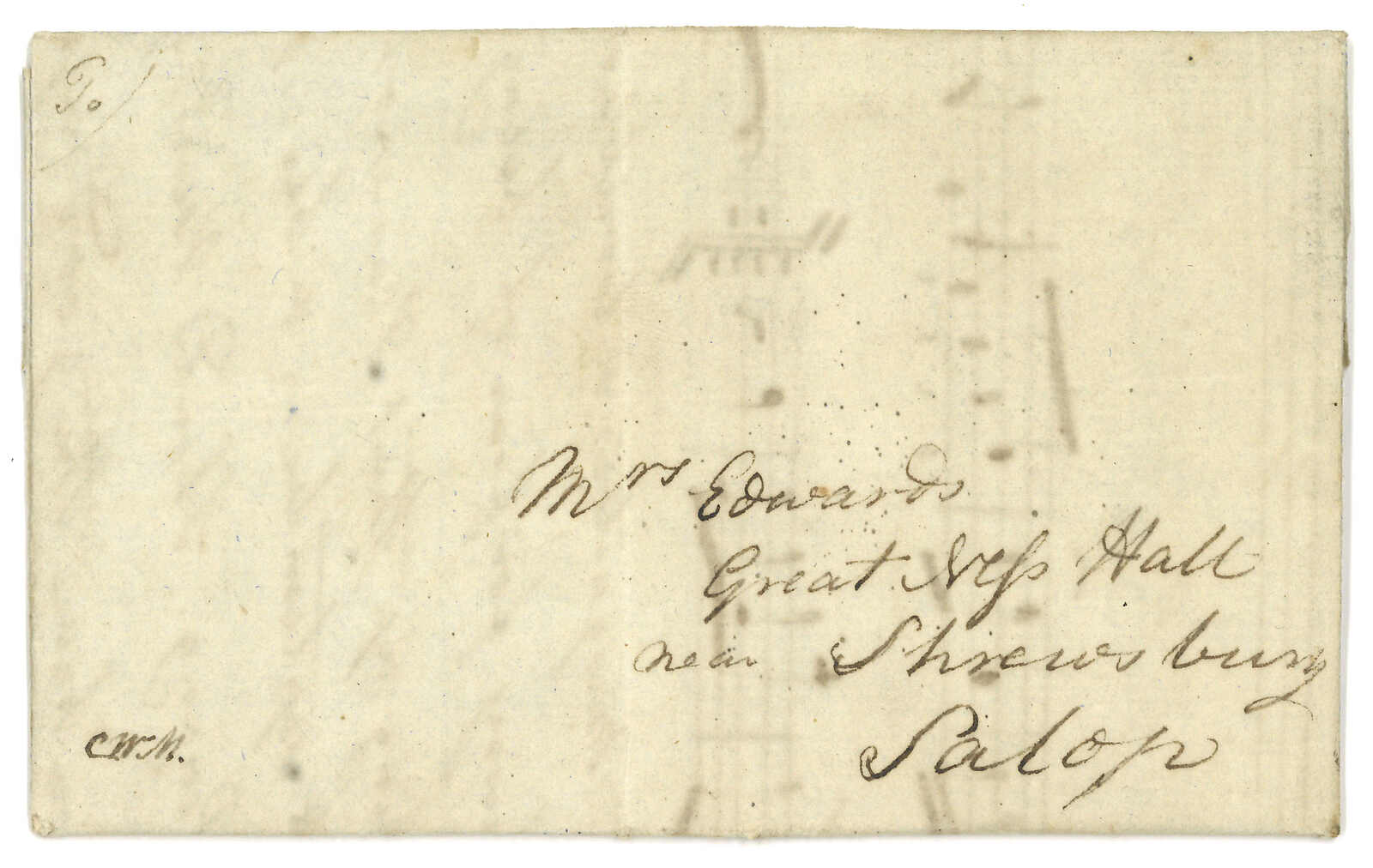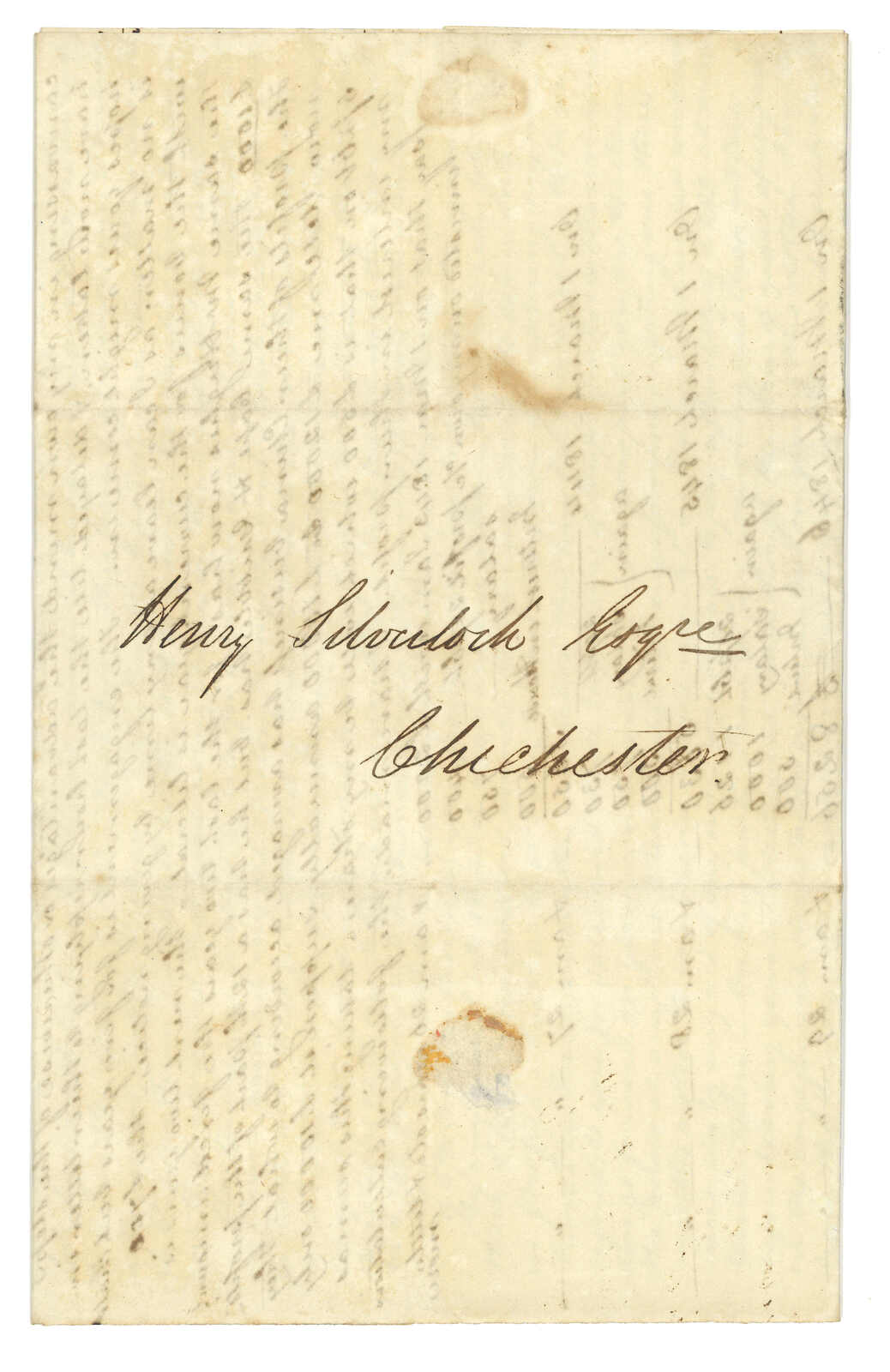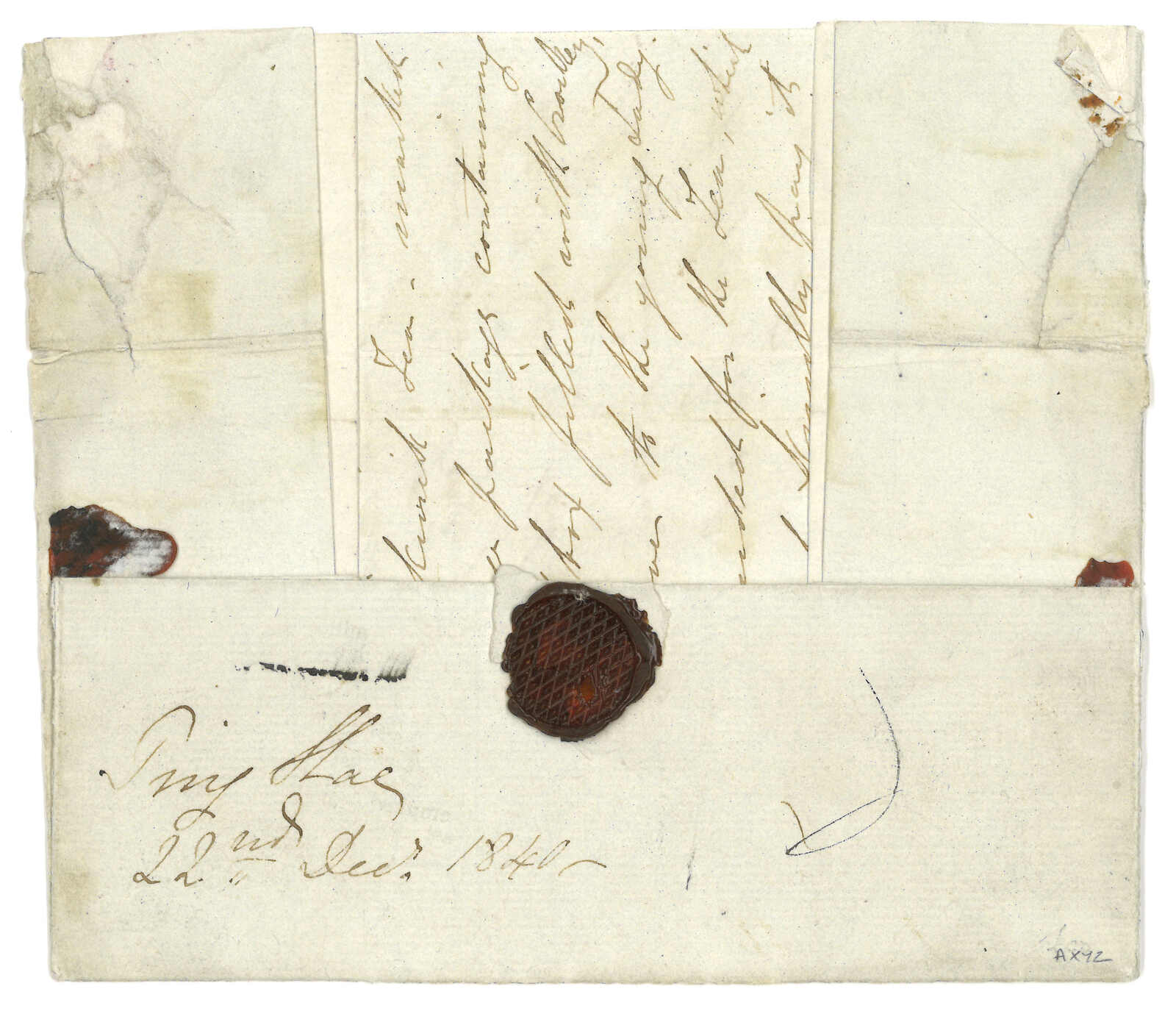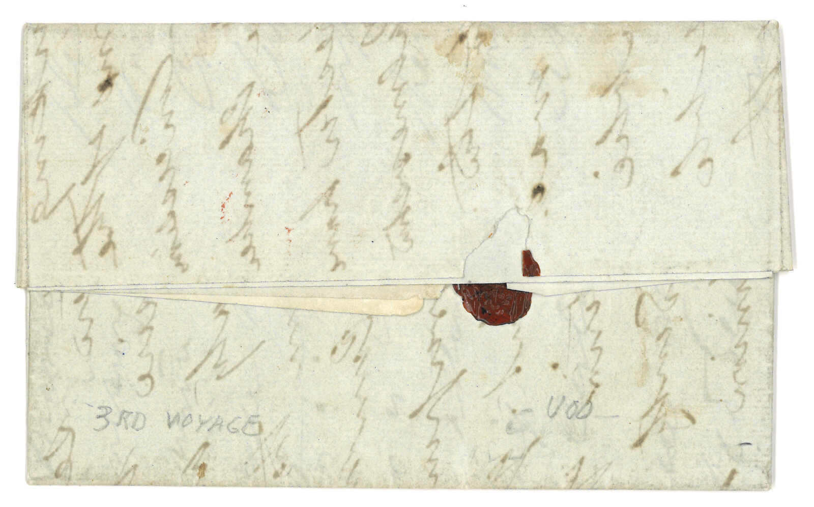 2202 cover image1817 C.W. Martin onboard Milford at Whampoa (20 Oct) to his sister in England. Entire letter without postmark, enclosing the music score for the Bay of Biscay in content. He mentioned that the weather in China "is so hot and the mosquioes so troublesome". Interesting early pre-adhesive.