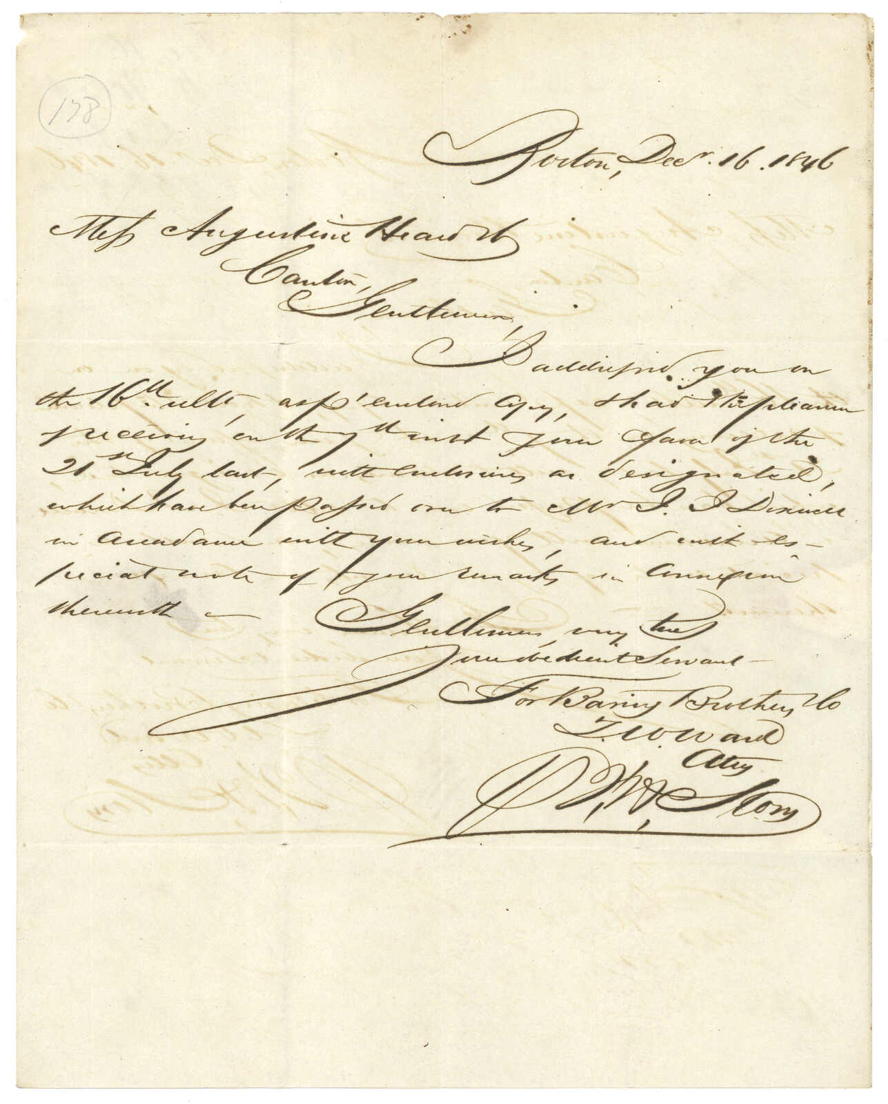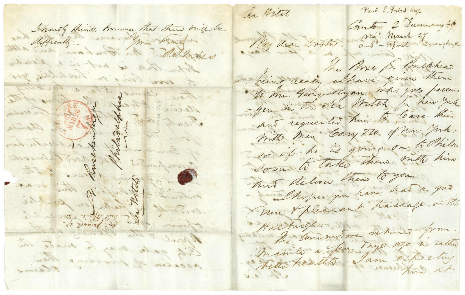 1851 cover image1849 (Jan 2), “Sea Witch” Clipper’s Record-Setting Voyage to China and Back. Blue folded letter datelined Canton January 2, 1849, from Paul S. Forbes to Dr. Ruschenberger (naval surgeon and author), Philadelphia, sender’s directive “Sea Witch”” and carried on the return trip of the Sea Witch’s record around-the-world voyage to New York via the Cape of Good Hope, arriving at the port of New York on March 25, 1850, red “New-York Ship 7cts Mar. 26” (1850) integral-rate circular datestamp, neat receipt docketing, interesting content regarding legal matters with comment “Old Sen is more polite and accommodating to the Americans under the influence of our new policy...” Very Fine. CARRIED ON THE SEA WITCH ON ITS RETURN TRIP FROM CHINA IN 1849—THIS AROUND-THEWORLD TRIP SET THE RECORD FOR A SAILING SHIP. Note: The “Sea Witch” was a famous American clipper ship that achieved the around-the-world record for sailing vessels on the voyage that carried this letter from China to the U.S.A.(Image 1) (Image 2) (Image 3) (Image 4)