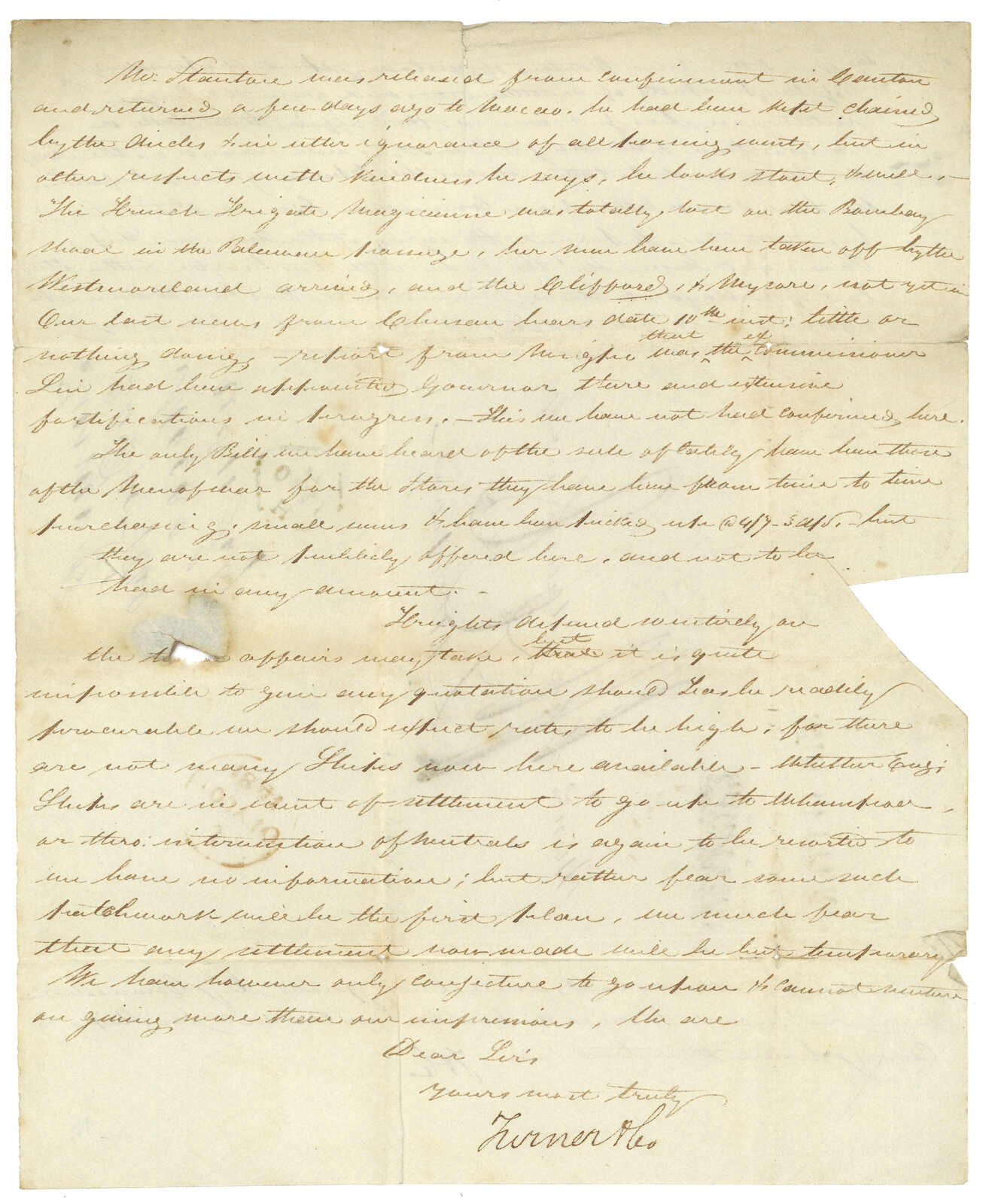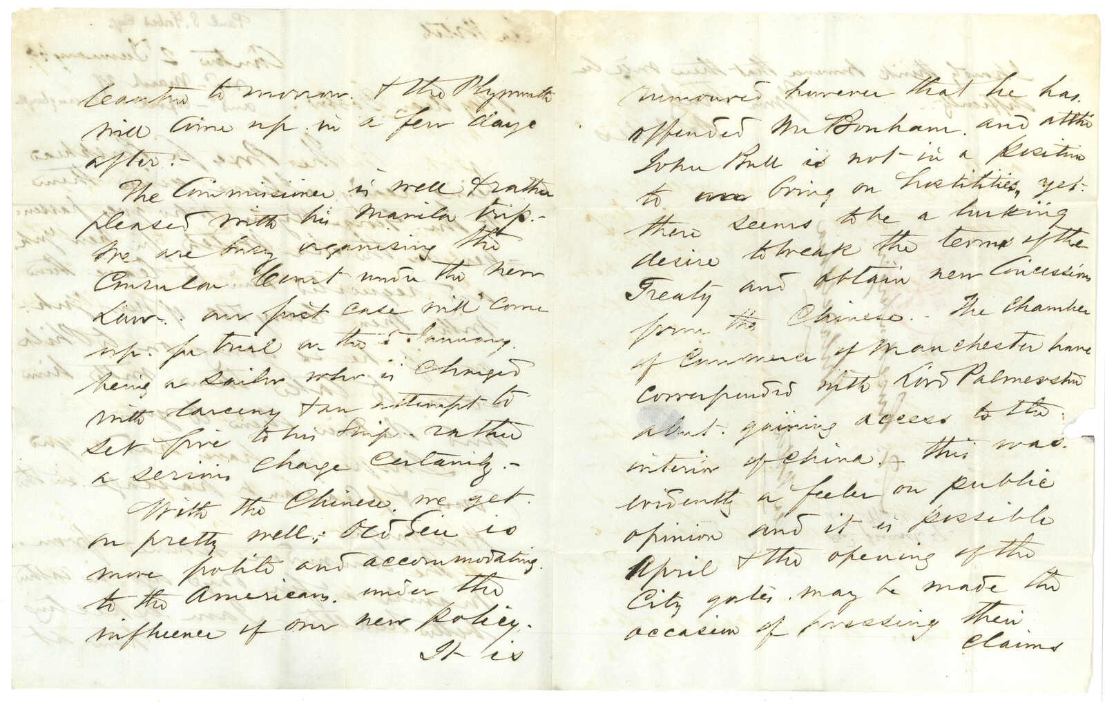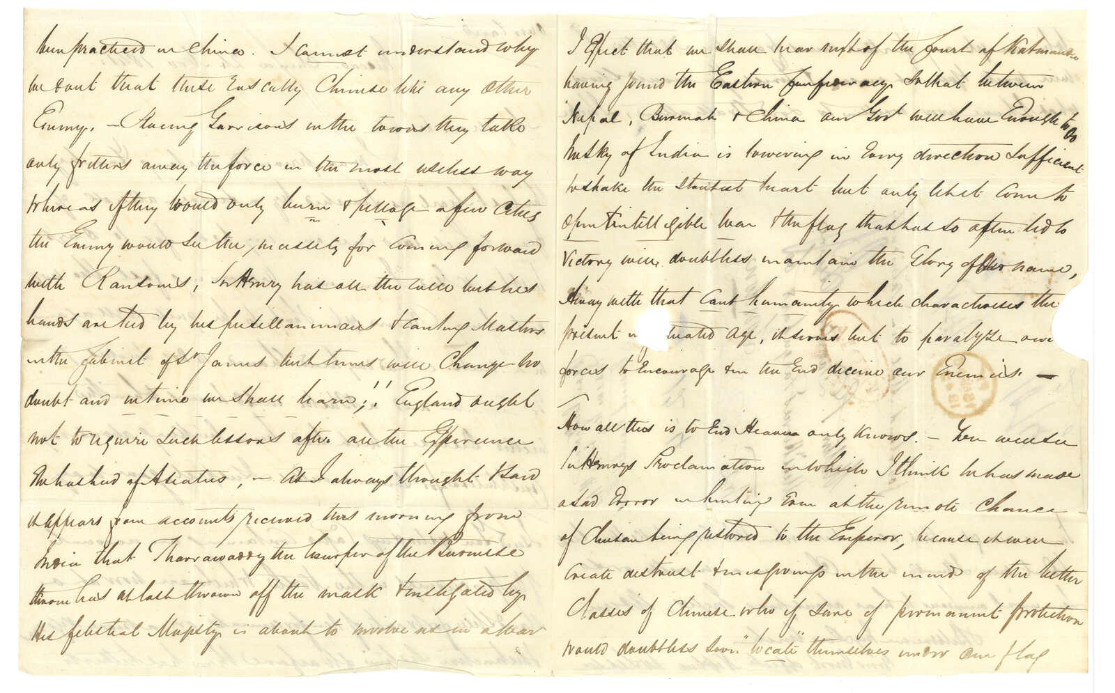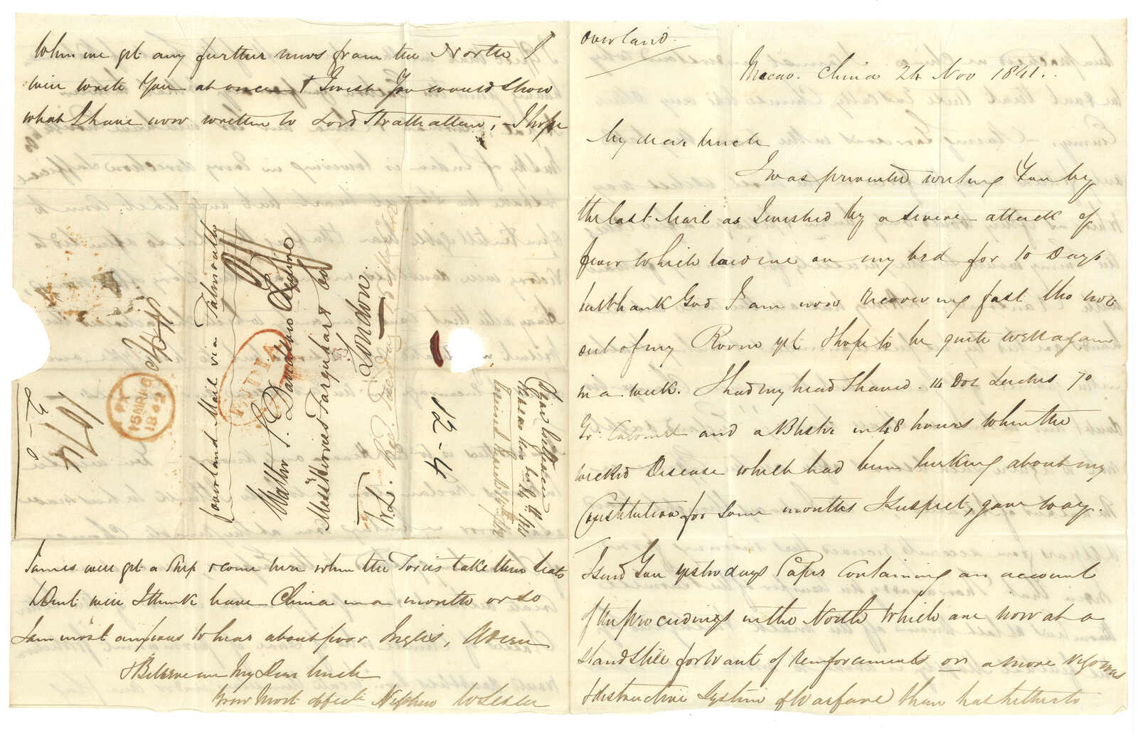 1834 cover image1841 (Nov 24), from Macao to London, First Opium War letter written after the end of the Second Battle of Chusan and the Battle of Chinhai. A very good letter to have described the military developments following the Second Battle of Chusan. The letter described the following: “…… I send you yesterday paper containing an account of the proceedings in the North which are now at a standstill for want of reinforcements on a more vigorous and destructive system of warfare than has hitherto been practiced in China. I cannot understand why we can’t treat these [exactly] Chinese like any other enemy. Having carried in the towns they take, only fritters away the forces in the most wretched way, whereas if they would only burn & pillage a few cities the enemy would see the necessity for coming forward with [terms]. The Army has all the will but his hands are tied by the feebleness and vacillating measures in the Cabinet at home. Until minds were changed, no doubt and union in their hands, England ought not to require such blood sacrifices as the Government pretends of the troops. – As I always thought, and appears from accounts received this morning from India, that throwing away the lawfulness of the [Treaties], the Chinese had at last thrown off the mask, and anticipated by the Celestial Majesty, is about to involve us in a war……” This letter has suggested that the military operations in Northern China at the time have stalled. The writer criticized the restrained British strategy so far, arguing that a harsher, more destructive approach would have compelled quicker Chinese submission. The writer advocated burning or pillaging cities to force negotiations instead of dispersing troops. The writer further blamed the weakness and indecision in the British Cabinet for prolonging the conflict and causing unnecessary losses. After the Second Battle of Chusan in Oct 1841, a critical military move by the British forces in the First Opium War is to shift their strategy and embarked on a decisive course of military actions to re-take, reoccupy Chusan. That formed a base making the British to eventually move from Chusan into Nanking to end the First Opium War.(Image 1) (Image 2) (Image 3) (Image 4)