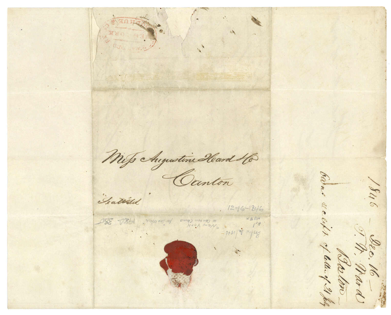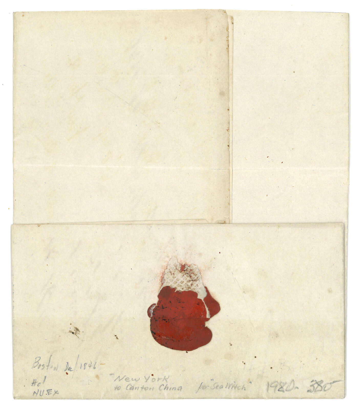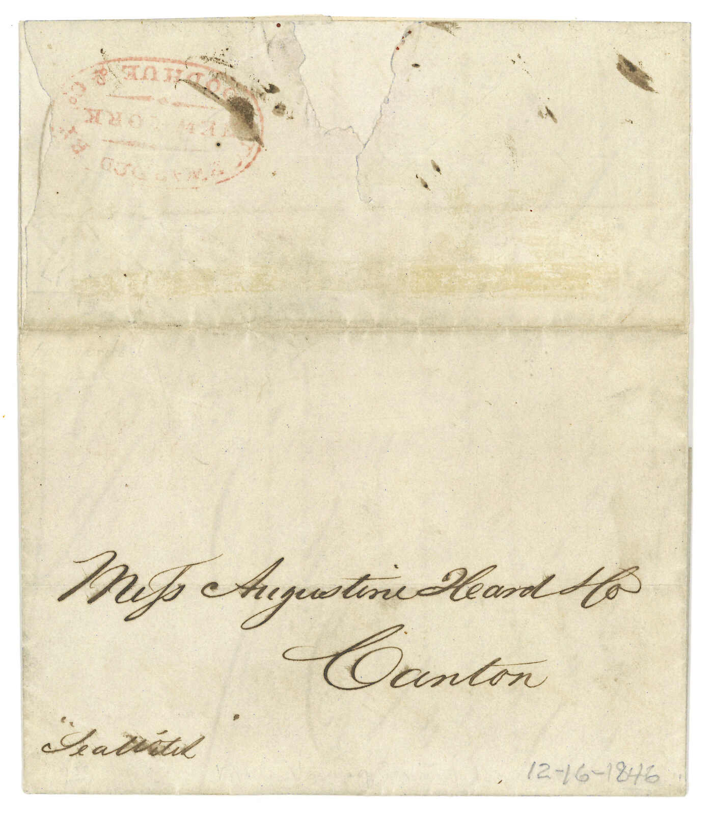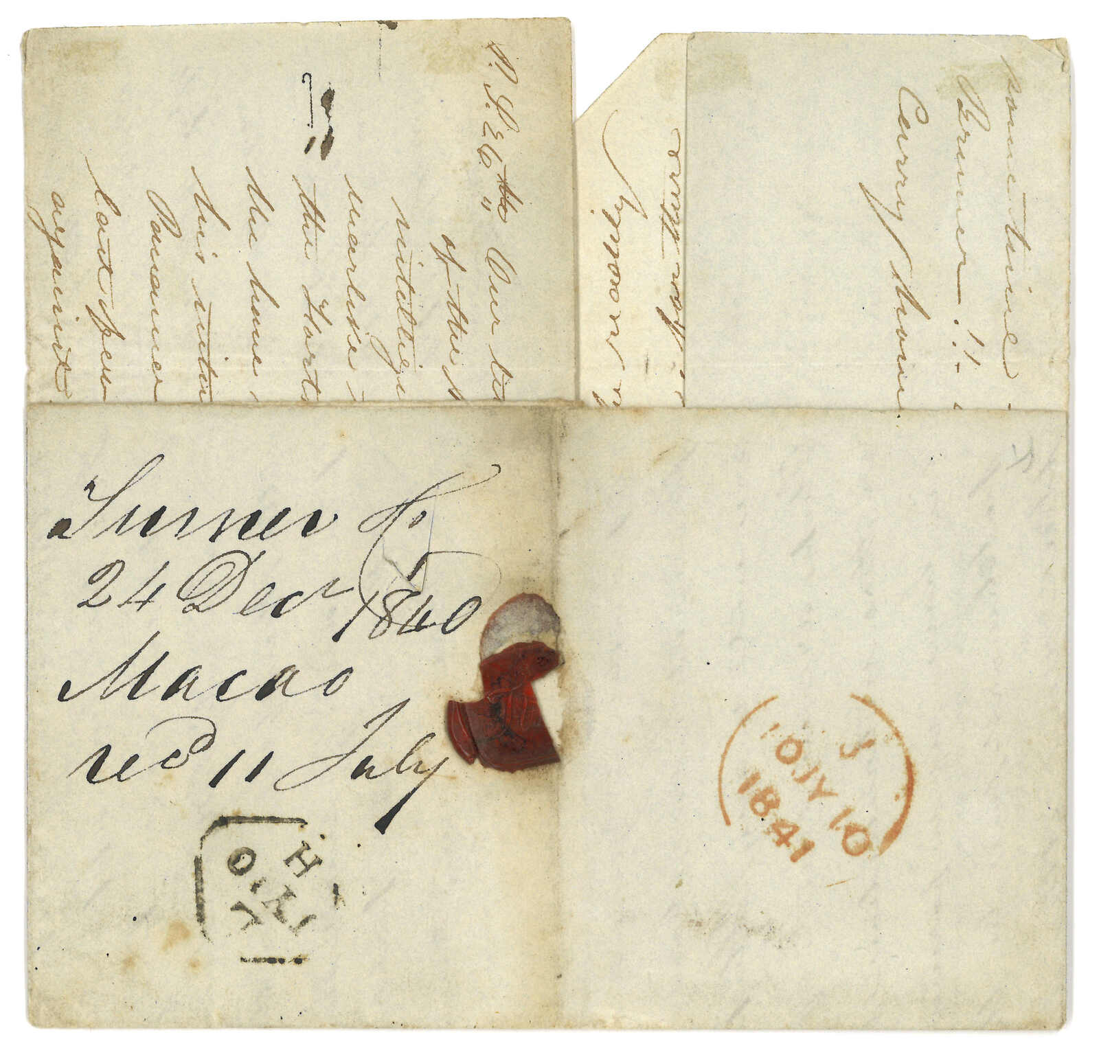 1841 cover image1846 (Dec 16), a letter sent from New York to Canton China, addressed to Mess. Augustine Heard & Co., Canton, endorsed at its lower left-hand corner “Sea Witch”. On the reverse, cancelled by a red forwarder mark “FORWARDED BY / NEW YORK / GOODHUE & CO.”, together with a manuscript writing of “Ans. to receipt of letter of 21 July (1846)”. The clipper ship Sea Witch was one of the most celebrated American clippers during 1840-50s, and a symbol of the “China Trade” era. Built in 1846 by Smith & Dimon in New York for the firm Howland & Aspinwall, she was specifically designed to speed on the New York-China route. This mail was connected to the golden age of American clipper ships and to the intensified competition of China trade after the First Opium War. This mail is believed in the first year of Clipper Sea Witch trip to Canton.(Image 1) (Image 2) (Image 3) (Image 4)