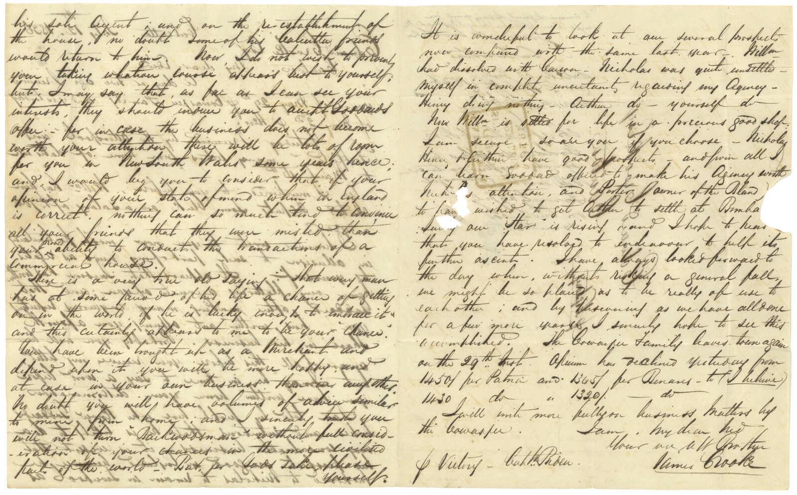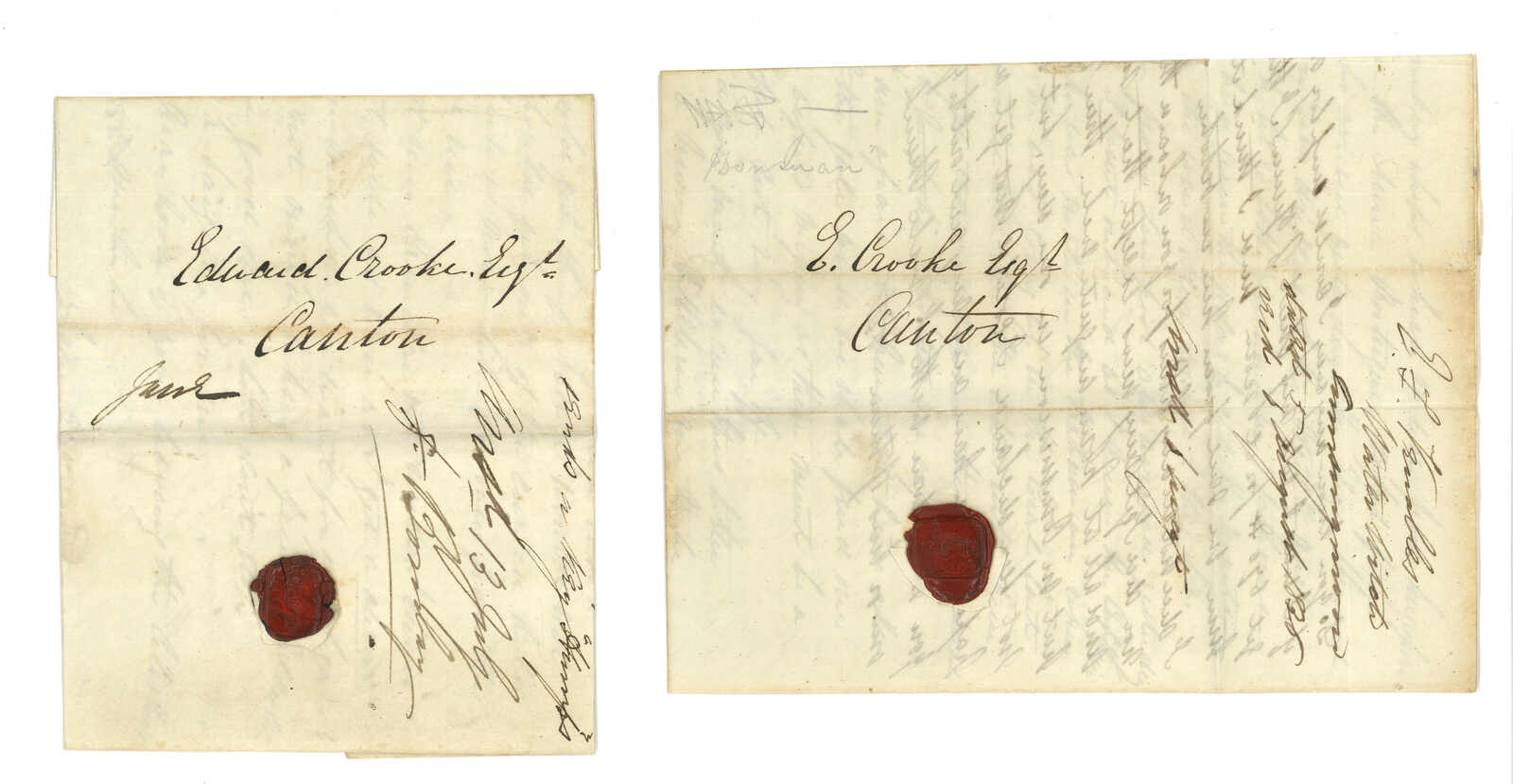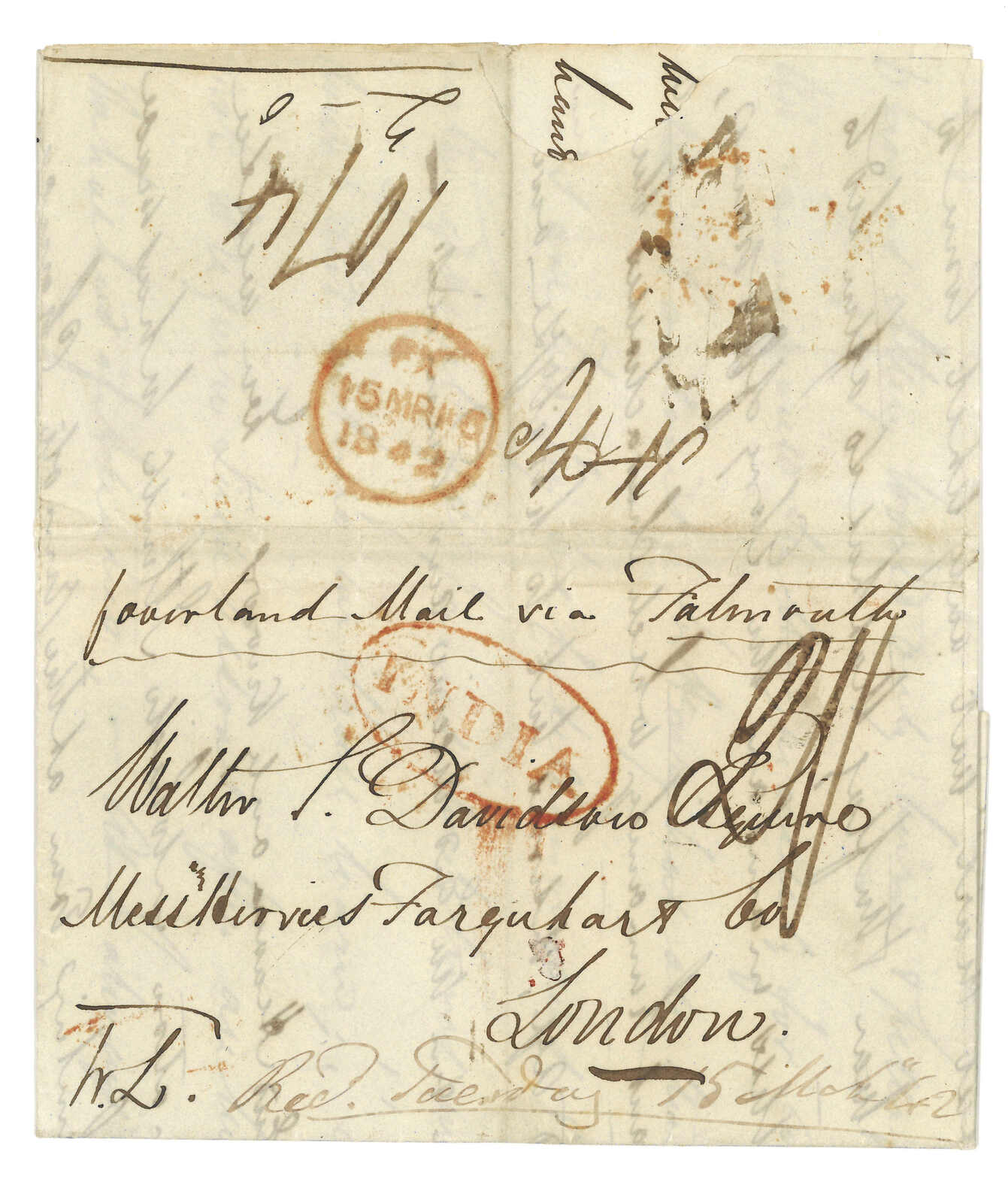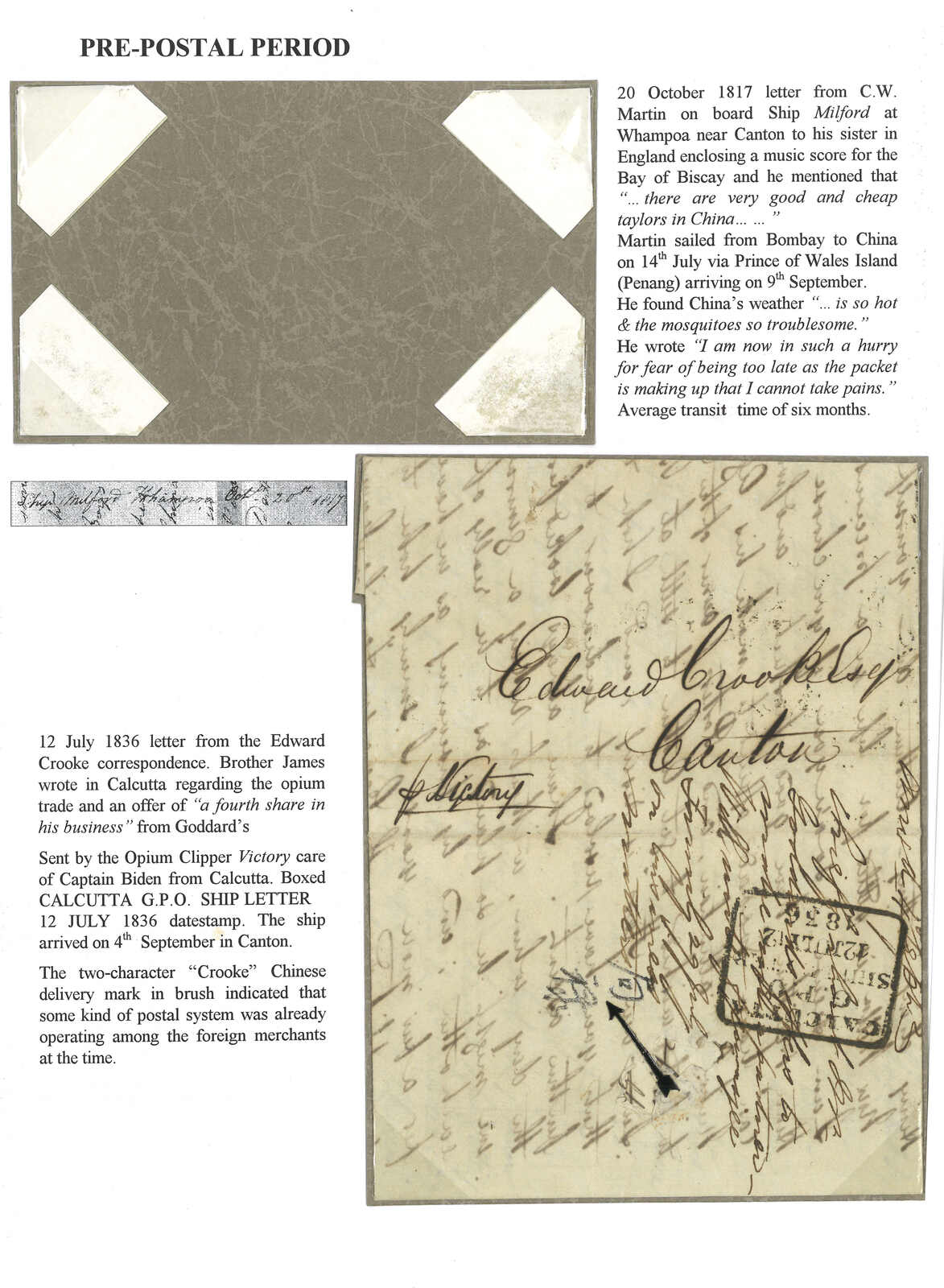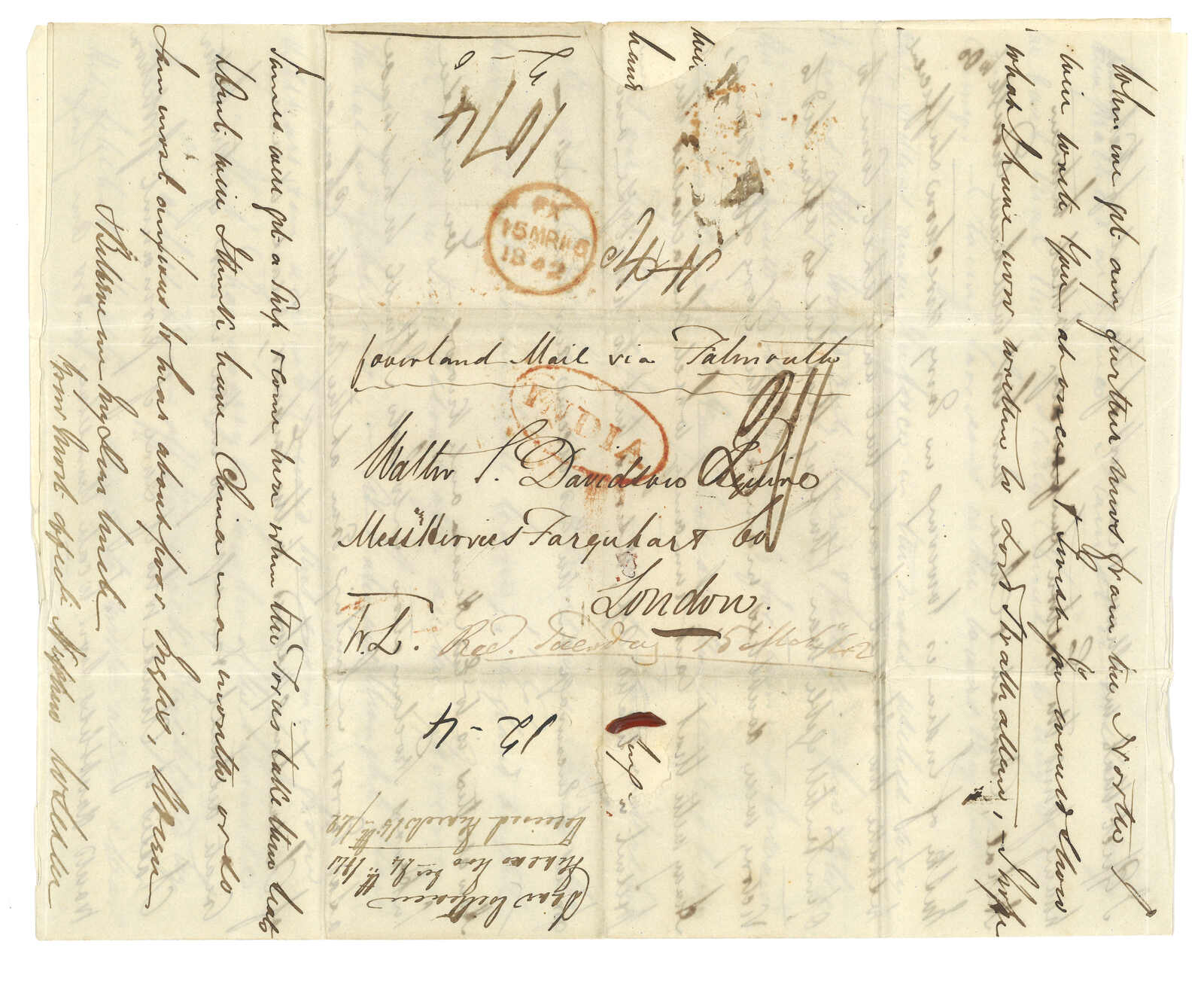 2203 cover image1836 James Crooke, Calcutta (12 Jul) to opium trader Edward Crooke, Canton. Entire letter, sent "p Victory", applied with Calcutta GPO shipletter d.s. Showing the Chinese name of James Crooke in brush-stroke.