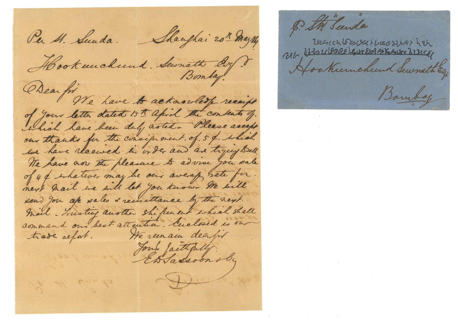 1831 cover imageFirst Opium War – The Opium Trade Opium Clipper Ship Water Witch: 1836 (11 July, and 5 August) two letters of account written on board the ‘Water Witch’ at Cumsingoon Island to Edward Crooke in Canton; there are no postal markings with Chinese ink characters “局碌”on the flap; there is the usual light horizontal filing fold. Very Good mails from Cumsingmoon. The 5 August letter mentioned the following opium related incident: “ …… was also dismasted and buffeted onshore about 30 miles to the West of Macao and was totally lost with upwards of 400 Chests of Opium. A Portuguese gentleman who went round to Bombay in her and 110 or 120 other people were drowned. The house of Mr. S. Beale was on board and arrived in Macao the morning before yesterday. No sooner had they landed than the Chinese began to plunder them ……” Water-Witch opium clipper barque built in 1831 at Kidderpore, Calcutta. An interesting letter which illustrates the opium business at that time, the old boats, anchored near the island, acted as warehouses where the opium was loaded onto smaller boats to be smuggled into Canton and other ports. Cumsingmoon is the prominent water gateway of Canton River for the smugglers to privately ship opium chests into Whampoa during 1830s at the beginning of opium smuggling period. A very nice group of opium trade related materials.