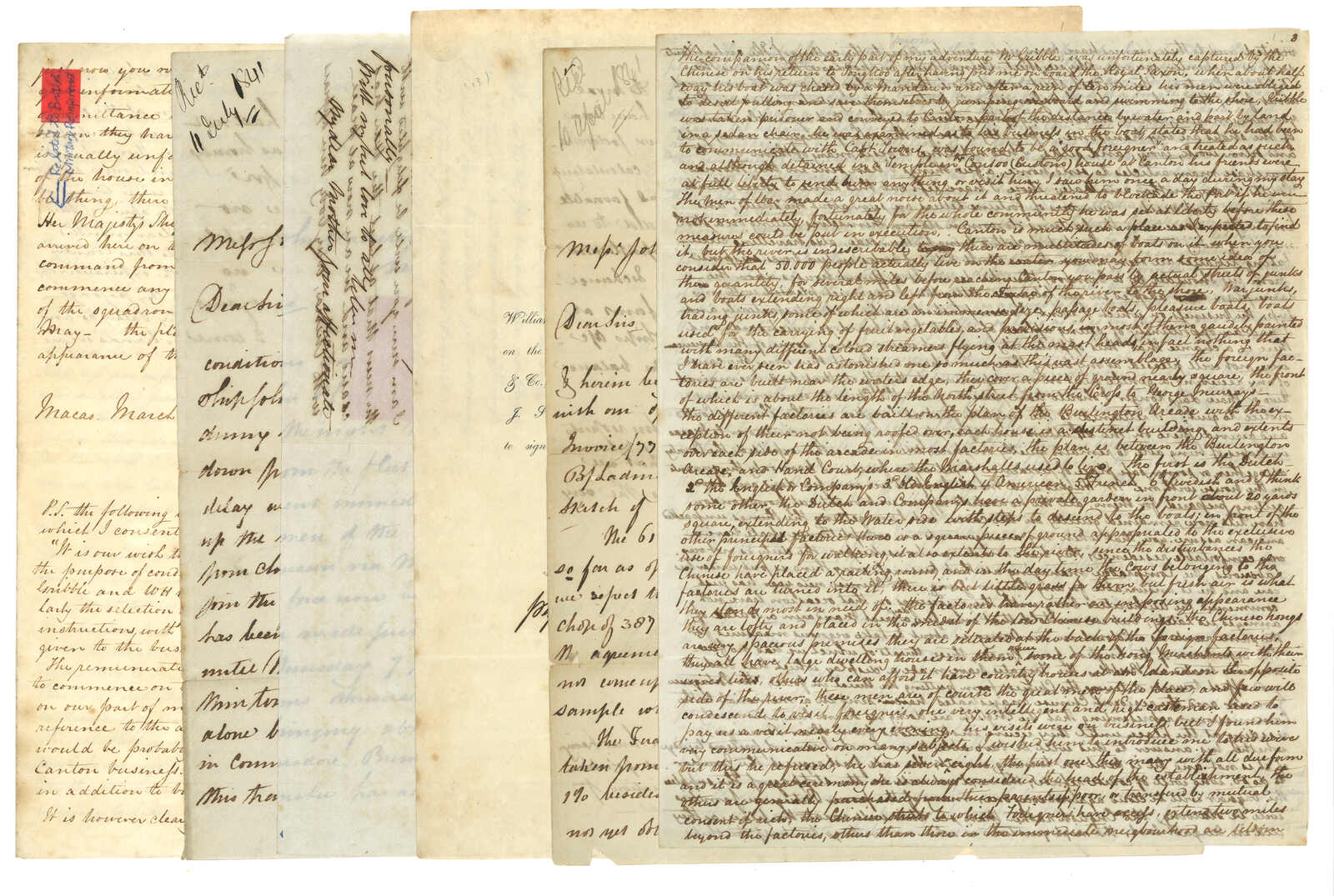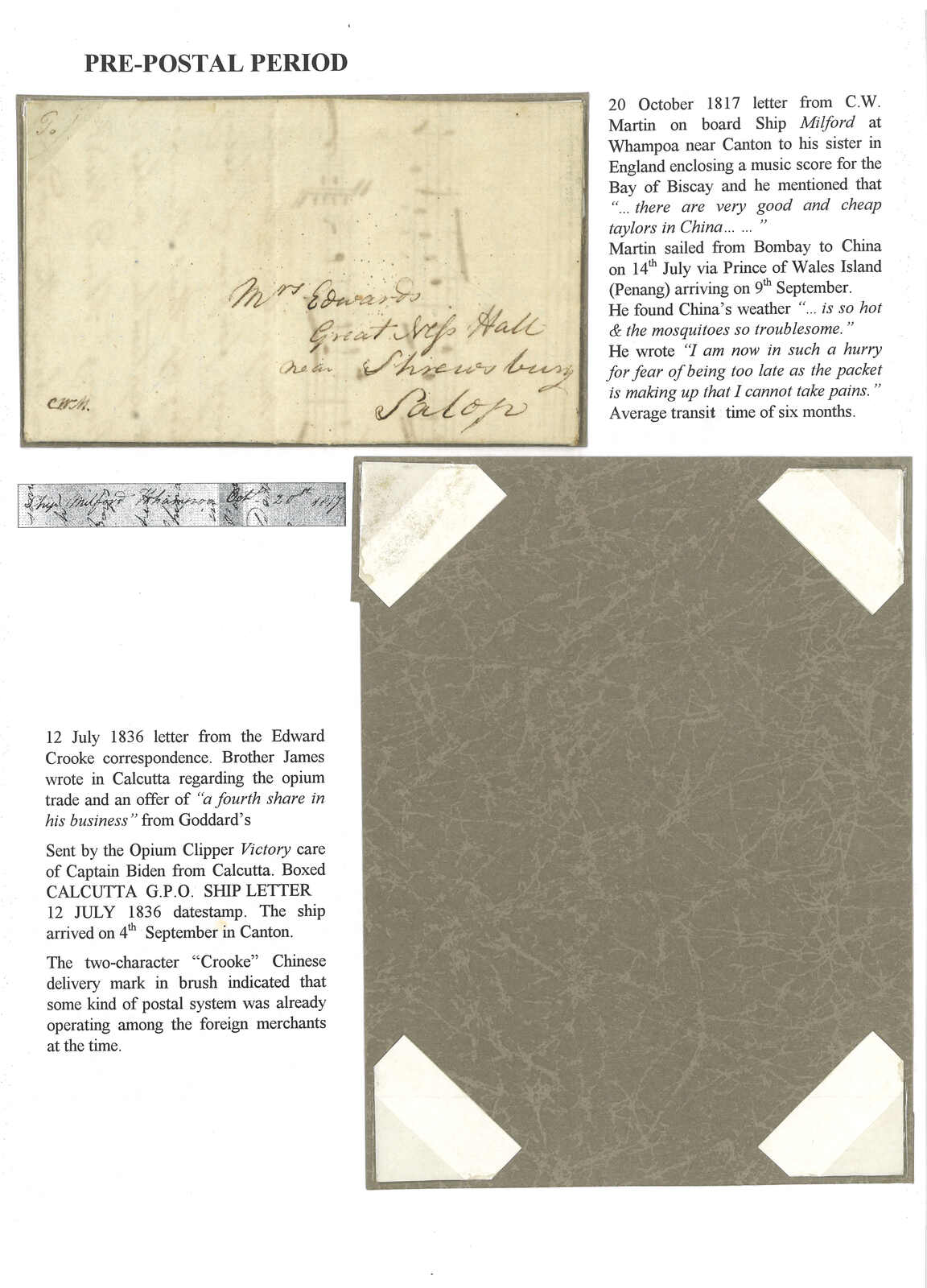 1832 cover imageA group of 7 letter sheets and 1 authorisation letter in the First Opium War periods. One un-sent out letter from Silverlock dated 16 April 1842, plus two additional letter sheets, and one more Gladstone correspondence letter sheet; all are about the states of trade geopolitical tensions between China and UK at the time. In addition, one more authorization sheet to authenticate the signing authority of John Silverlock to his representative British companies dated 31 December 1842. On top of the above, there are two sheets about the Opium War situations These two stated clearly the military build-up at the beginning of the First Opium War before launching attack to Canton River and further to Chusan period. Letter sheet dated 30 March 1840: “…… Her Majesty’s Ship ‘Druid’ 44 guns commanded by Capt. Lord John Churchill arrived here on the night of the 24th inst., also he is the senior retakes the command from Capt. Smith of the ‘Volage’, he will not, it is understood, commence any hostile proceedings against the Chinese till the arrival of the squadron from India which is expected here the first week in May – the place is perfectly quiet, the Chinese much alarmed at the appearance of the Ship of War ….. “ Letter sheet 6 Jan 1841: “ ...... came down from the fleet with despatches for India. Without delay, it is understood to tow up the men of the 26th & 49th Regiments, just arrived from Chusan via Manila, – those for service to join the force now before the Bogue. Nothing official has been made public, but the general belief is that until Wednesday 7 June is given, the Chinese to amend their terms. Otherwise Capt. Elliot, despairing of diplomacy alone bringing about a settlement, will leave the matter in Commodore Bremer’s hands. Some accounts state that this transfer has actually already taken place …… “(Image 1) (Image 2) (Image 3) (Image 4)
