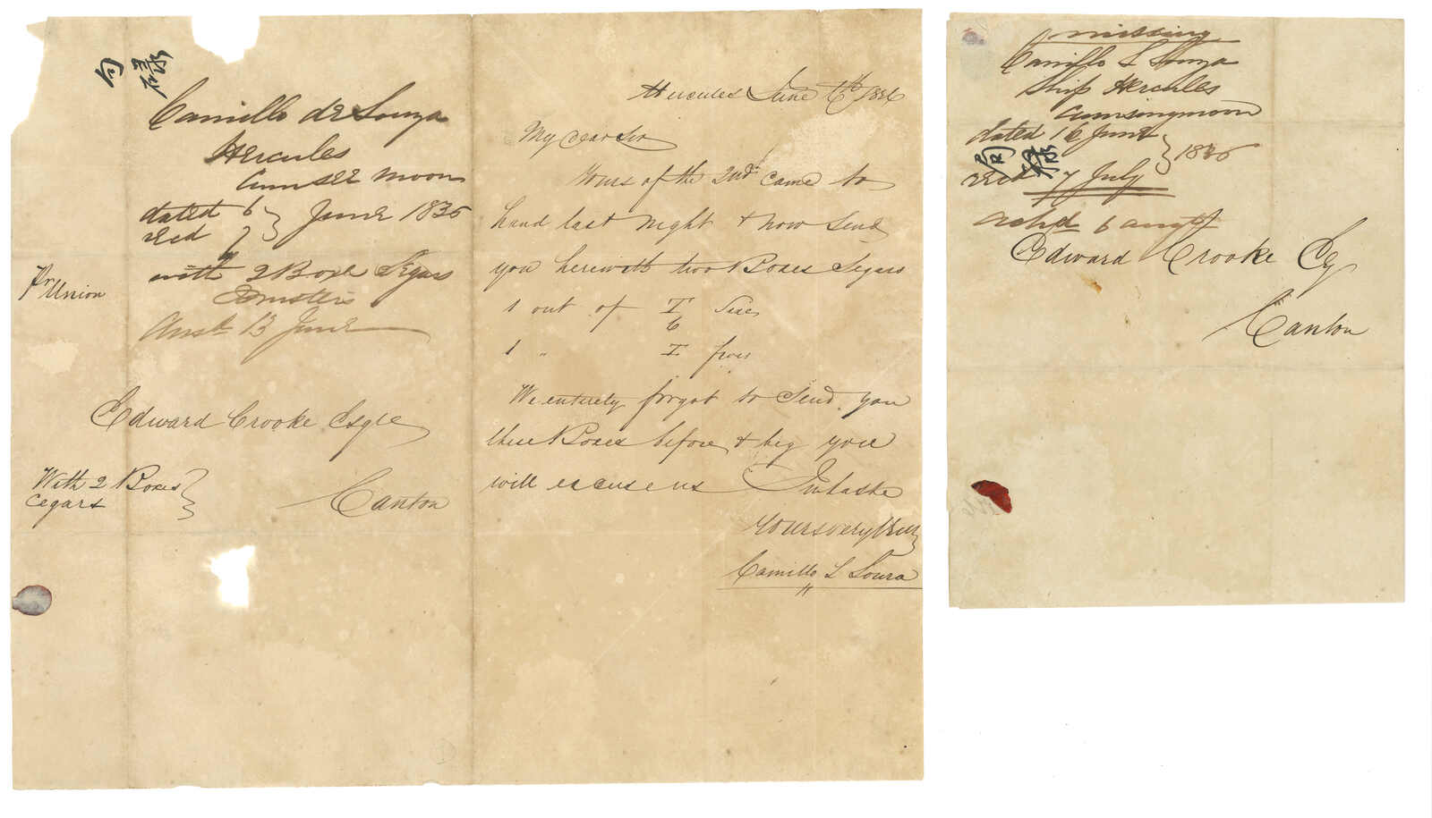 鴉片煙快速大飛艇“Hercules”: 1836年3月26日寫於金星門往廣州 的 Hercules之信函, 寄給廣州的Edward Crook。(Image 1) (Image 2)