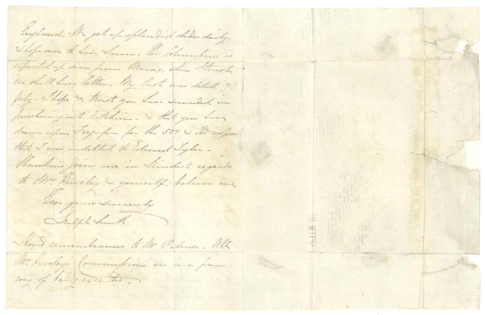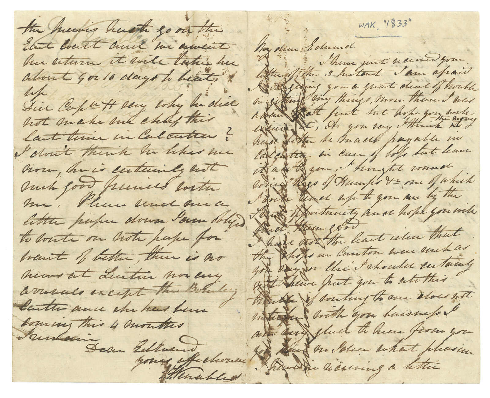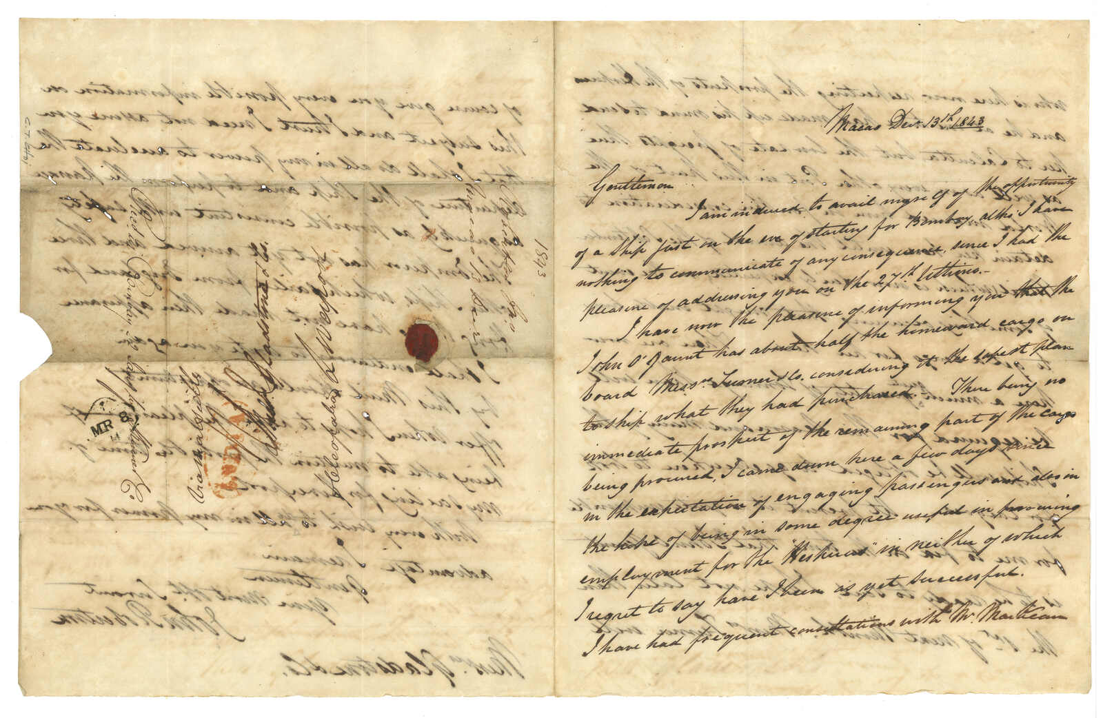 1833 cover imageA group of 3 letters around in 1840s around First Opium War period. All three sent from Macao to United Kingdom. One letter cover dated 19 June 1840, with a black handstamp of “SHIP LETTER”, manuscript rate mark of “8(d)” on the front side. On the reverse, cancelled by Liverpool arrival c.d.s. date 18 Nov 1840 in red. Two complete entire letters of Gladstone & Co. dated 13 Dec 1843, transited to UK via Bombay forward Shinner & Co in manuscript, arrival datestamp on 8 March. The letters mentioned the normalization of trade business albeit some tensions remained between the two countries after the end of First Opium War. Turner & Co is also an active UK merchant which often involved opium trading during the First Opium War.(Image 1) (Image 2) (Image 3)