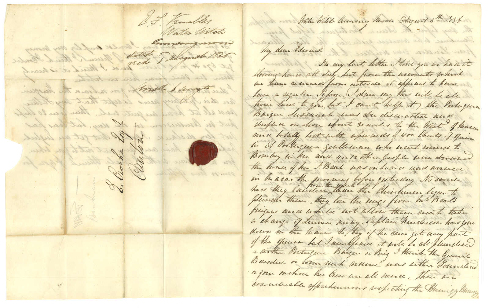 鴉片煙快速大飛艇“Water Witch水之女巫號 ”: 1836年7-8月寄廣州Edward Crooke, 此信函寫於金星門 (位處廣州河入口 位置) 鴉片走私船Water Witch 送到廣州. 金星門位處廣州河入口位置. 是1830年代鴉片走私船集散之地, 於此地䣃貨在該 島附近停泊的舊船上(充當倉庫之用), 再將鴉片装上較小之快艇, 之後再走私駛往廣州, 黄埔等港口; 此信函内容提及1836 年7-8月走私商走私鴉片煙; 不幸的是船被風吹打至岸邊,在距澳門以西約三十英里的地方觸礁,全船一百一十至一百二十人 一同罹難連同四百多箱鴉片一併完全喪失。(Image 1) (Image 2) (Image 3)