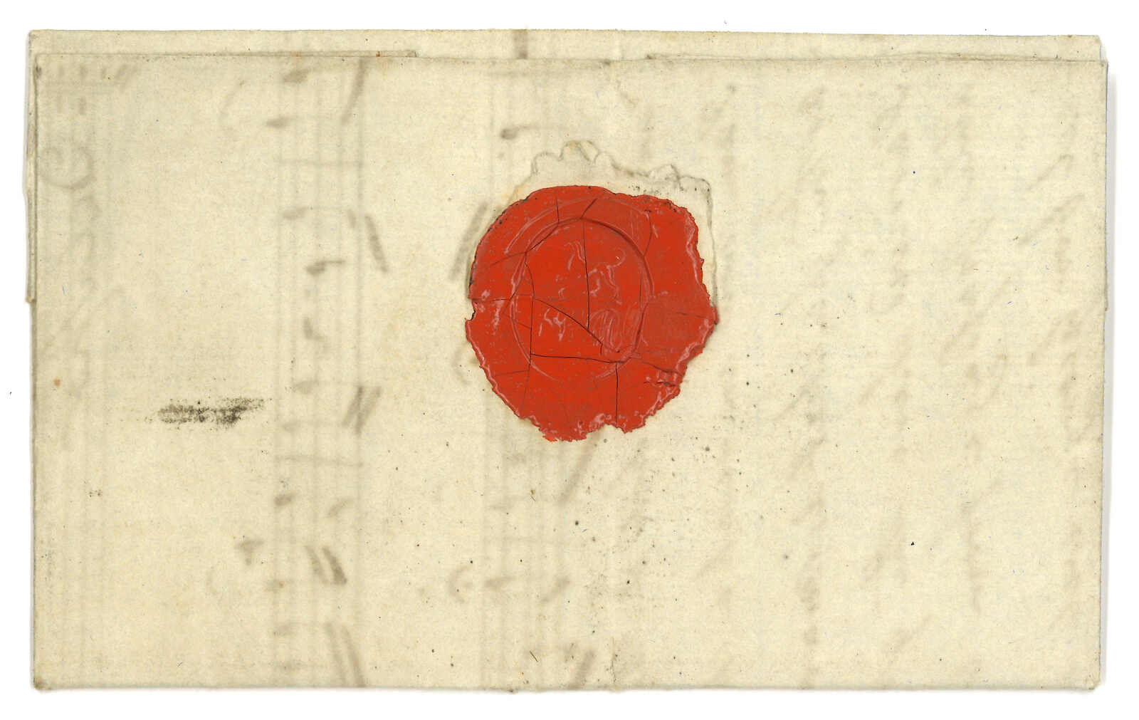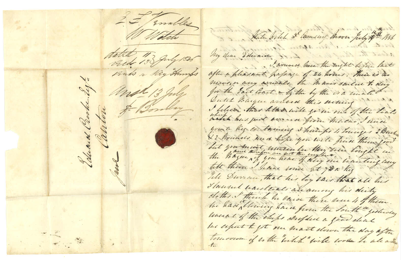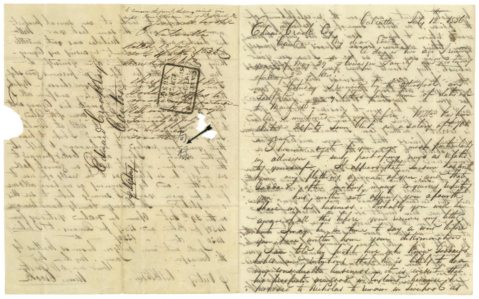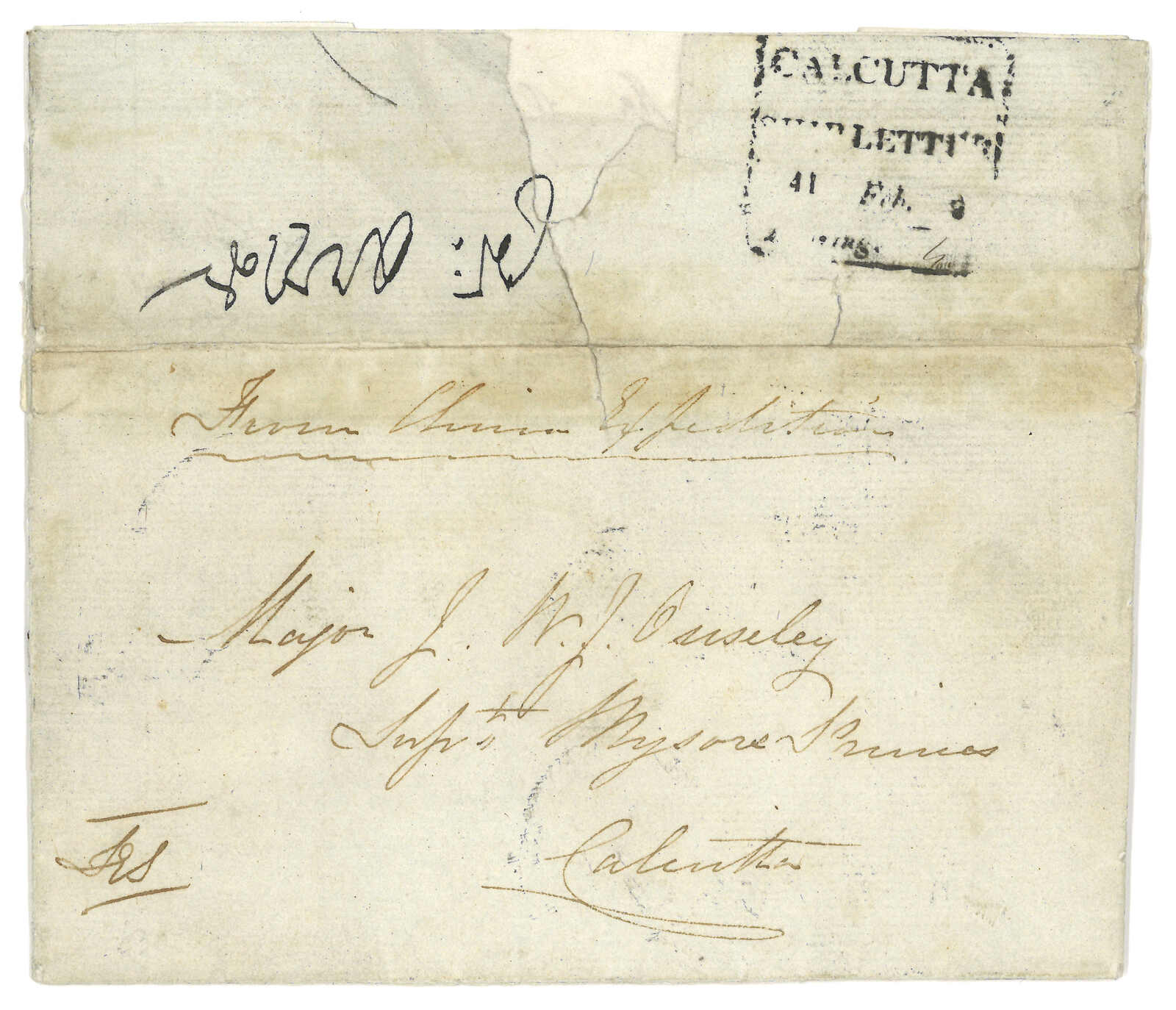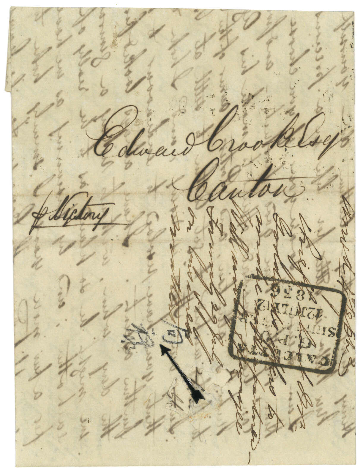 1836.7.12 James Crooke自加爾各答寄廣州之鴉片商人Edward Crooke。郵簡,寫有“p Victory”,鈐加爾各答總局船信日戳。以毛筆寫有Crooke之中文譯名“局祿”。(Image 1) (Image 2) (Image 3) (Image 4)