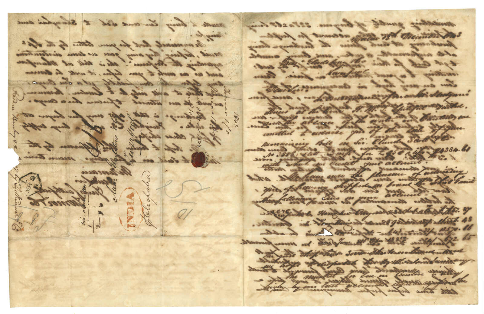 1830 cover imageFirst Opium War – The Opium Trade Opium Clipper Ship Hercules: 1836 (6 June, and 16 June) two letters with separate account written on board the ‘Hercules’ at Cumsingoon Island to Edward Crooke in Canton; there are no postal markings other than two Chinese ink characters ”局碌”on the flap; there is the usual light horizontal filing fold. Very Good mails from Cumsingmoon. Hercules was built at Calcutta in 1814. She traded between Britain and India under a license from the British East India Company, before returning to Calcutta registry. She then traded opium between India and China before becoming an opium receiving ship for Jardine Matheson. In 1839 she was one of the vessels that surrendered her store of opium to be burned at the behest of Chinese officials at Canton. Cumsingmoon is the prominent water gateway of Canton River for the smugglers to privately ship opium chests into Whampoa during 1830s at the beginning of opium smuggling period. A very nice group of opium trade related materials.