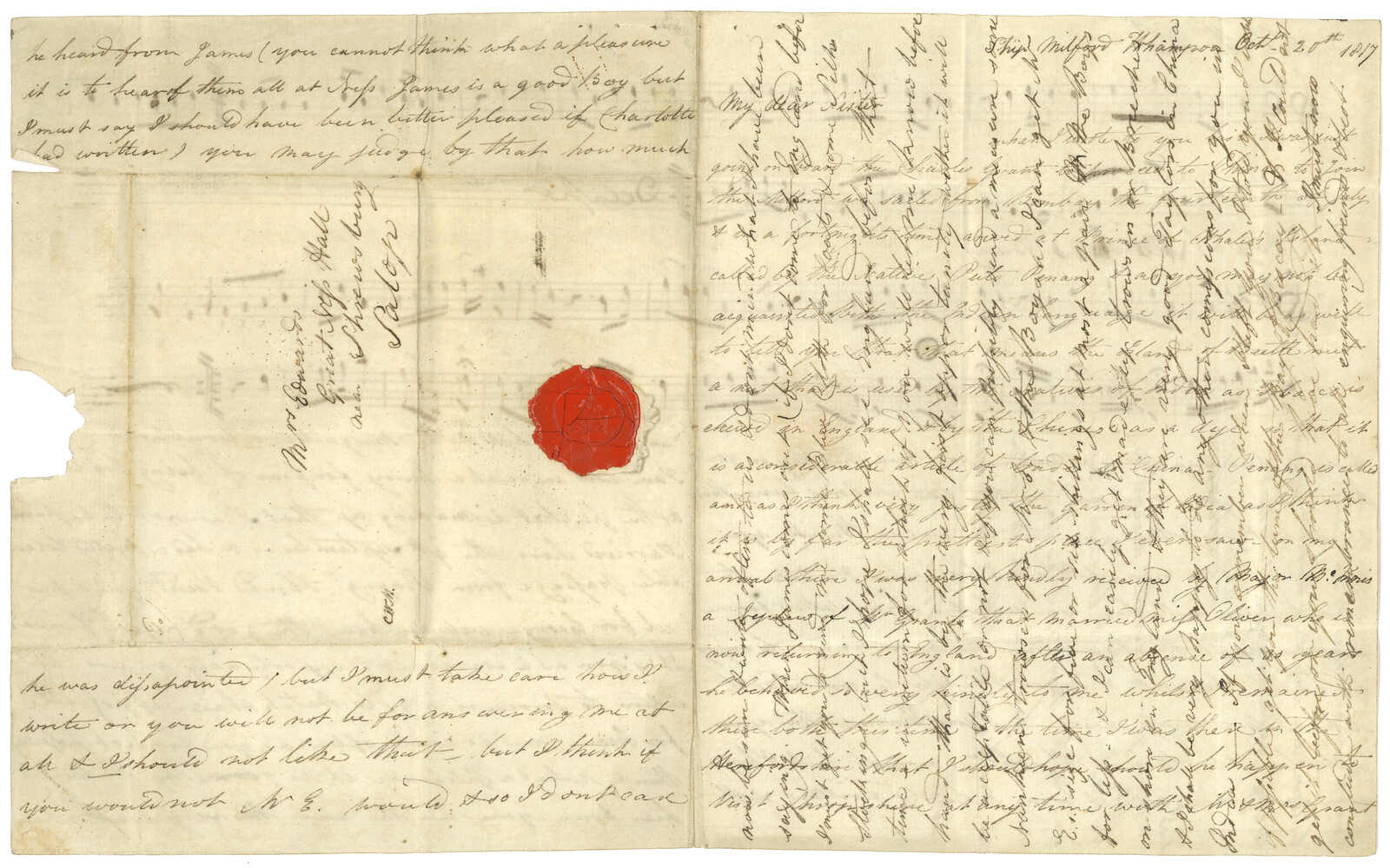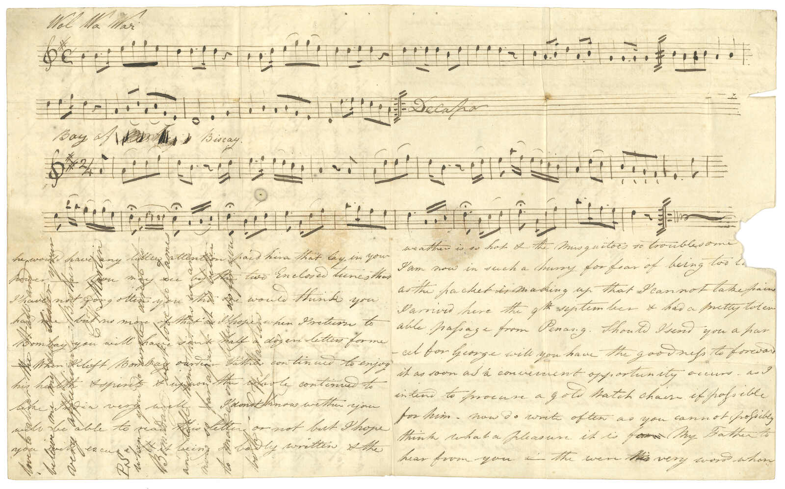 1817.10.20 由停泊於黃埔之Milford號上C.W. Martin寄英國之妹姐。郵簡,未見郵戳。內容為樂譜。他提到中國之氣候“十分炎熱,蚊患擾人”。有趣之早期史前郵件。(Image 1) (Image 2) (Image 3) (Image 4) (Image 5)