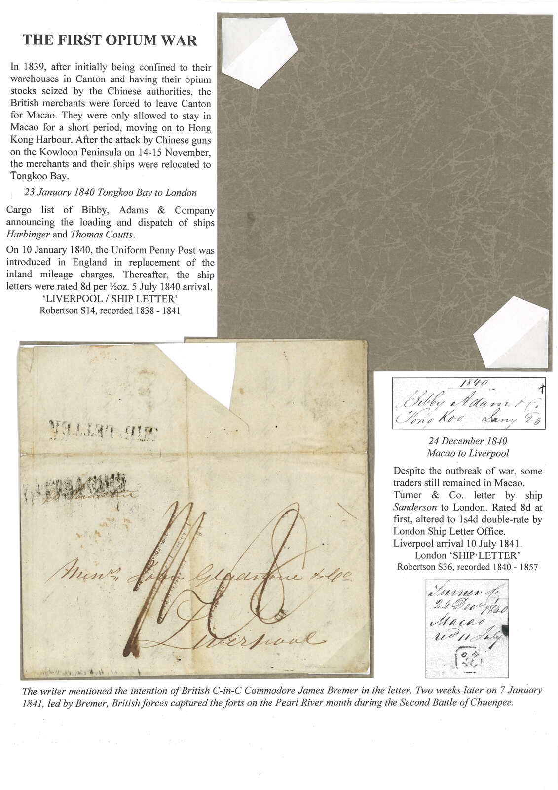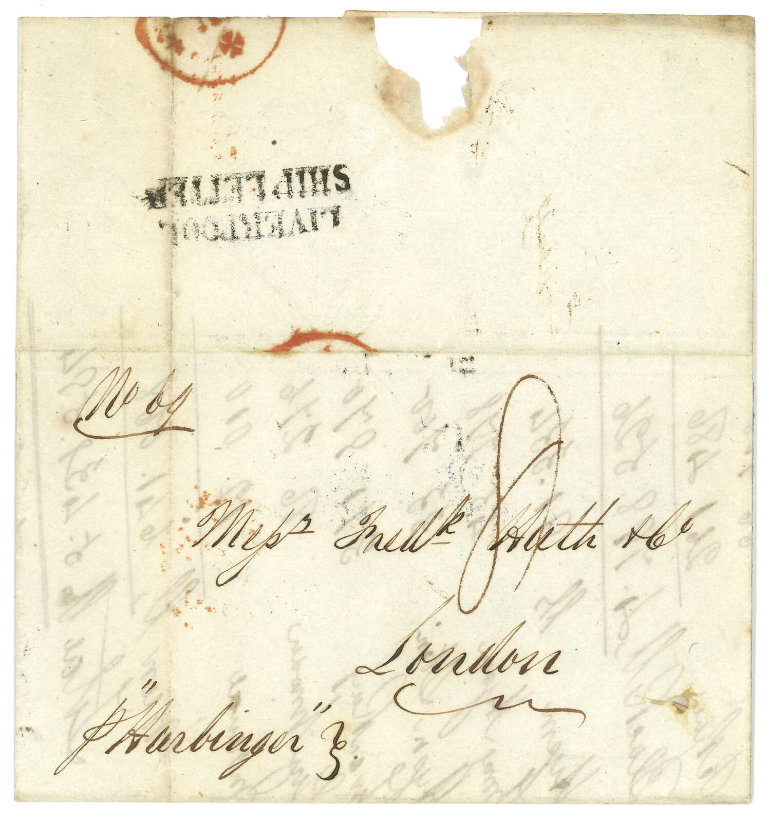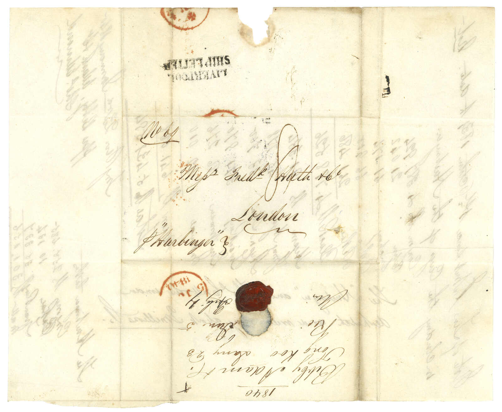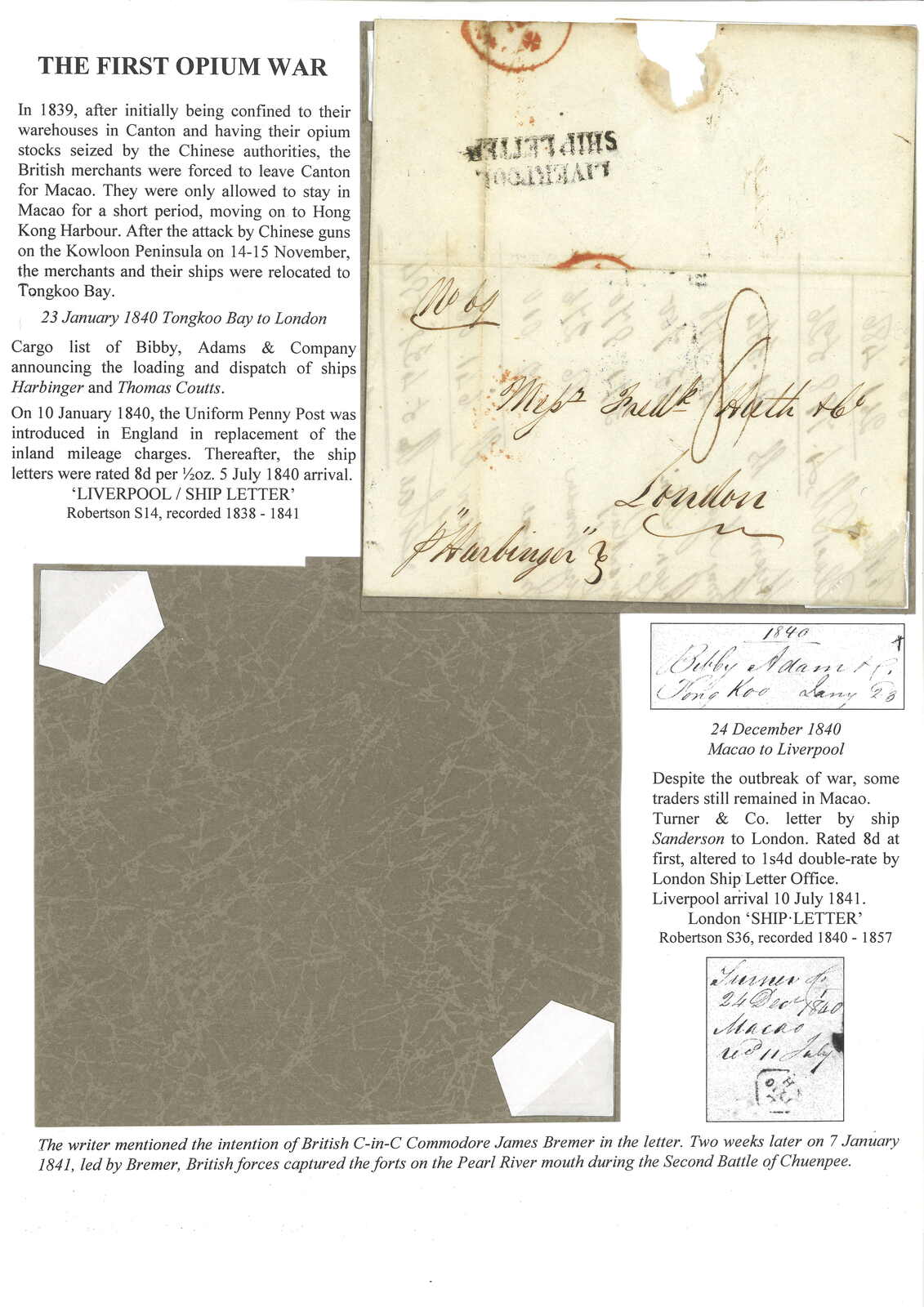 1840.1.23 自銅鼓灣寄倫敦Frederick Huth & Co.。郵簡,寫有郵資“8”及“p Harbinger”,鈐利物浦船信戳。抵倫敦。內容為Bibby, Adams & Co有關Harbinger及Thomas Coutts號之裝卸貨品清單。當中Thomas Coutts號為1839年10月對義律拒絕代表英商具結的命令置之不理,並於10月15日駛入黃埔具結貿易之船隻之一。 第一次鴉片戰爭爆發後,於1839年年底前英國商人從廣州和澳門撤出,英國的船隻最初在香港水域避難。不過位處在九龍半島的中國炮台有對香港進出港口的船隻進行炮轟,從11月14日起,大部份外國船隻遷往銅鼓灣(大嶼山以北)較安全的停泊地點。(Image 1) (Image 2) (Image 3) (Image 4) (Image 5)