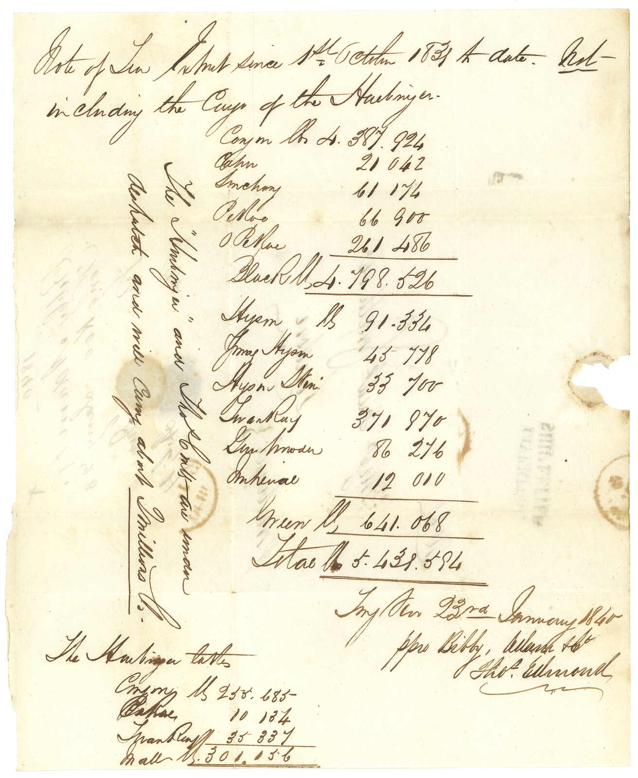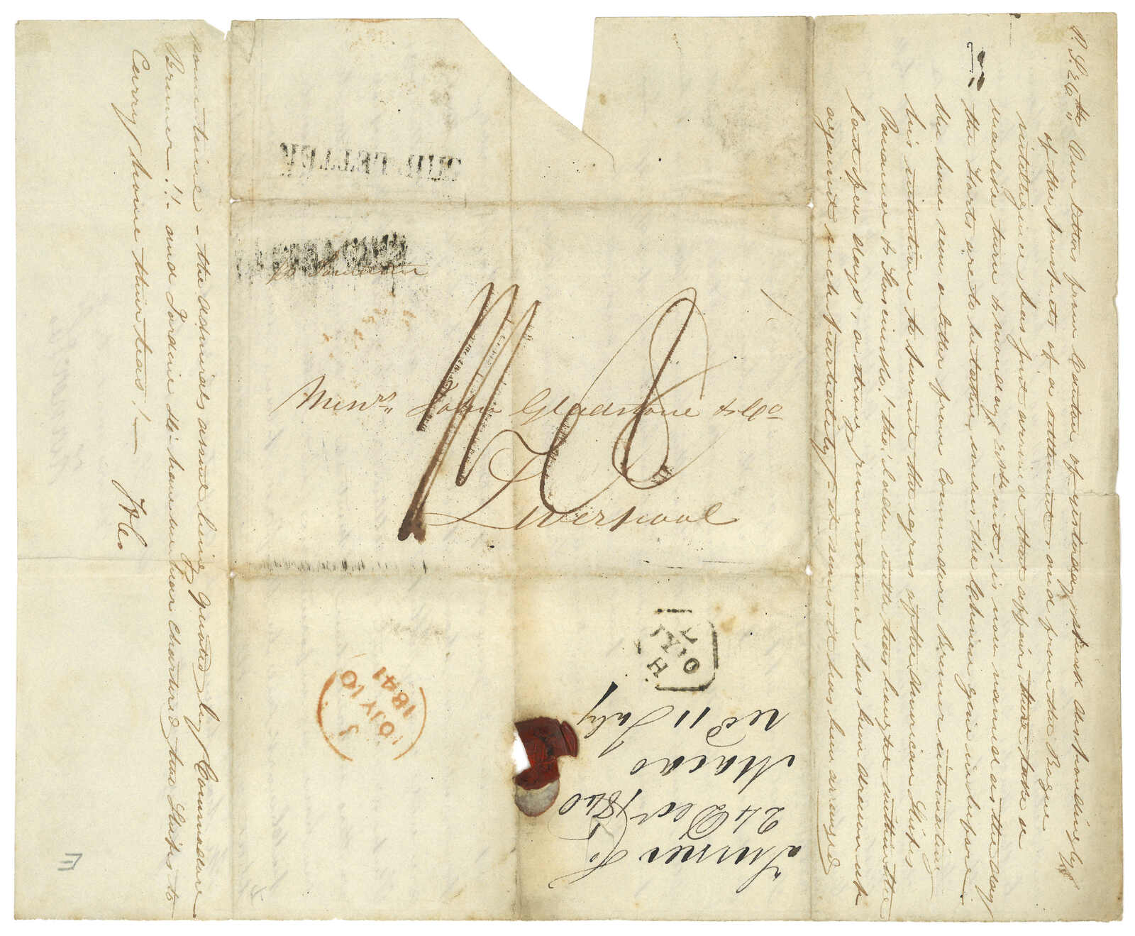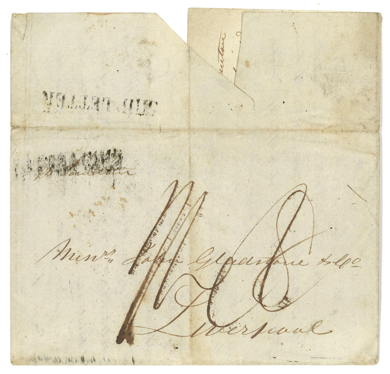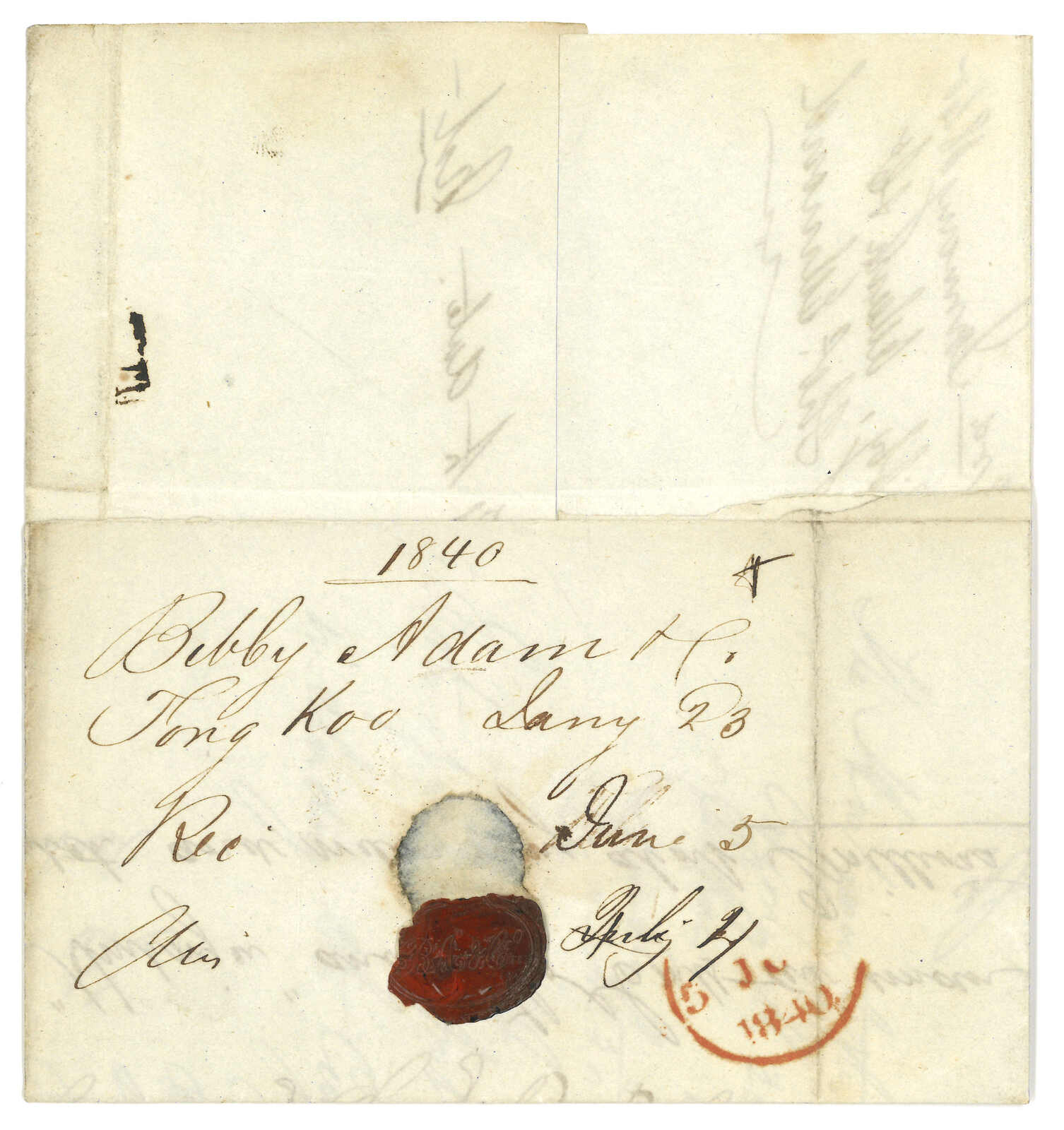 1840.1.23 自銅鼓灣寄倫敦Frederick Huth & Co.。郵簡,寫有郵資“8”及“p Harbinger”,鈐利物浦船信戳。抵倫敦。內容為Bibby, Adams & Co有關Harbinger及Thomas Coutts號之裝卸貨品清單。當中Thomas Coutts號為1839年10月對義律拒絕代表英商具結的命令置之不理,並於10月15日駛入黃埔具結貿易之船隻之一。 第一次鴉片戰爭爆發後,於1839年年底前英國商人從廣州和澳門撤出,英國的船隻最初在香港水域避難。不過位處在九龍半島的中國炮台有對香港進出港口的船隻進行炮轟,從11月14日起,大部份外國船隻遷往銅鼓灣(大嶼山以北)較安全的停泊地點。(Image 1) (Image 2) (Image 3) (Image 4) (Image 5)