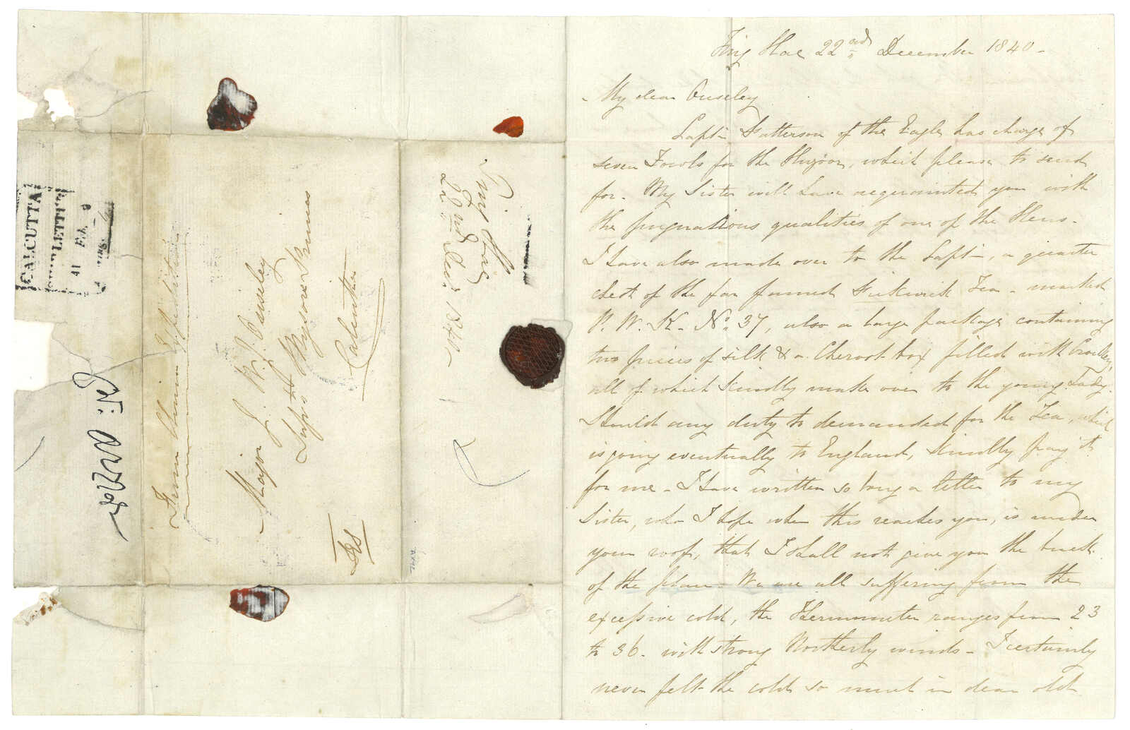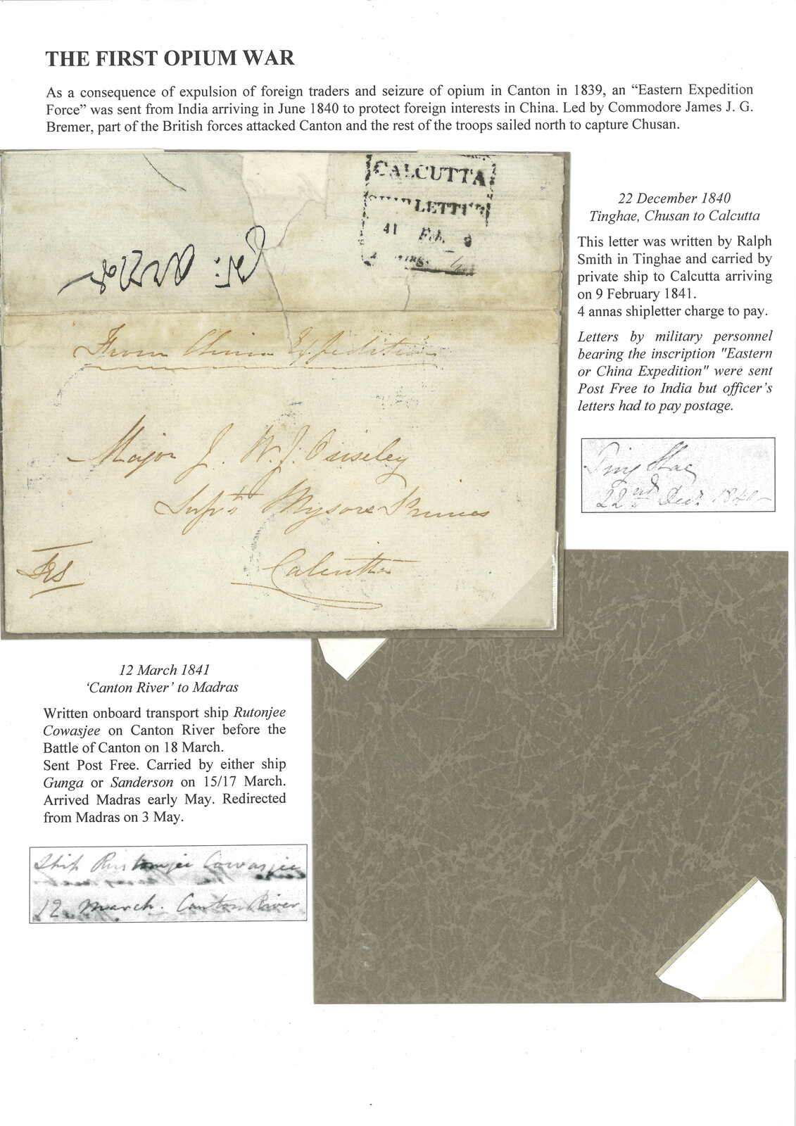 1840.12.22 由Ralph Smith自定海寄加爾各答。郵簡,寫有“From China Expedition”以作免資。抵加爾各答,鈐船信到達戳。英方及清政府均對和談無果感到厭煩,繼而增兵。(Image 1) (Image 2) (Image 3) (Image 4) (Image 5)