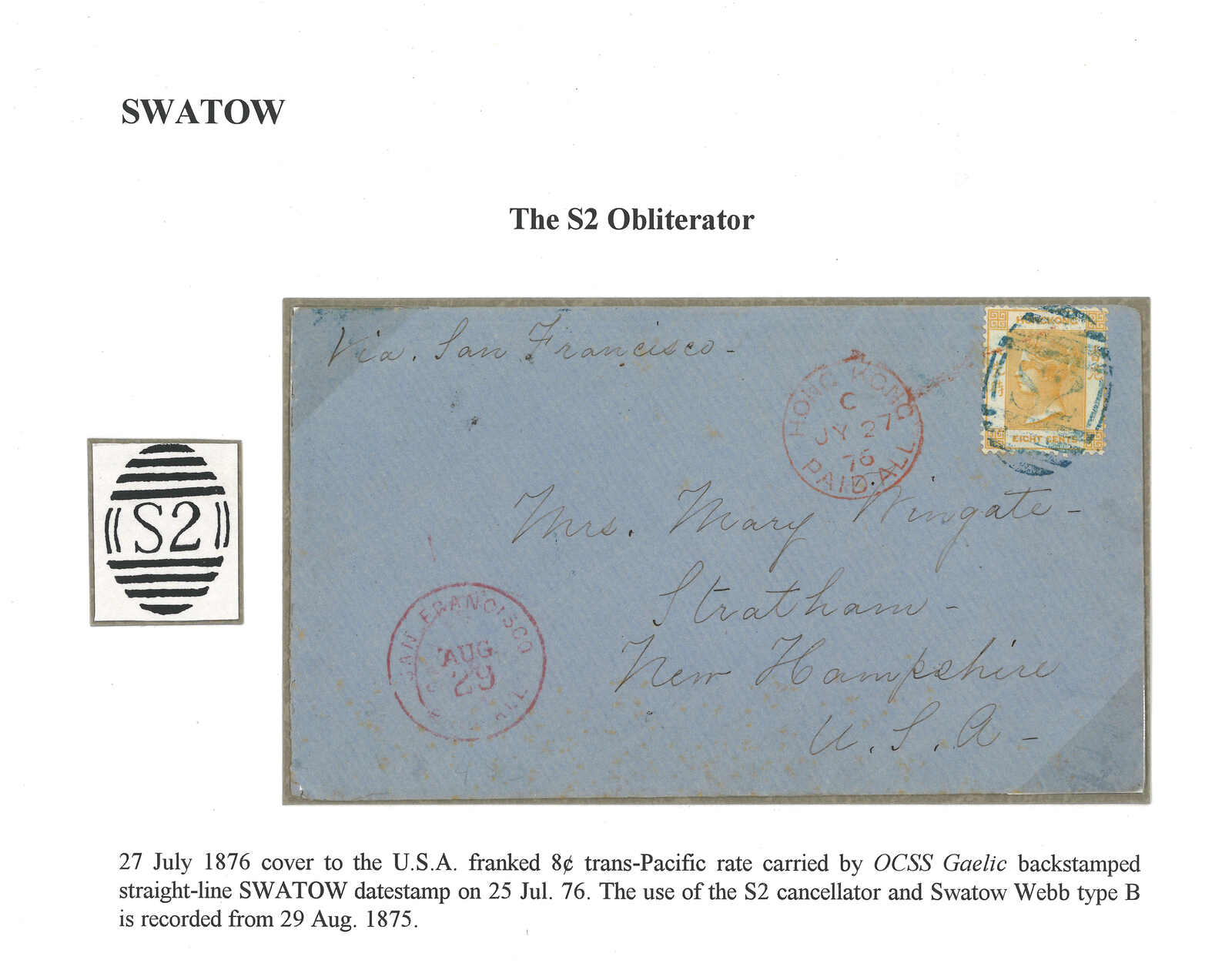 1876.7.27 汕頭寄美國,貼香港維多利亞女皇像2仙,銷少見之S2紫色殺手戳,背面蓋有汕頭英局Webb B型紫色日戳。寫有“Via San Francisco”批示。7.27經香港,鈐PAID ALL紅色中轉戳。8.29經三藩市。S2殺手戳之封片十分少見難得,Webb記錄僅有六件。而按張文德醫生記錄,最早同時蓋有S2及汕頭B型日戳之記錄為1875年8月29日。(Image 1)
