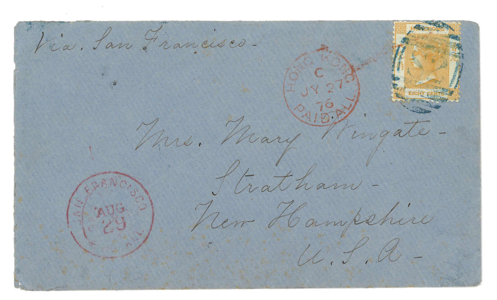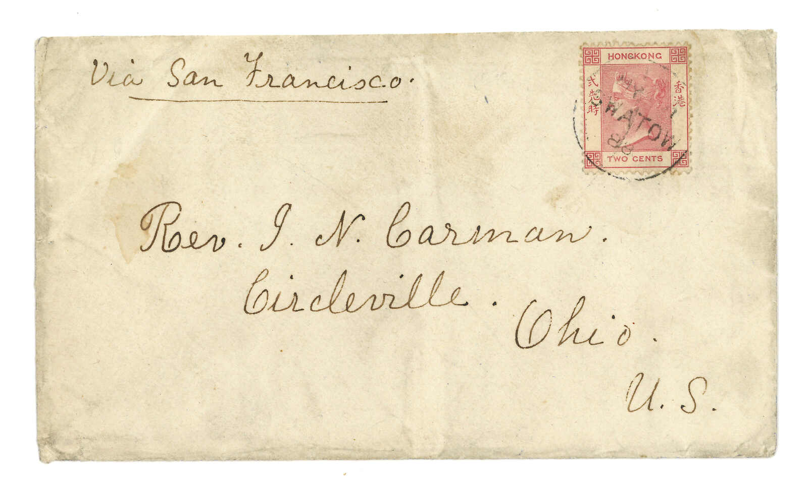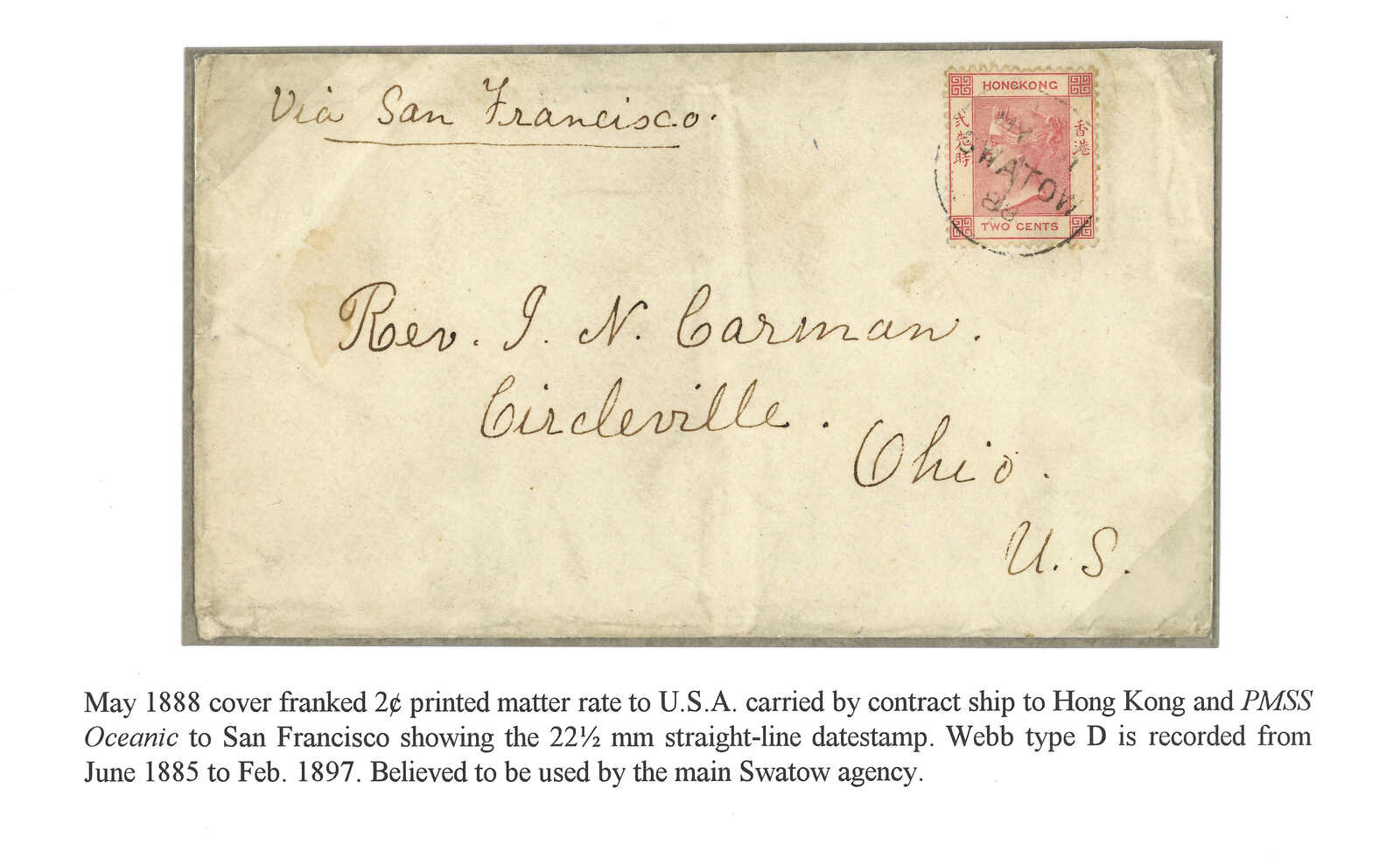 1888.5 汕頭寄美國。印刷品封,貼香港維多利亞女皇像2仙,銷汕頭英局D型日戳。寫有“via San Francisco”批示。封舌缺失。Webb指此戳深受收藏家青睞,蓋於封上的例子僅有兩件。此戳應用於汕頭的主要郵政代理。(Image 1)