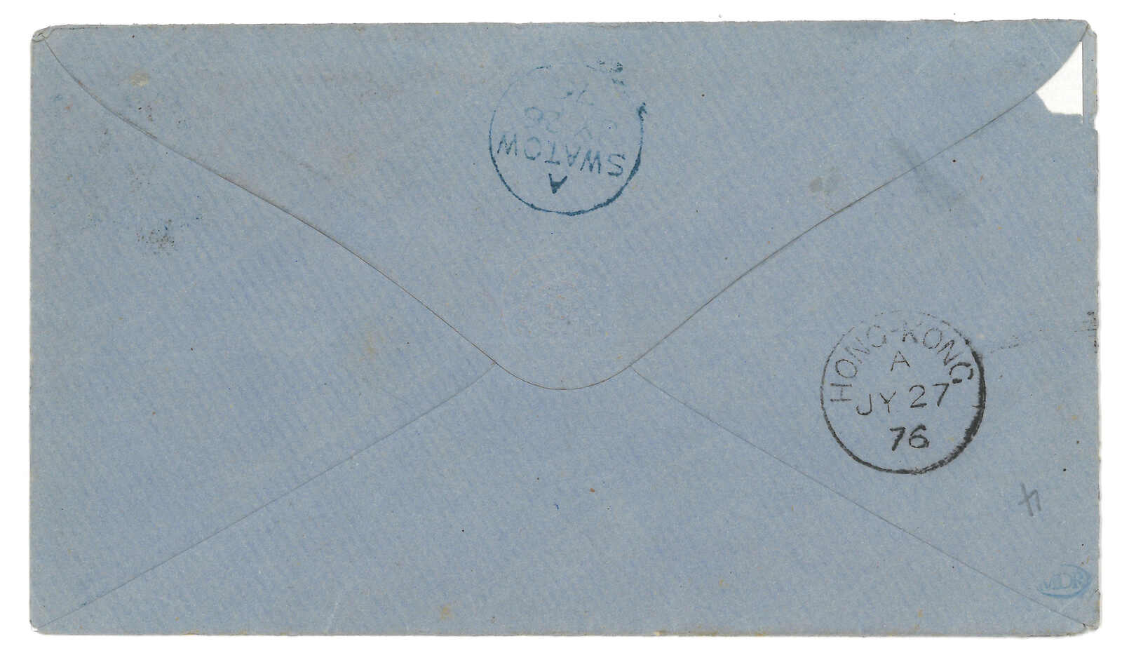 Proud type R6 "SWATOW B.P.O." boxed registered mark. Transit Hong Kong (4 Feb). Index B is also unusual on type I cds.