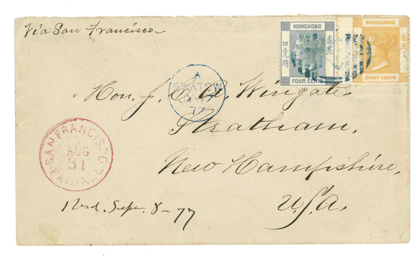 1877 Swatow (17 Jul) to USA, f.w. Hong Kong QV 4c + 8c, tied by scarce S2 obliterator in violet, matching with Swatow BPO Webb type B cds in violet and "Via San Francisco" annotation alongside. Transit Hong Kong (18 Jul).