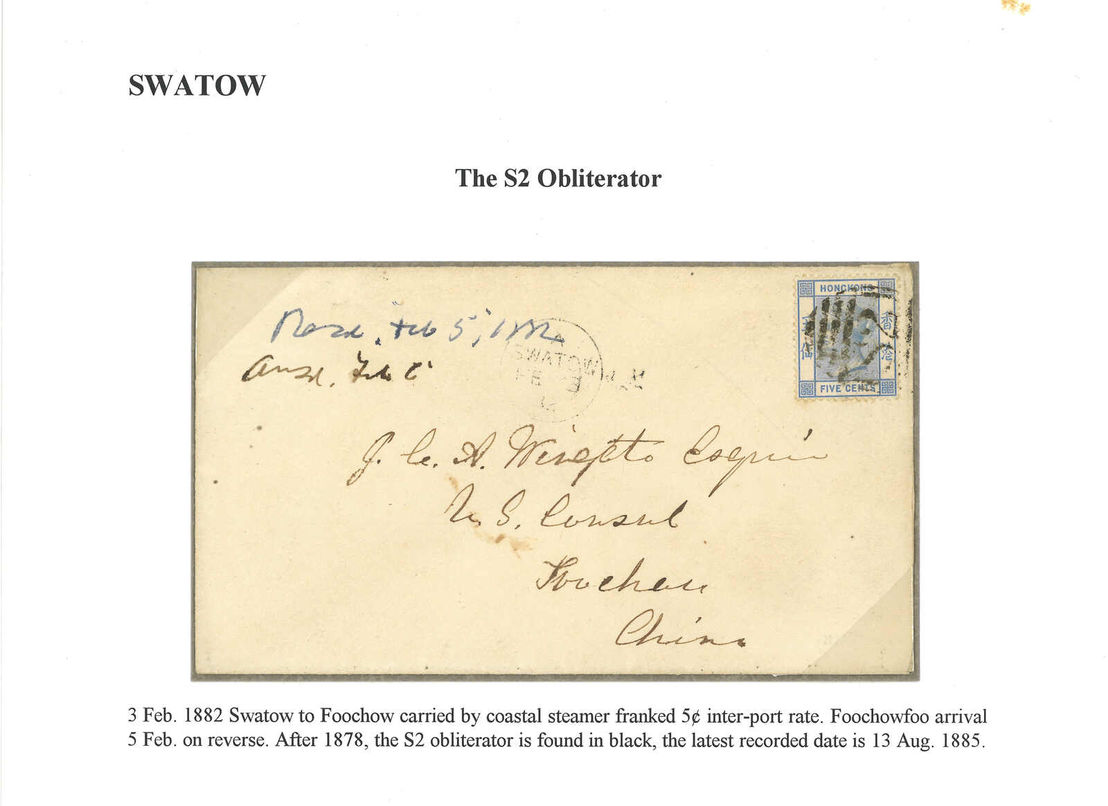 1878 Swatow (3 Feb) to Foochow, f.w. Hong Kong QV 5c, tied by scarce S2 obliterator in black, alongside with Swatow BPO Webb type B cds in black. Arrived Foochow BPO (5 Feb). After 1878, S2 obliterator is found in black.