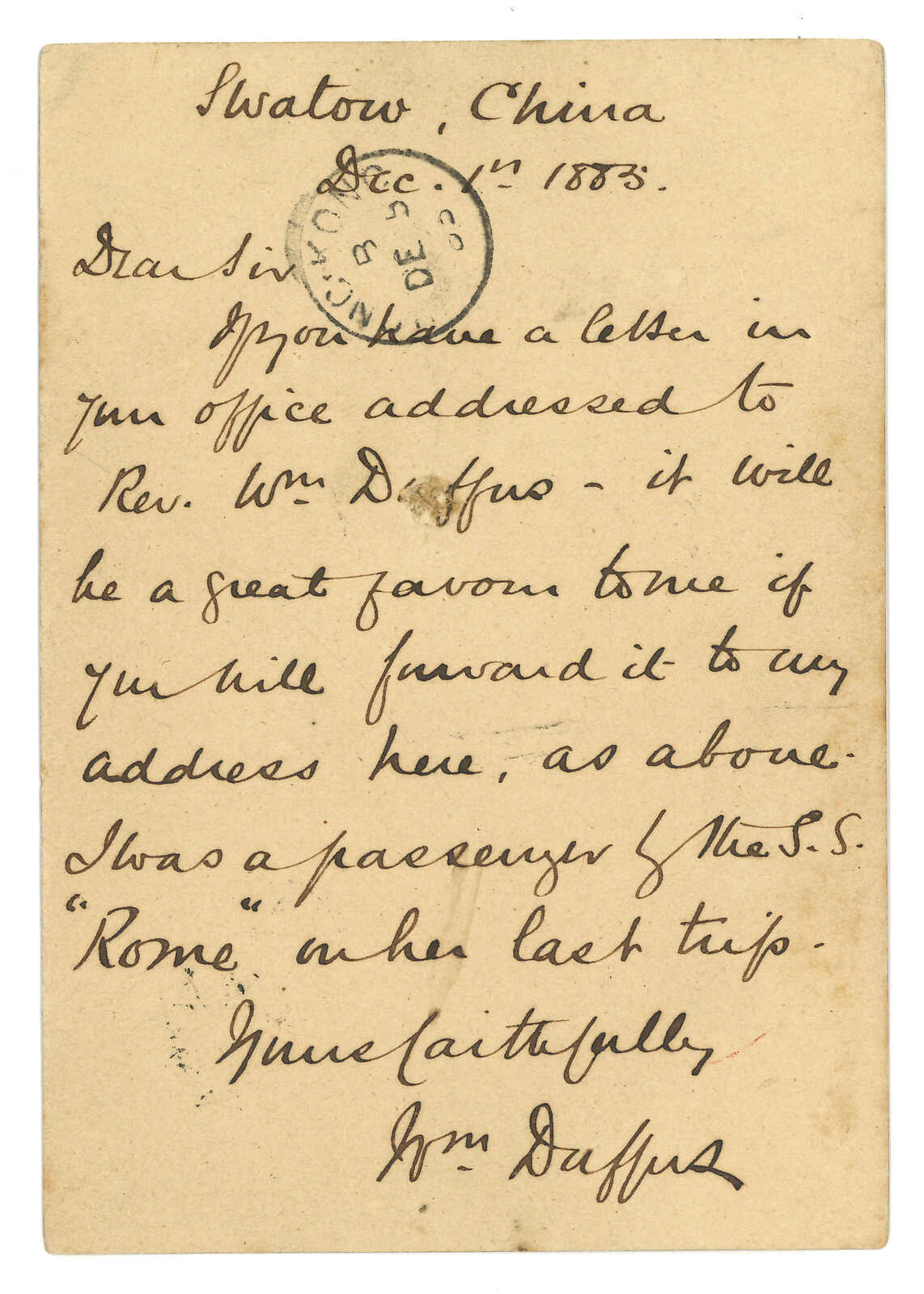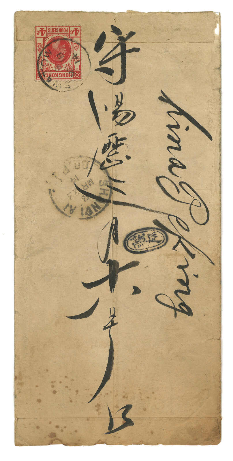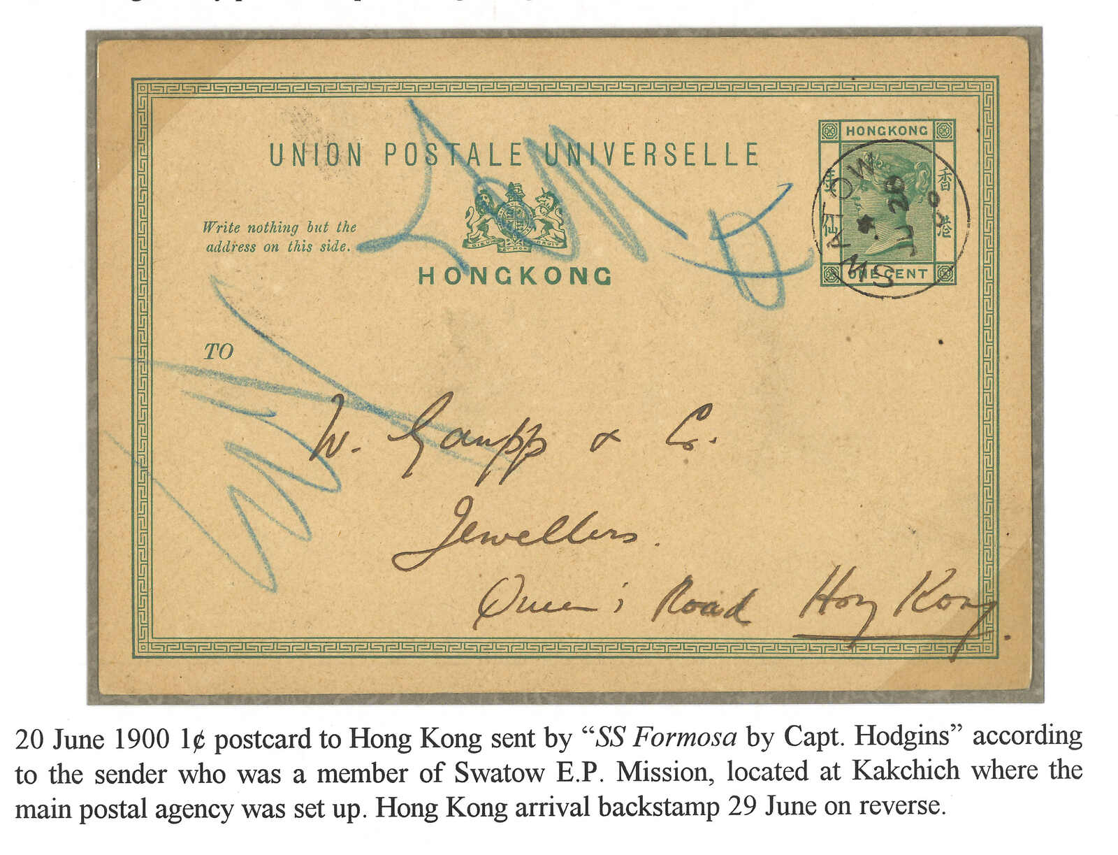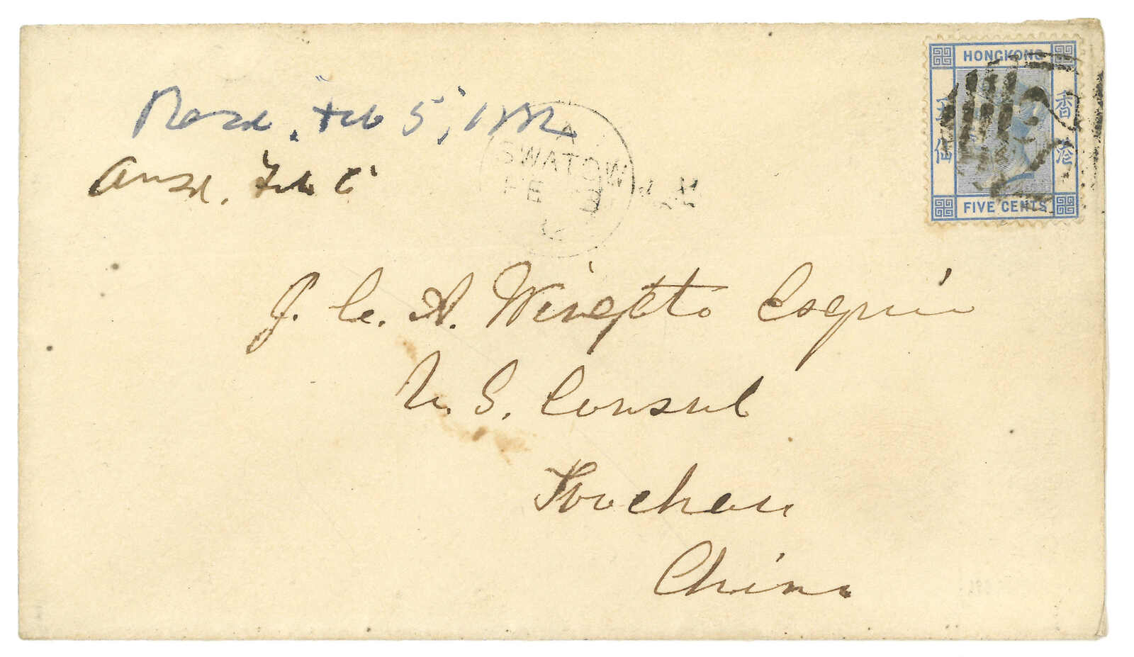 Kong (13 Feb). Arrived Treptow (18 Mar). Second earliest example of this Swatow BPO registered mark.