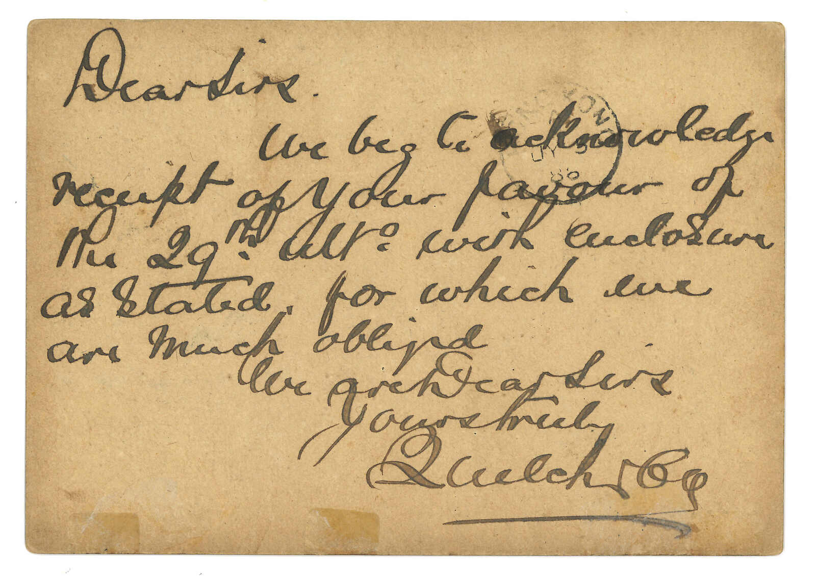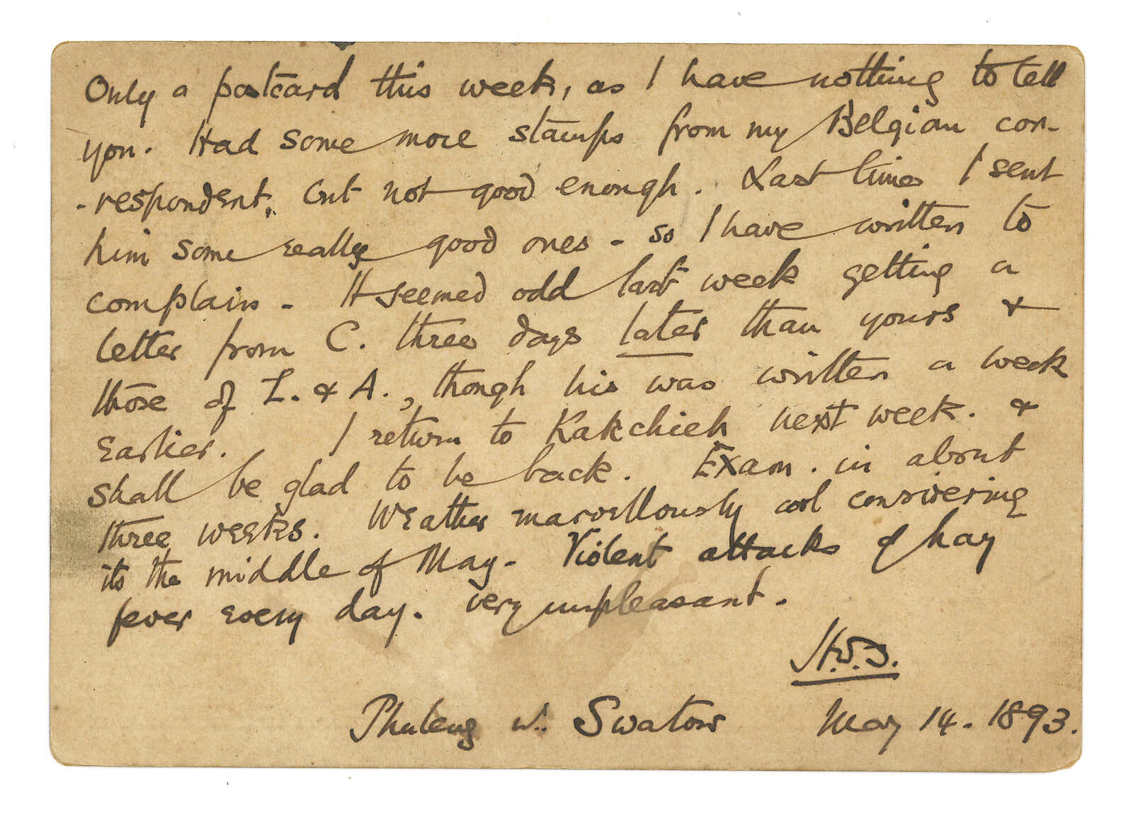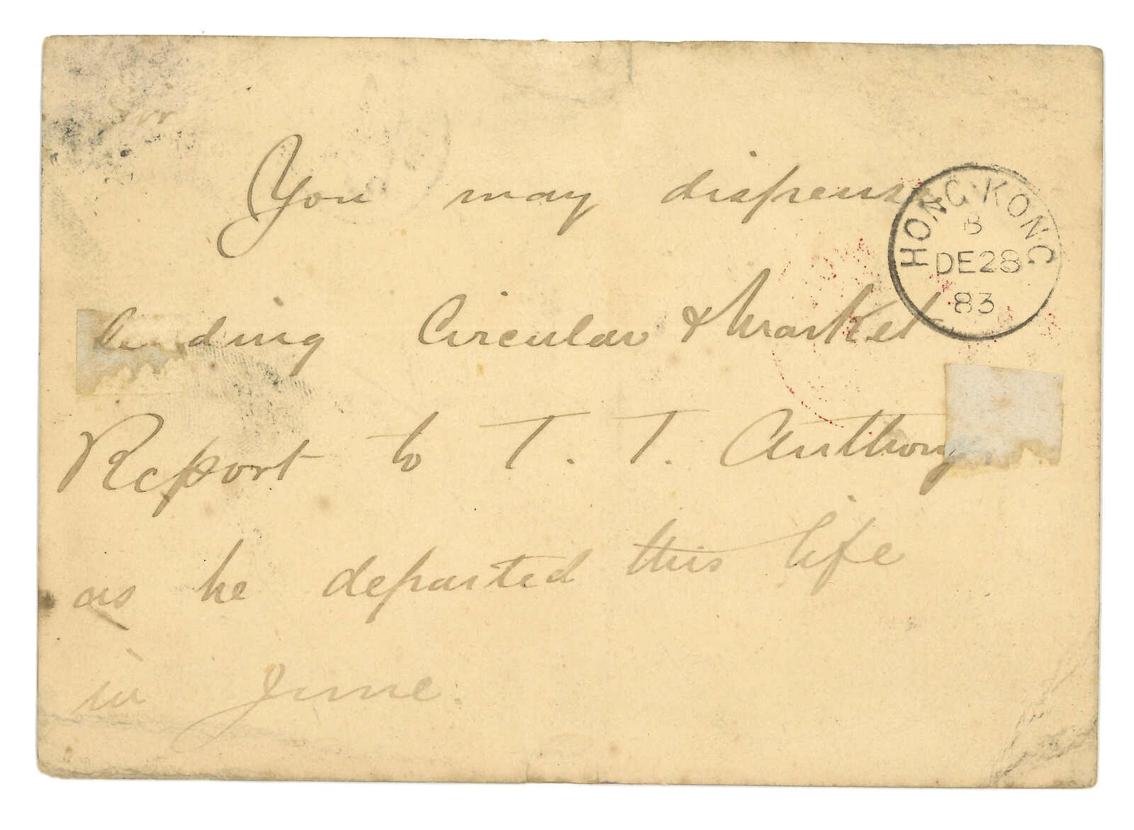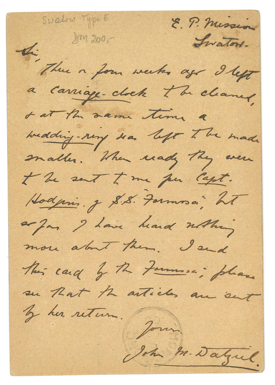 Kong (13 Feb). Arrived Treptow (18 Mar). Second earliest example of this Swatow BPO registered mark.