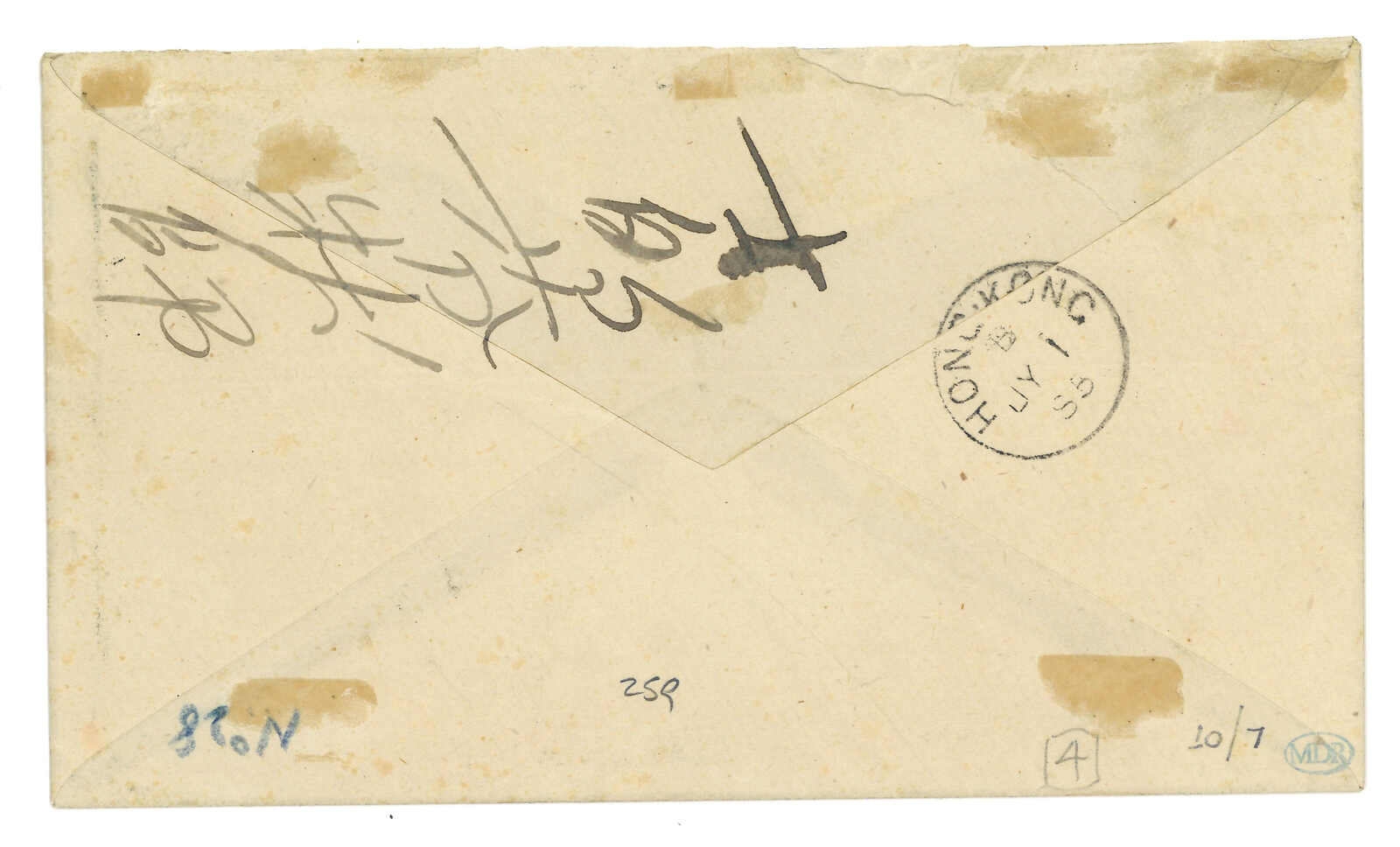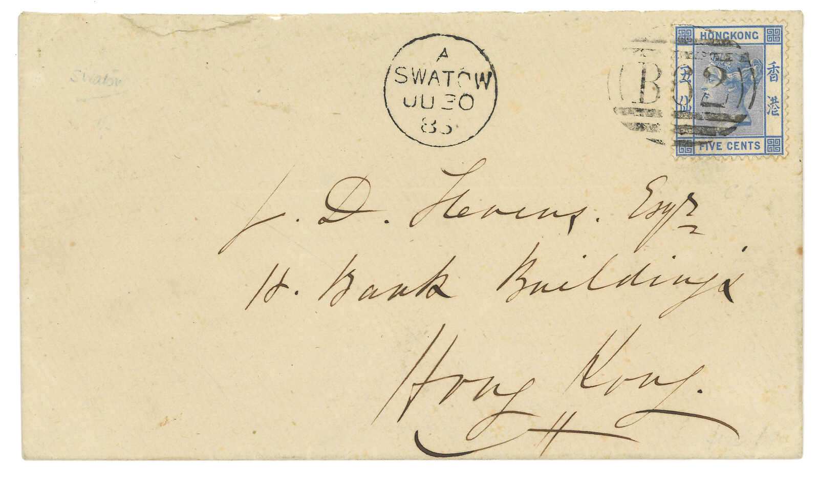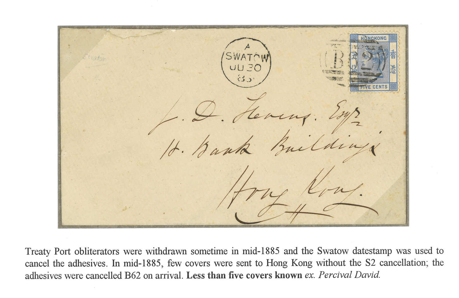 B型黑色日戳。貼香港維多利亞女皇像5仙,銷B62殺手戳,另鈐香港7.1到達戳。Webb指S2殺手戳在1885年下半年連其他商埠之殺手戳一同被停用。此封於離開汕頭時未有銷票,十分奇特難得。大維德爵士舊藏。(Image 1)