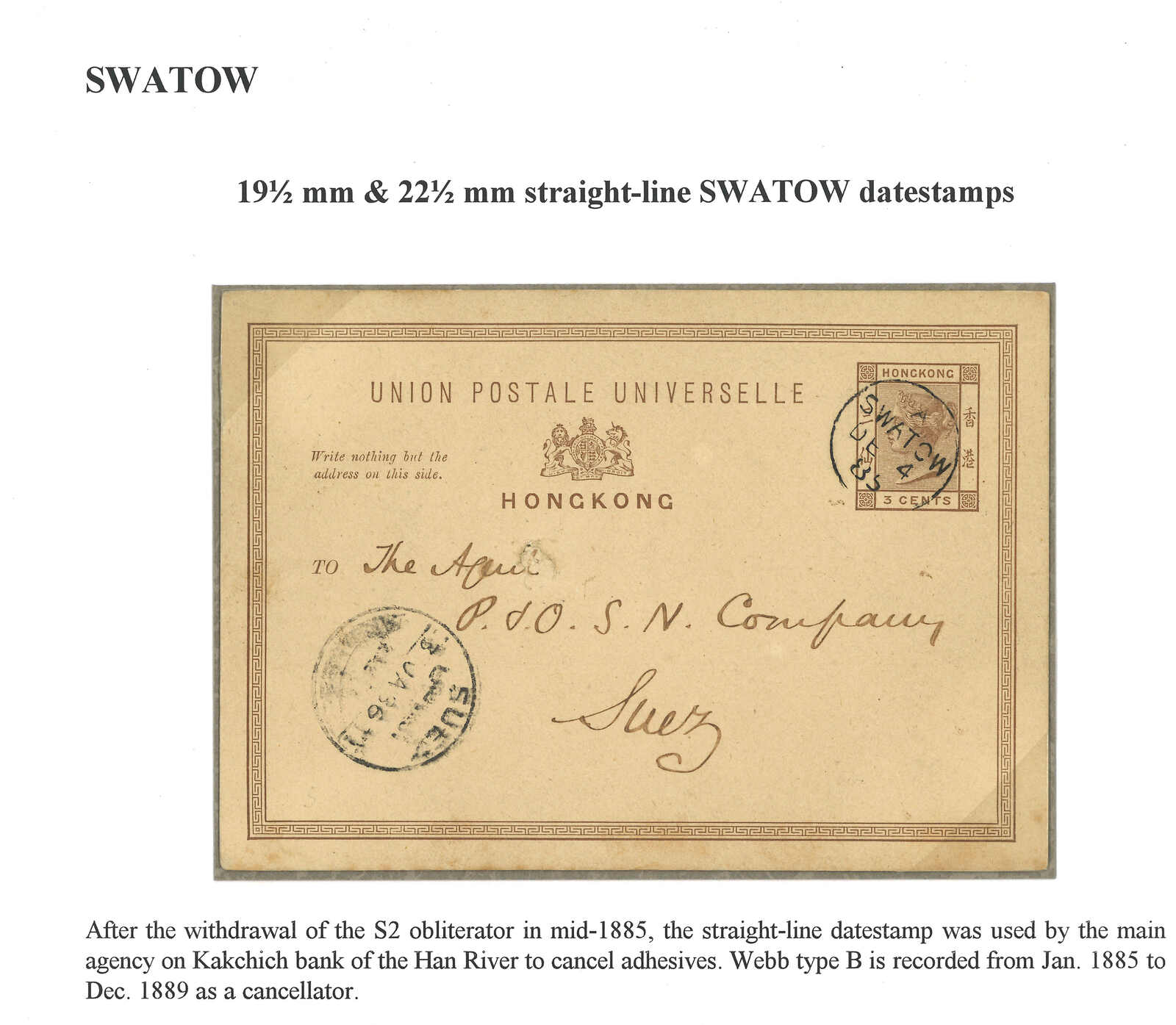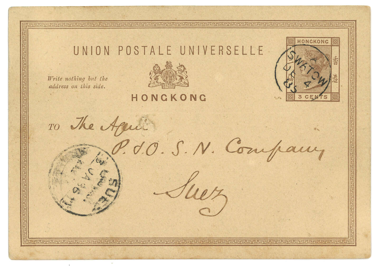 汕頭寄蘇伊士。香港維多利亞女皇像3仙郵資片,銷汕頭英局Webb B型日戳。1.3抵蘇伊士。汕頭B型日戳於1885年1月至1889年12月間用作銷票。(Image 1)