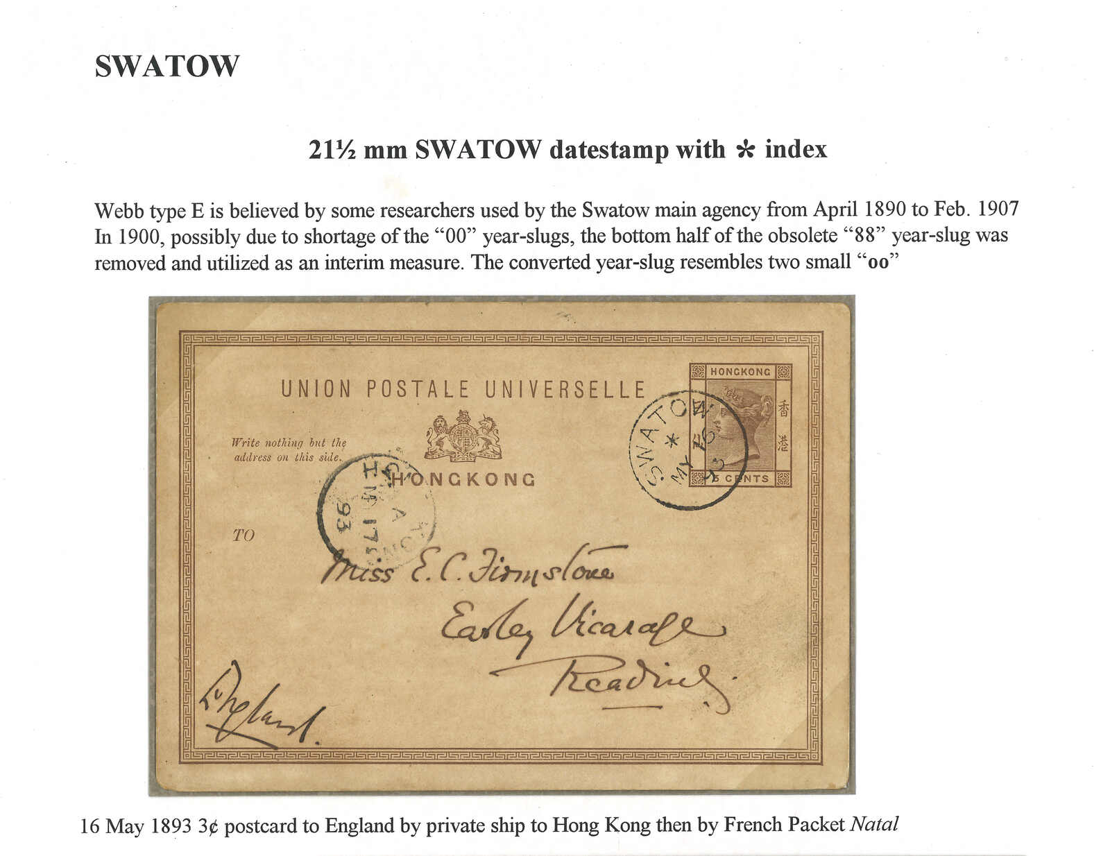 A collection of Swatow BPO Webb type E star cds dated 1900, containing two Hong Kong QV used stamps and one stationery card to Hong Kong, all showcasing short year digit “00”. Webb stated that there was a shortage of the figure