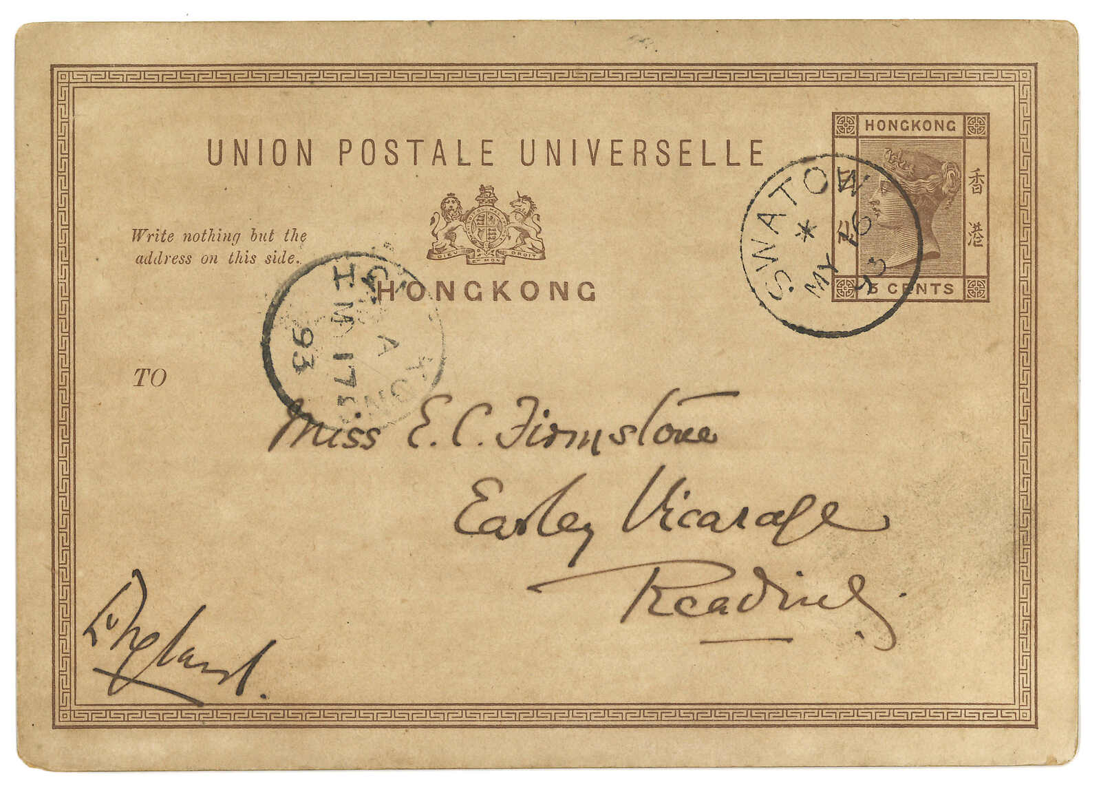 1893.5.16 汕頭寄英國。香港維多利亞女皇像3仙郵資片,銷汕頭英局Webb