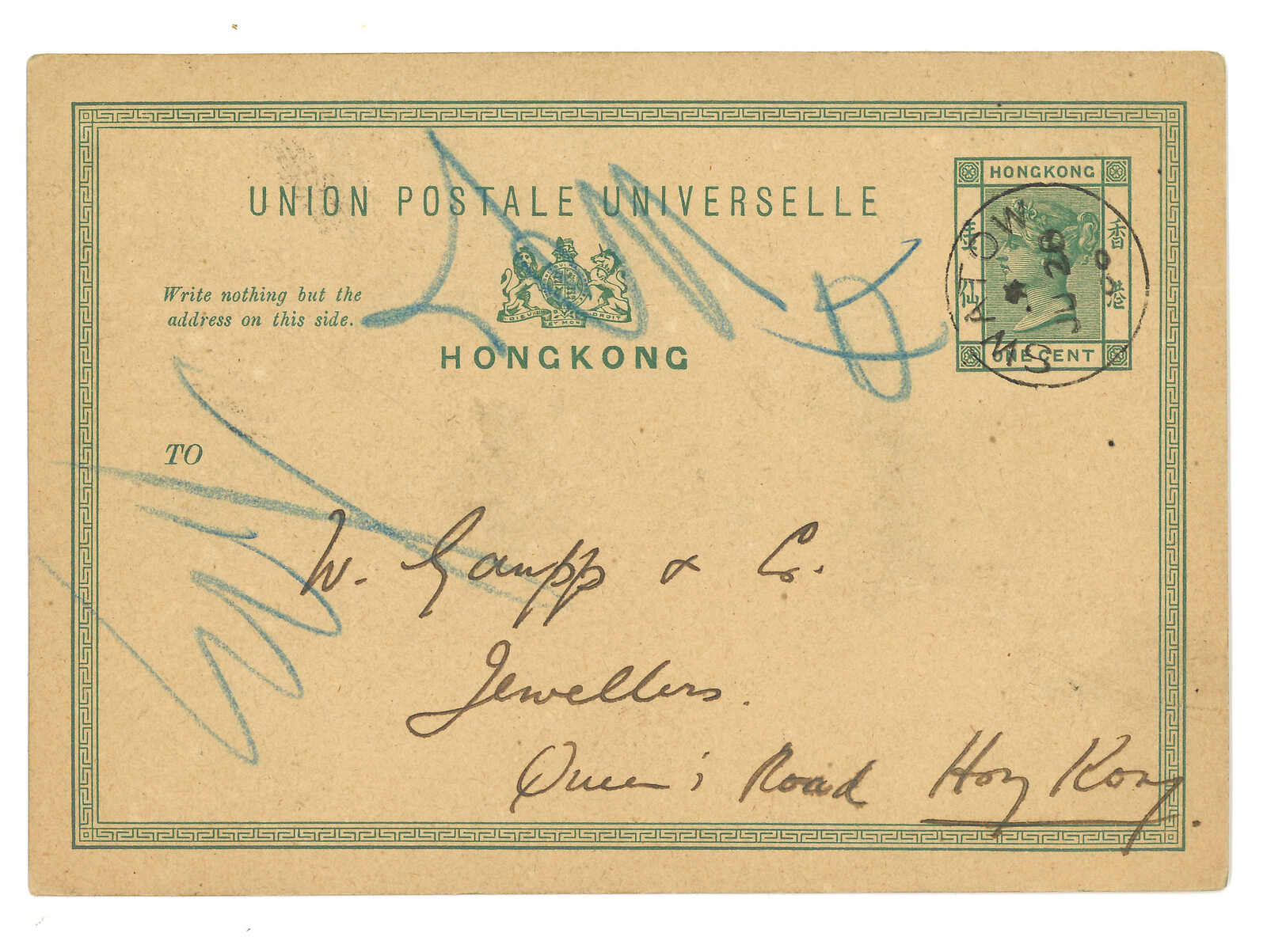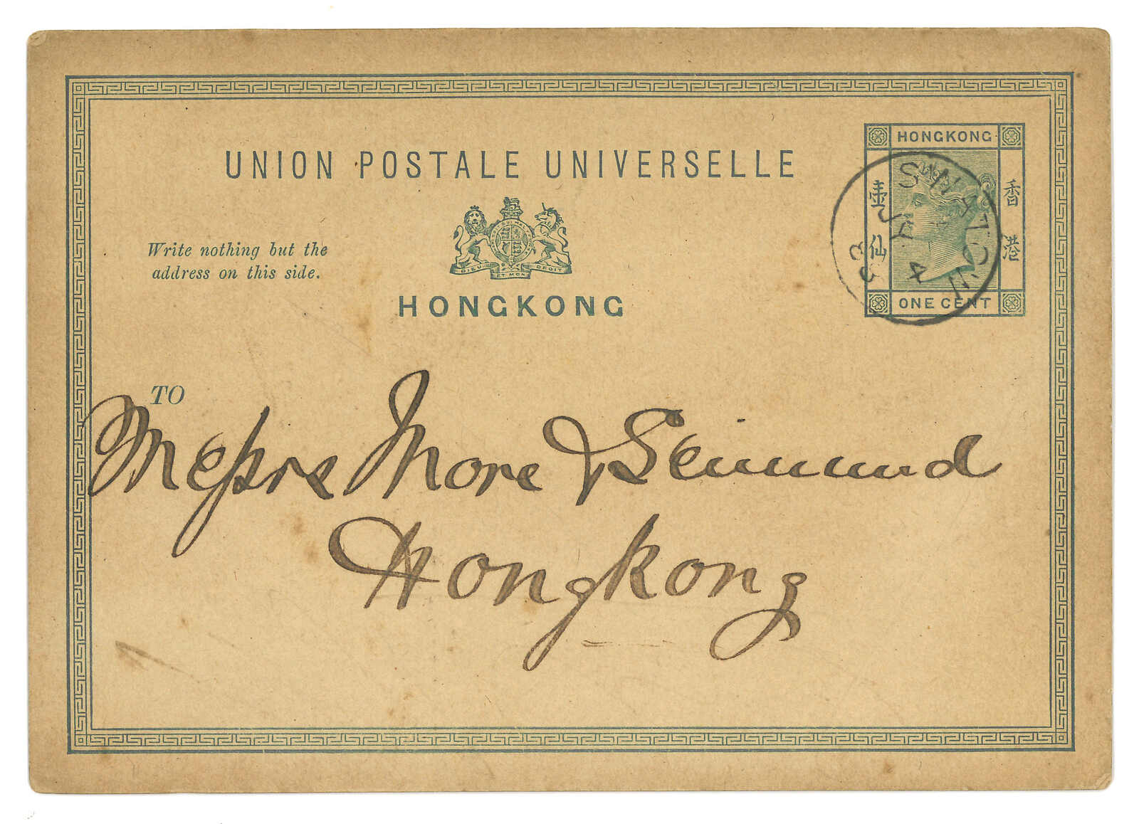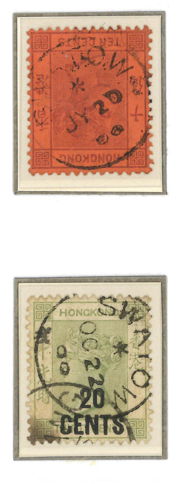 香港維多利亞女皇像10仙舊票及1仙郵資片各一件,均鈐汕頭英局Webb C型日戳。前者年份“00”尤