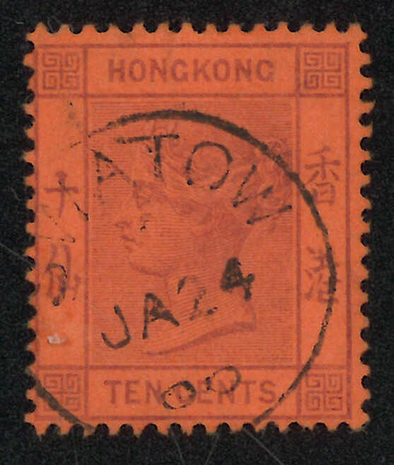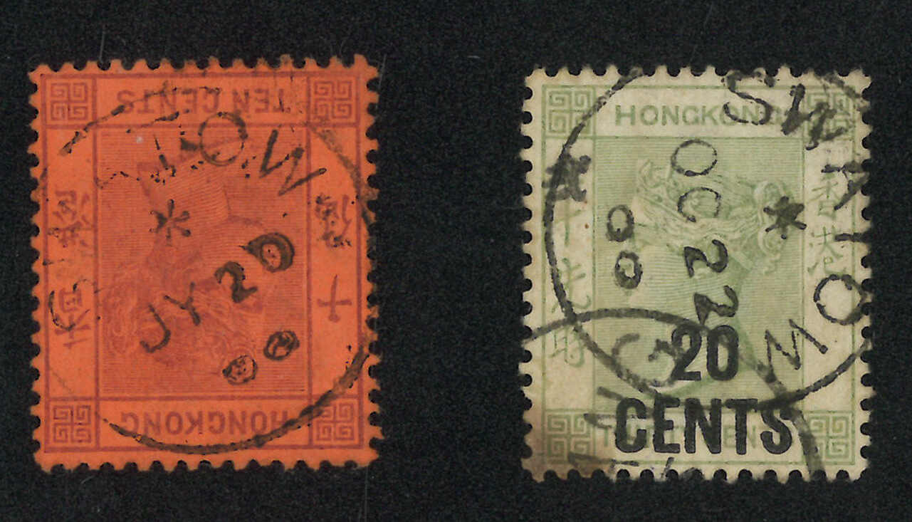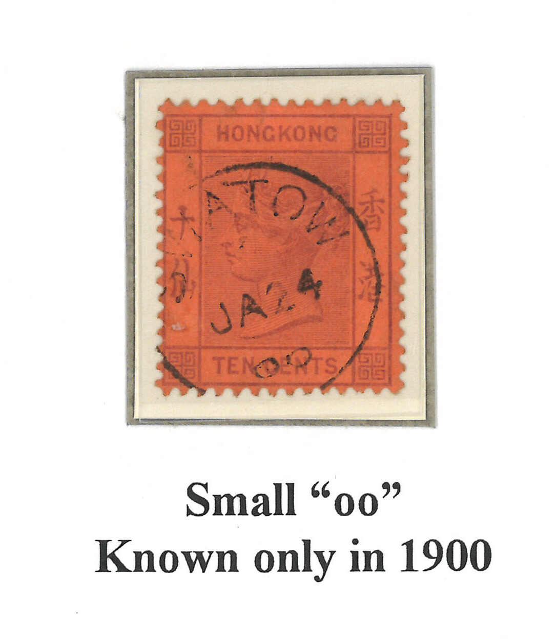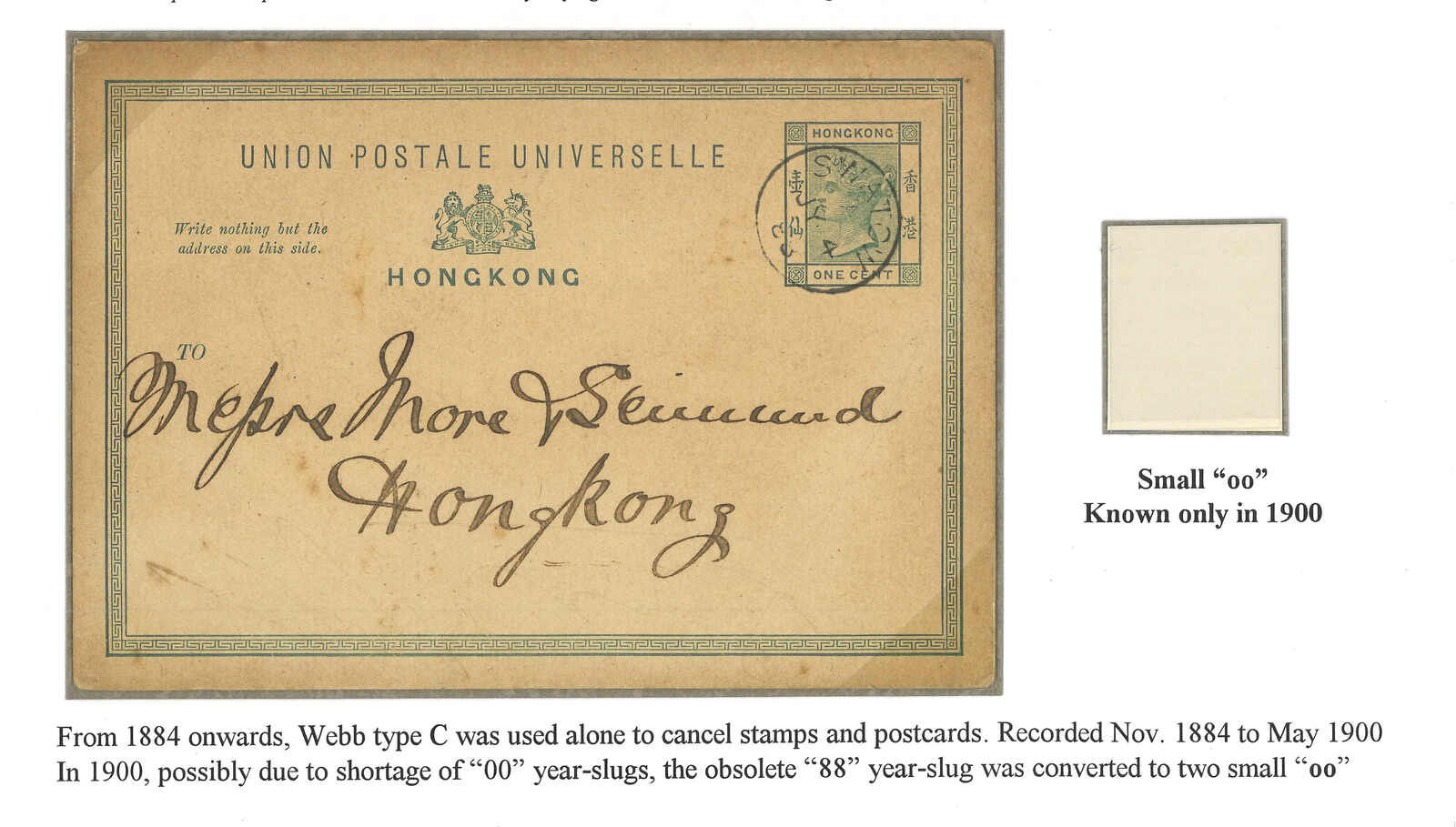 A pair of Hong Kong QV 10c used stamp and a stationery card applied with Swatow BPO Webb type C cds. Fomer showcasing shorter year digit “00”. Webb stated that there was a shortage of the figure 00, therefore the year digits on