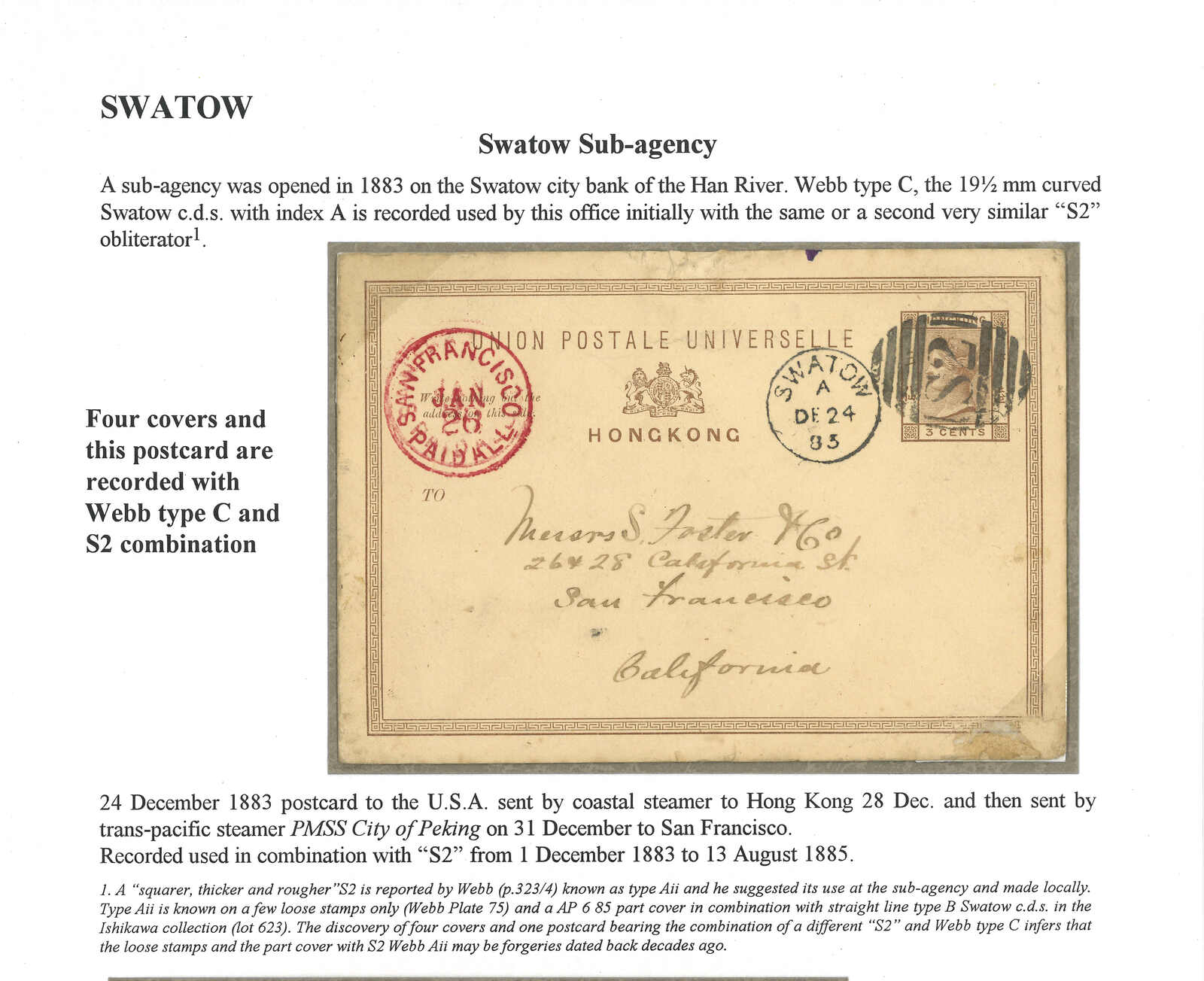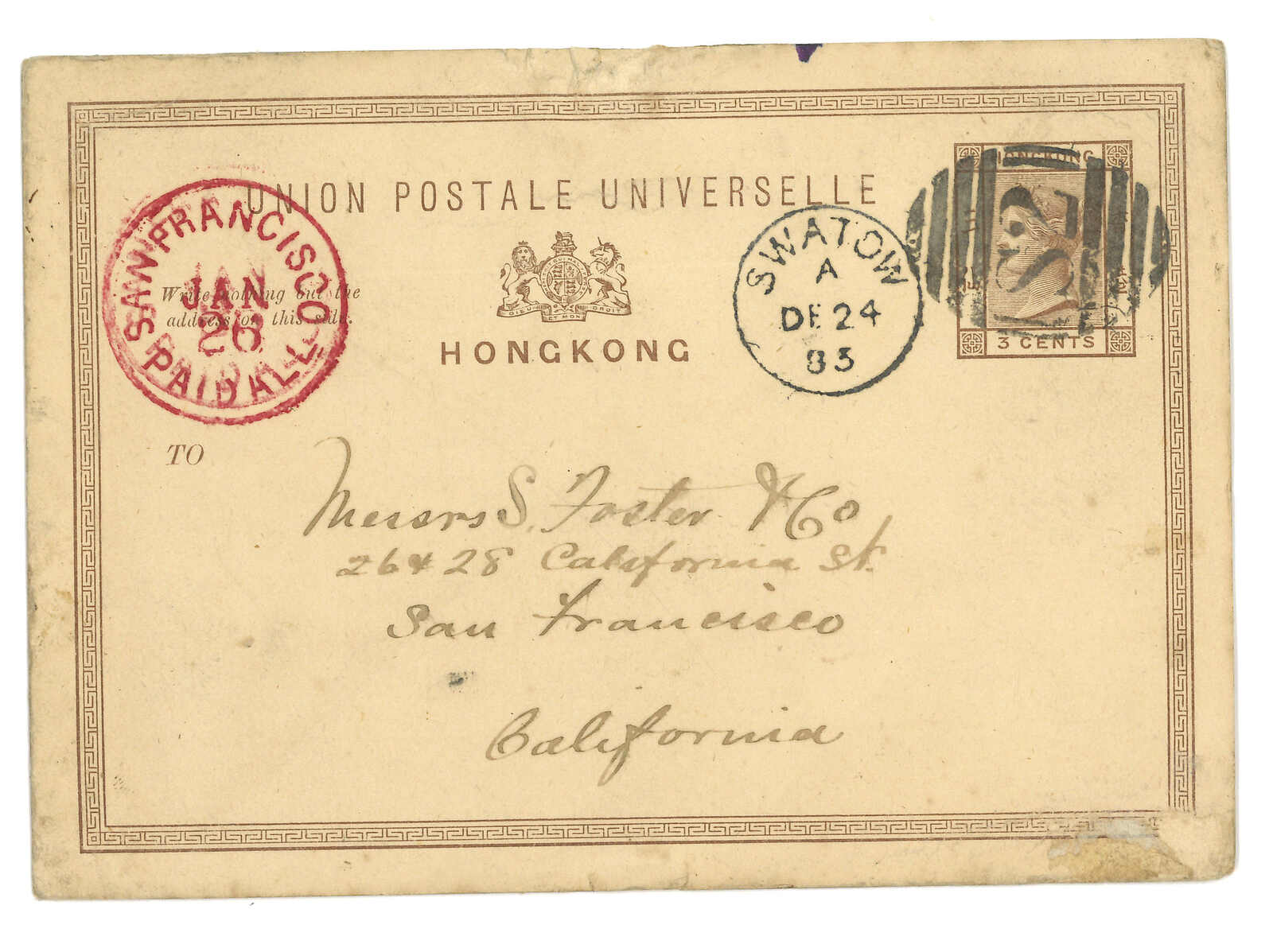 1883 Swatow (24 Dec) to USA. Hong Kong QV 3c PSC,tied by scarce S2 obliterator in black, alongside with Swatow BPO Webb type C cds. Arrived San Francisco (26 Jan). One of the 4 recorded covers and postcards with combination of