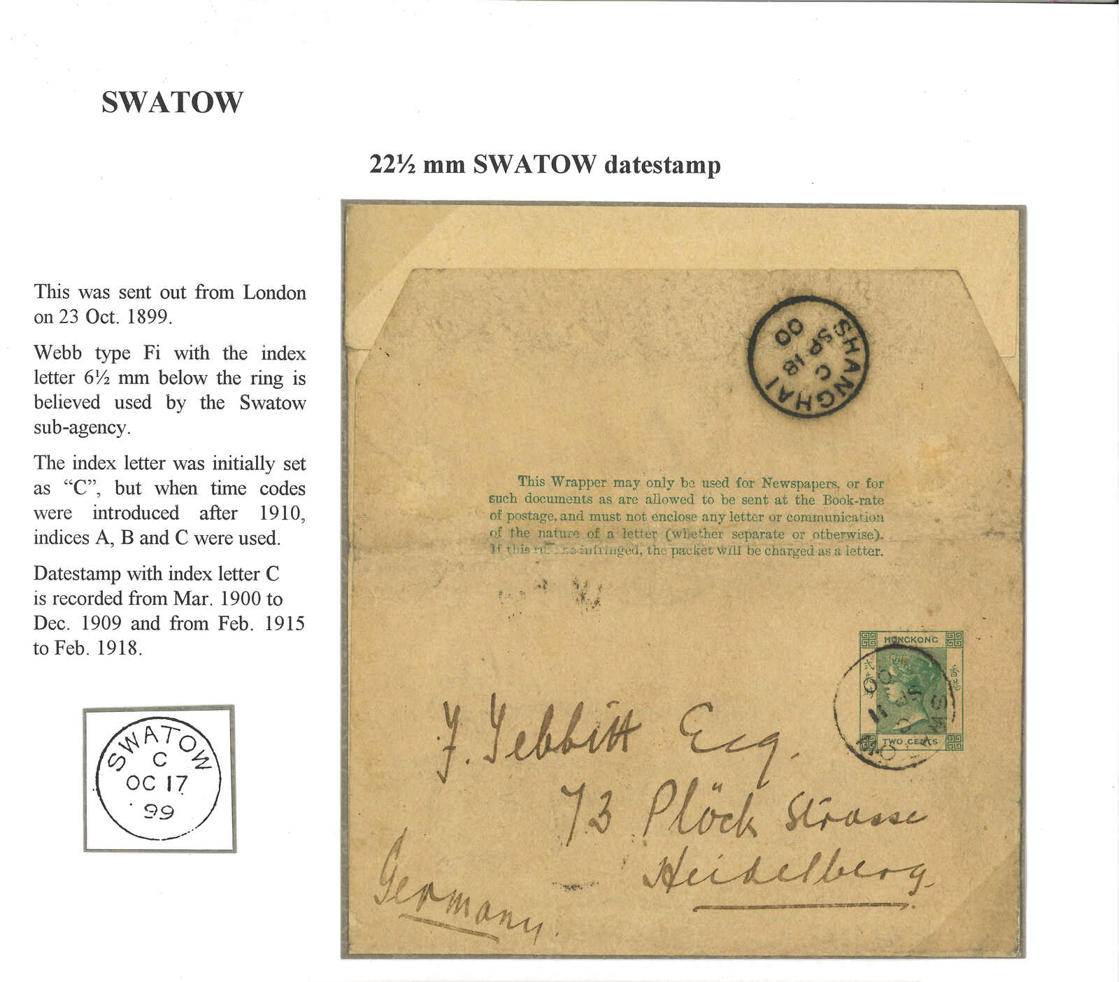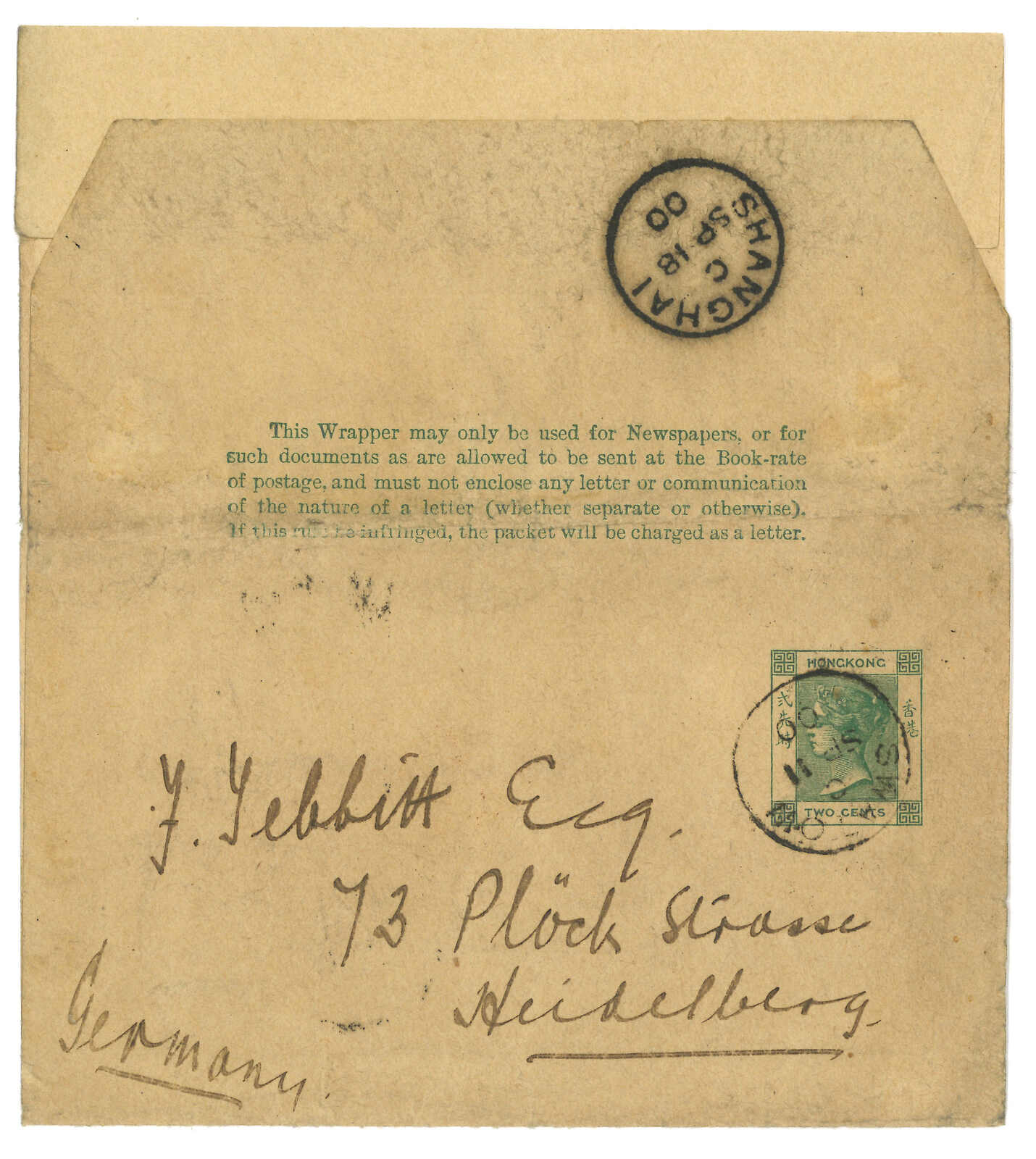 1900 Swatow (11 Sep) to Germany. Hong Kong QV 2c newswrapper (Yang NW1), tied by Swatow BPO Webb type Fi (index C). Transit Shanghai BPO (18 Sep). Rather scarce wrapper example.
