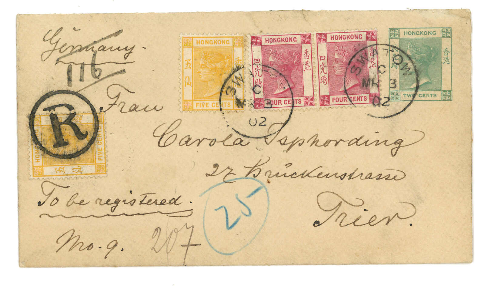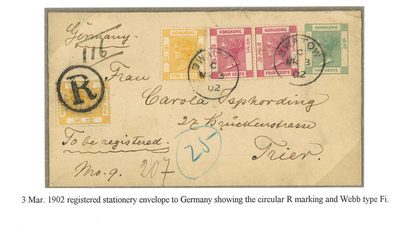 1902.3.3 汕頭寄奧國。香港維多利亞女皇像2仙郵資封,加貼4仙x2 + 5仙x2,合20仙,銷汕頭英局Webb Fi(C字)日戳,旁鈐帶圈R章。經香港。抵維也納。(Image 1)