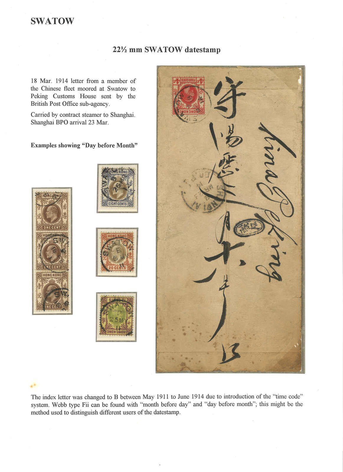 一頁以汕頭英國客郵局Webb Fii型日戳為題之展頁,包含四件香港愛德華七世單枚及連票,以及一件1914.3.18由中國艦 隊成員寄出之信封,均鈐汕頭英局Fii型日戳,並帶“日期居左,月份居右”變異。此戳具有兩款變異,月份和日期位置分別左右對調。(Image 1)