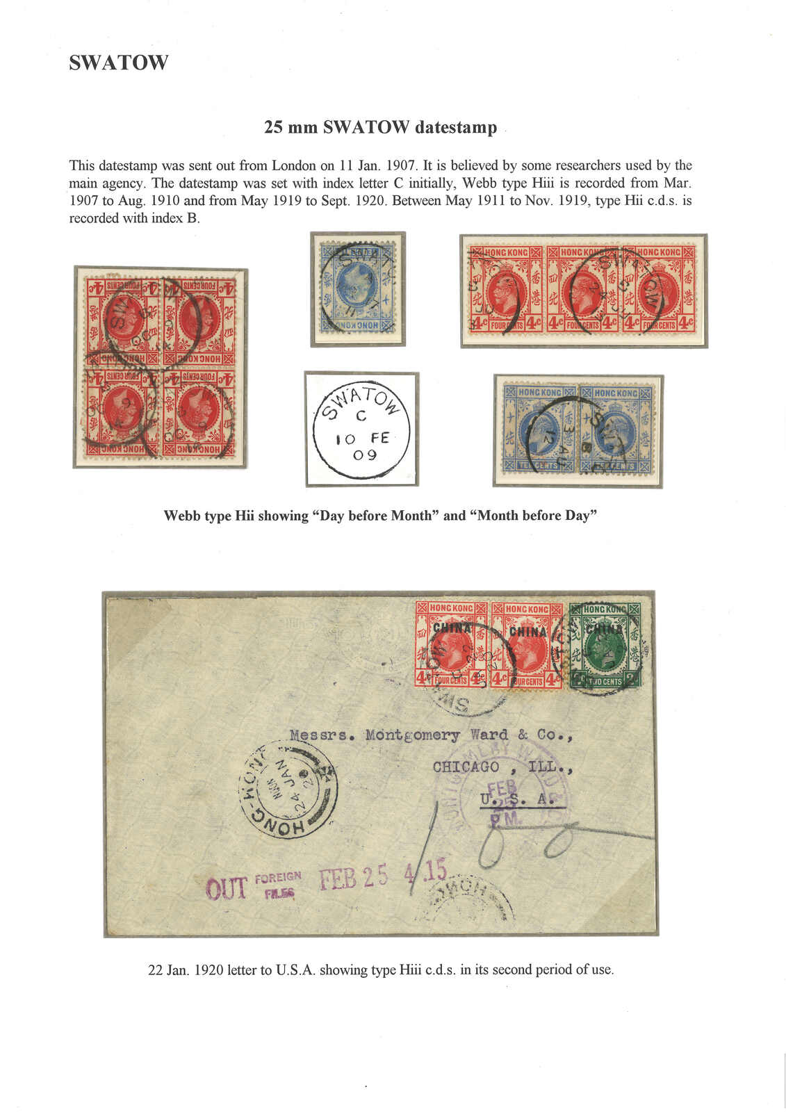 一頁以汕頭英局Webb H型日戳為題之展頁,包含四件香港愛德華七世及佐治五世單枚及連票,以及一件1920.1.22 寄美國封。展示了稀罕少見之Hi型(A字)日戳(Webb記錄中僅見一件)乃至“日期居左,月份居右”的變異例子。(Image 1)