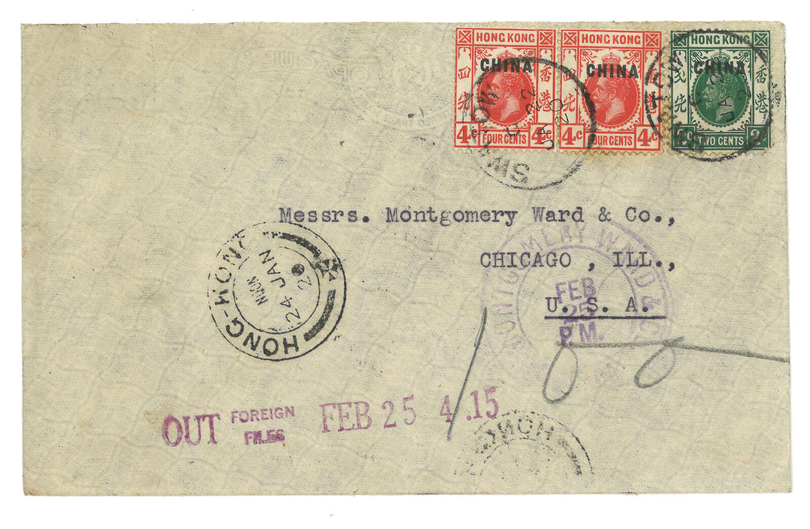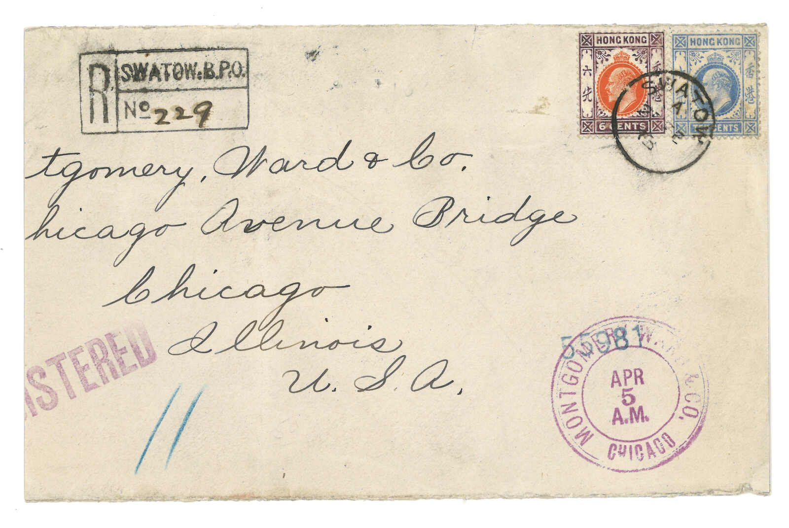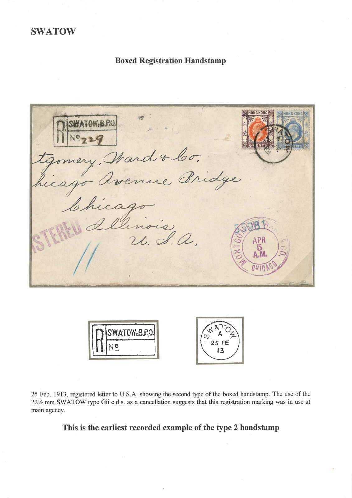1913.2.25 汕頭寄美國。掛號封,貼香港愛德華七世6仙 + 10仙,銷汕頭英局Webb Giii(A字)日戳,旁鈐珍罕之2型“SWATOW B.P.O.”長方形掛號章。2.26經香港。4.4抵芝加哥。此為2型掛號章之最早記錄。(Image 1)