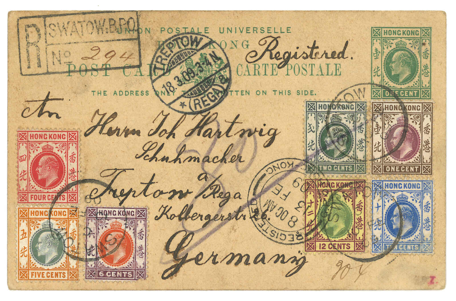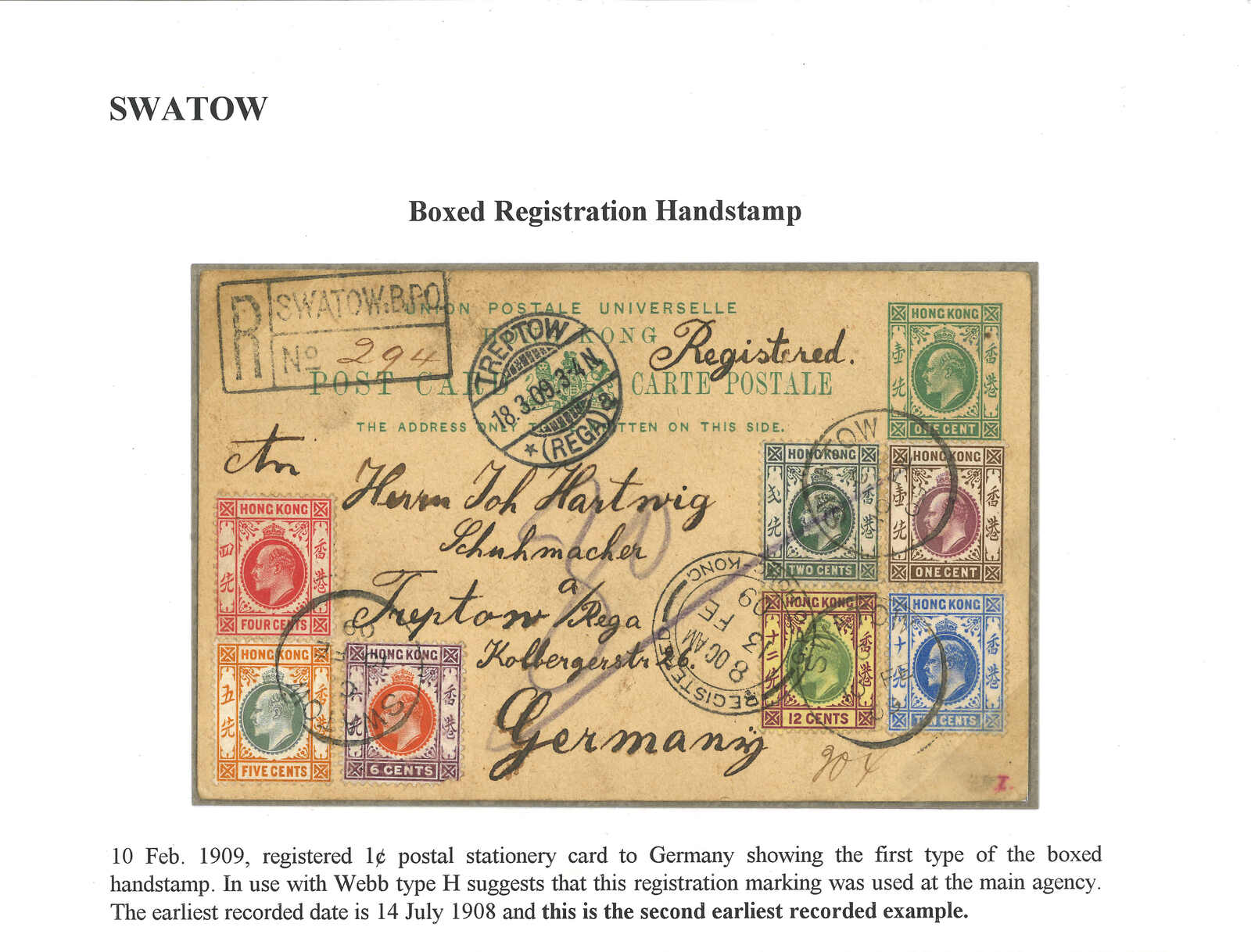 1909.210 汕頭寄德國。香港愛德華七世1仙郵資片,加貼7枚票,合41仙,銷汕頭英局Webb Hiii型(C字)日戳,旁鈐珍罕之1型“SWATOW B.P.O.”長方形掛號章。2.13經香港。3.18抵Treptow。為該款汕頭英局掛號章之第二早記錄。(Image 1)