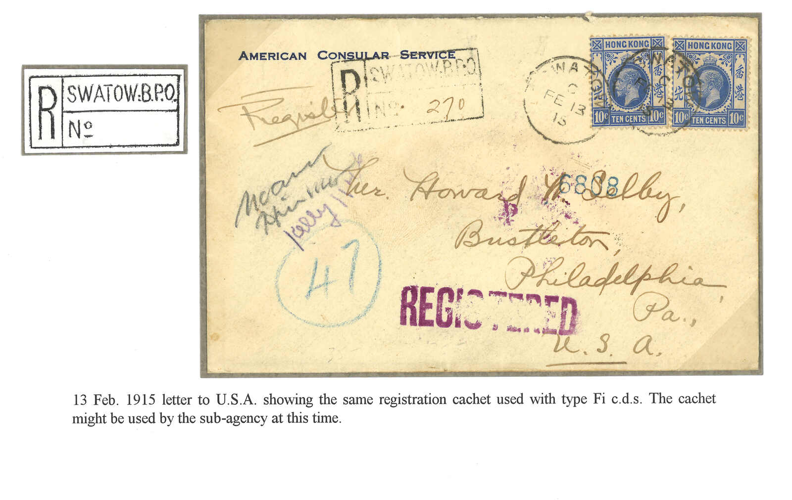 1915.2.13 美國駐福州領事館寄美國。掛號封,貼香港佐治五世10仙x2,銷汕頭英局Webb Fi型日戳,旁鈐珍罕之1型“SWATOW B.P.O.”長方形掛號章。2.15經香港。3.22抵費城。(Image 1)