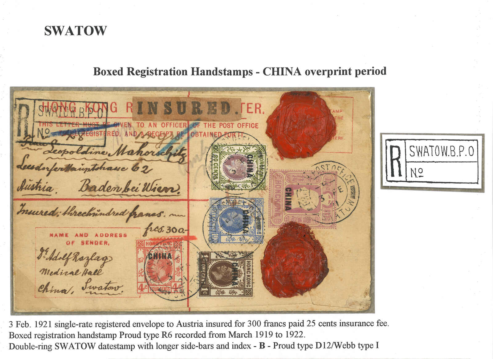 1921.2.3 汕頭寄奧國。香港佐治五世加蓋CHINA 10仙保險掛號郵資封(size G),保額300法郎,加貼1仙 + 4仙 + 10仙 + 20仙,銷汕頭英局Webb I型B字日戳,旁鈐珍罕之Proud R6型“SWATOW