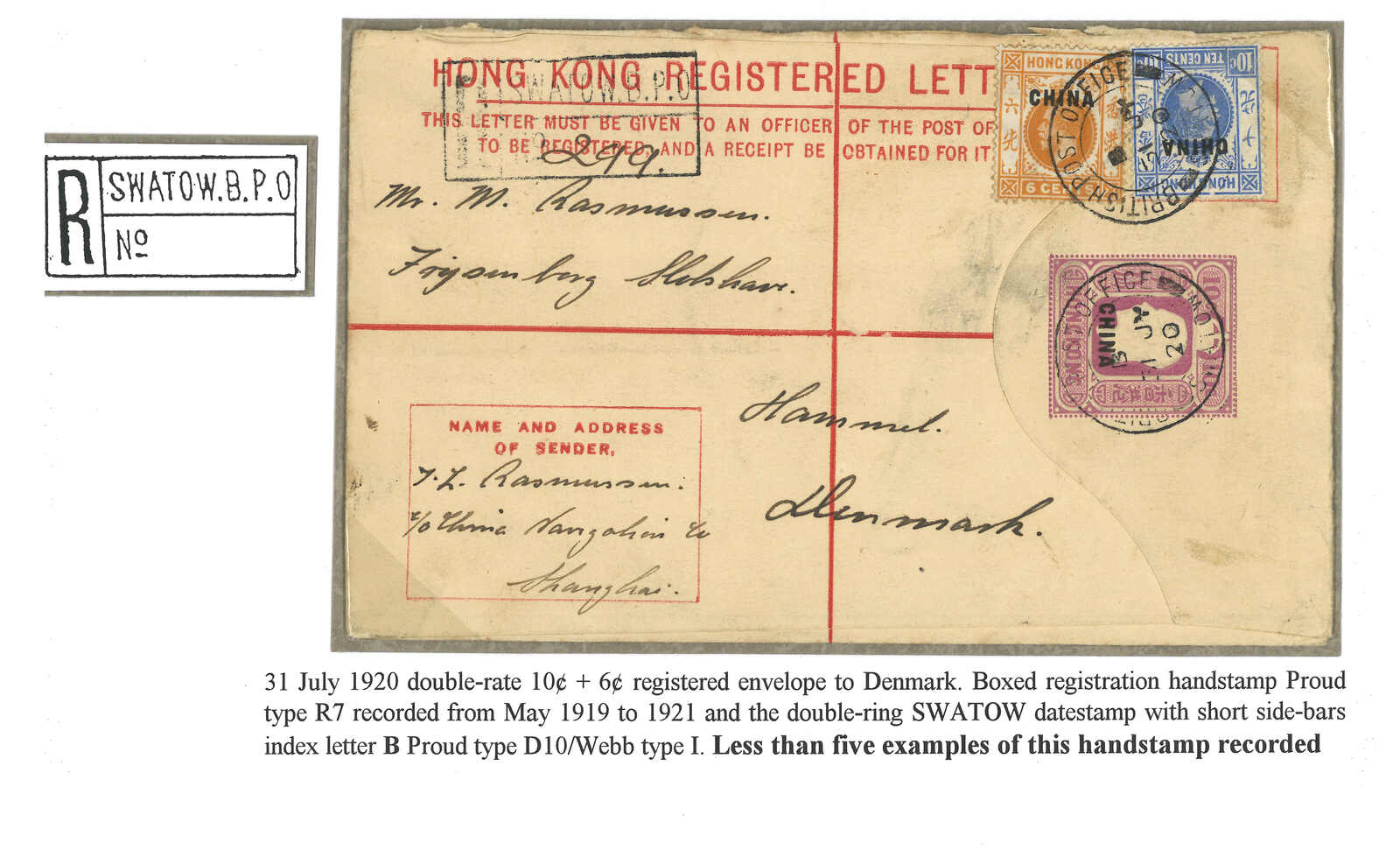 1920.7.31 汕頭寄丹麥。香港佐治五世加蓋CHINA 10仙掛號郵資封(size G),加貼6仙 + 10仙,銷汕頭英局Webb I型B字日戳,旁鈐少見之Proud R7型“SWATOW