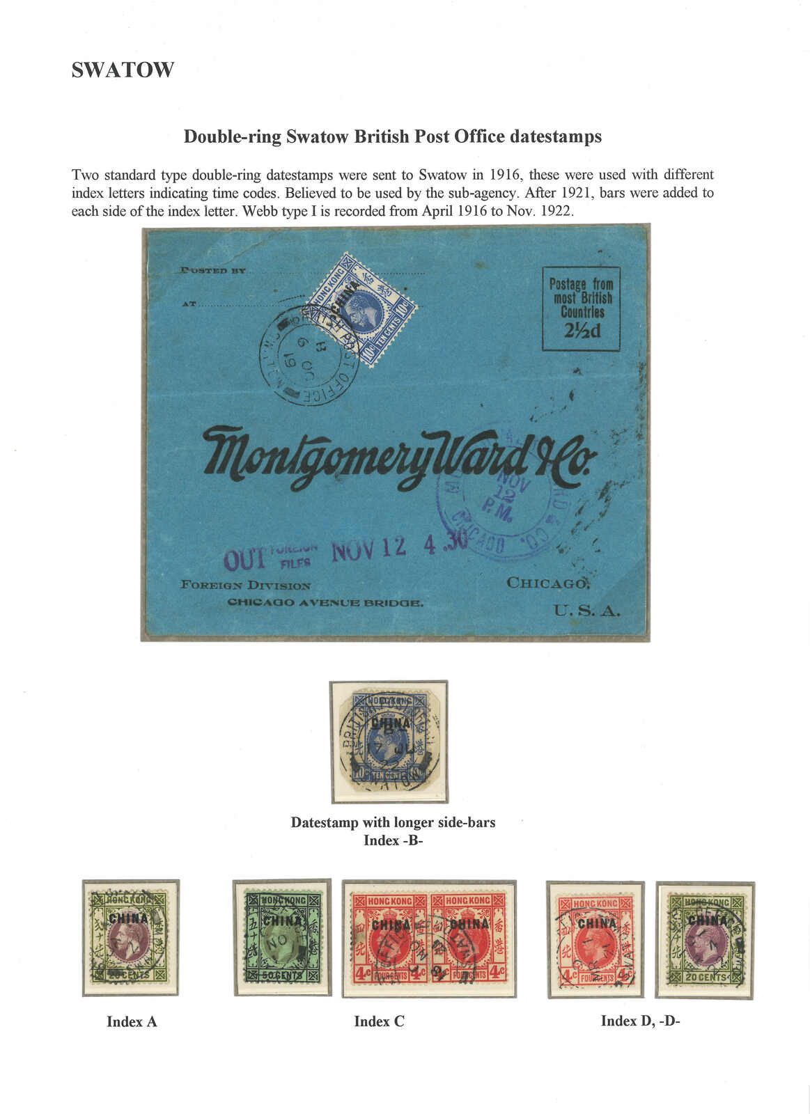 A collection of Swatow BPO Webb type I cds, containing 7 Hong Kong KGV ovpt. CHINA stamps, plus a 1919 (6 Oct) to USA cover, showcasing index A, B, C and D among which Index B is unusual on type I cds.