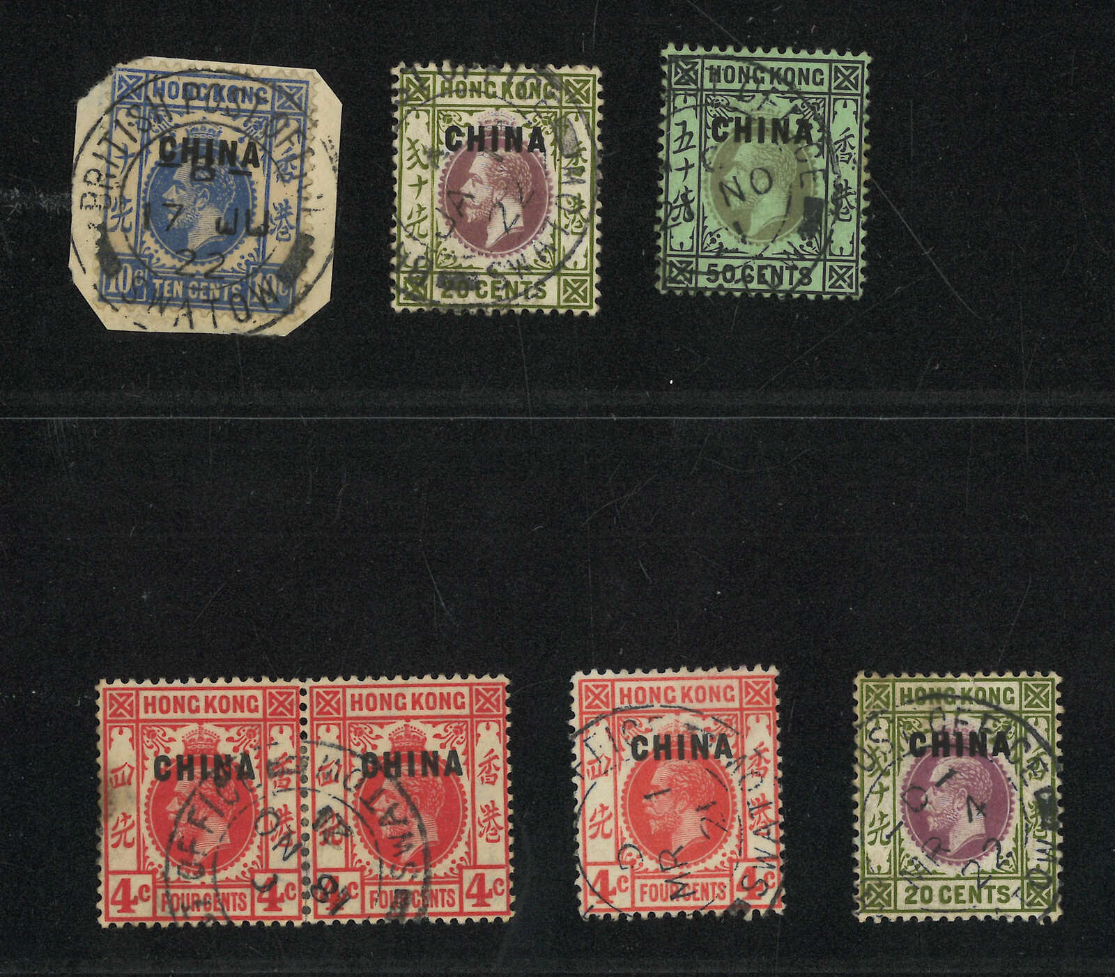 A collection of Swatow BPO Webb type Fii cds, containing 4 Hong Kong KEVII singles and multiples as well as a 1914 (18 Mar) cover from a member of the Chinese fleet, all applied with Swatow BPO Webb type Fii cds with “day