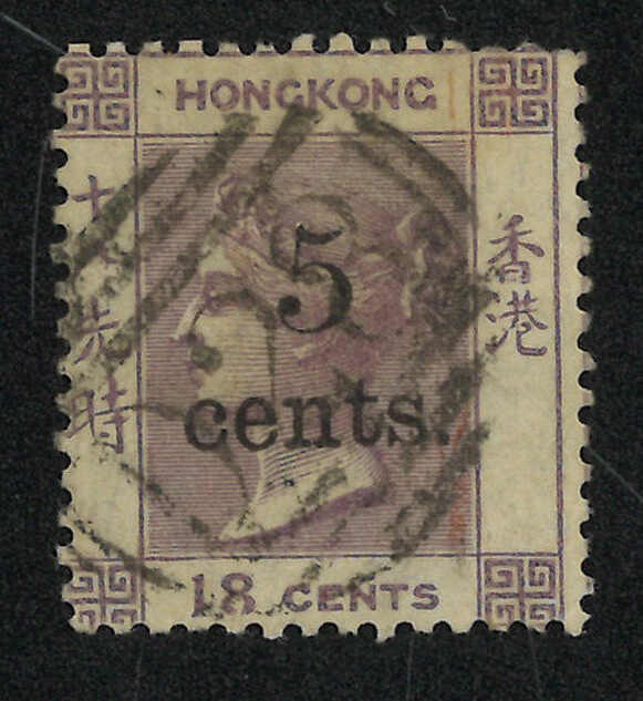 Hong Kong QV surch 5c/18c used stamp, tied by scarce D28 obliterator. D28 obliterator is very scarce and no cover applied with D28 was recorded by Webb which left used stamps the only way to acquire this cancellation.